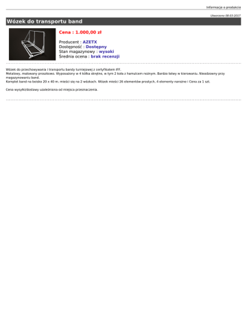 Informacje o produkcie Utworzono 08-03-2017 Wózek do transportu band Cena : 1.000,00 zł Producent : AZETX Dostępność : Dostępny Stan magazynowy : wysoki Średnia ocena : brak recenzji Wózek do przechowywania i transportu bandy turniejowej z certyfikatem IFF. Metalowy, malowany proszkowo. Wyposażony w 4 kółka skrętne, w tym 2 koła z hamulcem nożnym. Bardzo łatwy w kierowaniu. Nieodzowny przy magazynowaniu band. Komplet band na boisko 20 x 40 m. mieści się na 2 wózkach. Wózek mieści 26 elementów prostych, 4 elementy narożne i Cena za 1 szt. Cena wysyłki/dostawy uzależniona od miejsca przeznaczenia.