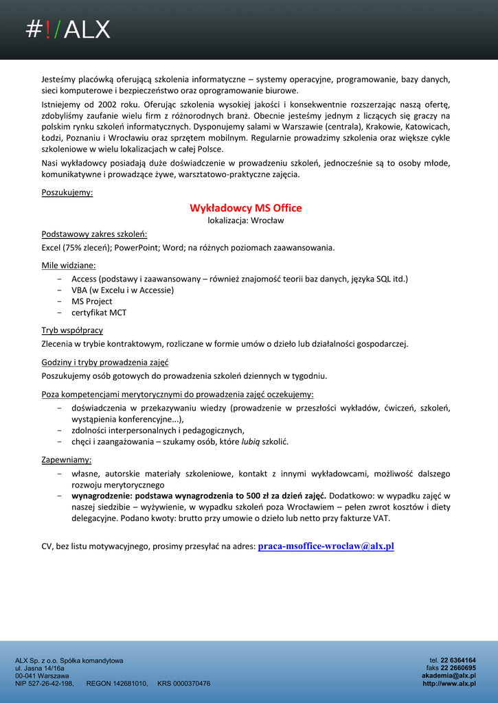 Jesteśmy placówką oferującą szkolenia informatyczne – systemy operacyjne, programowanie, bazy danych, sieci komputerowe i bezpieczeostwo oraz oprogramowanie biurowe. Istniejemy od 2002 roku. Oferując szkolenia wysokiej jakości i konsekwentnie rozszerzając naszą ofertę, zdobyliśmy zaufanie wielu firm z różnorodnych branż. Obecnie jesteśmy jednym z liczących się graczy na polskim rynku szkoleo informatycznych. Dysponujemy salami w Warszawie (centrala), Krakowie, Katowicach, Łodzi, Poznaniu i Wrocławiu oraz sprzętem mobilnym. Regularnie prowadzimy szkolenia oraz większe cykle szkoleniowe w wielu lokalizacjach w całej Polsce. Nasi wykładowcy posiadają duże doświadczenie w prowadzeniu szkoleo, jednocześnie są to osoby młode, komunikatywne i prowadzące żywe, warsztatowo-praktyczne zajęcia. Poszukujemy: Wykładowcy MS Office lokalizacja: Wrocław Podstawowy zakres szkoleo: Excel (75% zleceo); PowerPoint; Word; na różnych poziomach zaawansowania. Mile widziane: - Access (podstawy i zaawansowany – również znajomośd teorii baz danych, języka SQL itd.) - VBA (w Excelu i w Accessie) - MS Project - certyfikat MCT Tryb współpracy Zlecenia w trybie kontraktowym, rozliczane w formie umów o dzieło lub działalności gospodarczej. Godziny i tryby prowadzenia zajęd Poszukujemy osób gotowych do prowadzenia szkoleo dziennych w tygodniu. Poza kompetencjami merytorycznymi do prowadzenia zajęd oczekujemy: - doświadczenia w przekazywaniu wiedzy (prowadzenie w przeszłości wykładów, dwiczeo, szkoleo, wystąpienia konferencyjne...), - zdolności interpersonalnych i pedagogicznych, - chęci i zaangażowania – szukamy osób, które lubią szkolid. Zapewniamy: - własne, autorskie materiały szkoleniowe, kontakt z innymi wykładowcami, możliwośd dalszego rozwoju merytorycznego - wynagrodzenie: podstawa wynagrodzenia to 500 zł za dzień zajęć. Dodatkowo: w wypadku zajęd w naszej siedzibie – wyżywienie, w wypadku szkoleo poza Wrocławiem – pełen zwrot kosztów i diety delegacyjne. Podano kwoty: brutto przy umowie o dzieło lub netto przy fakturze VAT. CV, bez listu motywacyjnego, prosimy przesyład na adres: [email protected] ALX Sp. z o.o. Spółka komandytowa ul. Jasna 14/16a 00-041 Warszawa NIP 527-26-42-198, REGON 142681010, KRS 0000370476 tel. 22 6364164 faks 22 2660695 [email protected] http://www.alx.pl