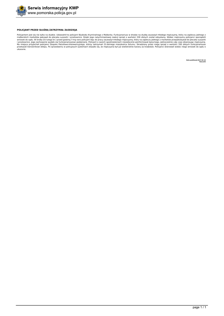 Serwis informacyjny KWP www.pomorska.policja.gov.pl POLICJANT PRZED SŁUŻBĄ ZATRZYMAŁ ZŁODZIEJA Policjantem jest się nie tylko na służbie. Udowodnił to policjant Wydziału Kryminalnego z Malborka. Funkcjonariusz w drodze na służbę zauważył młodego mężczyznę, który na zapleczu jednego z malborskich marketów pakował do plecaka suszarki i prostownice. Dzięki jego natychmiastowej reakcji sprzęt o wartości 330 złotych został odzyskany. Wobec mężczyzny policjanci sporządzili wniosek do sądu. W środę (15 lutego br.) przed godziną 7-mą rano policjant idąc do pracy zauważył młodego mężczyznę, który na zapleczu jednego z marketów przepakowywał do plecaka suszarki i prostownice. Jego zachowanie wydało się funkcjonariuszowi podejrzane. Policjant o swoich spostrzeżeniach niezwłocznie poinformował dyżurnego, jednocześnie cały czas obserwując mężczyznę. Na miejsce przyjechali policjanci Zespołu Patrolowo-Interwencyjnego, którzy zatrzymali 21-letniego mieszkańca Sztumu. Skradziony przez niego sprzęt o wartości 330 złotych funkcjonariusze przekazali kierownikowi sklepu. Po sprawdzeniu w policyjnych systemach okazało się, że mężczyzna był już wielokrotnie karany za kradzieże. Policjanci skierowali wobec niego wniosek do sądu o ukaranie. Data publikacji:2017-02-15 Rzecznik page 1 / 1 Powered by TCPDF (www.tcpdf.org)