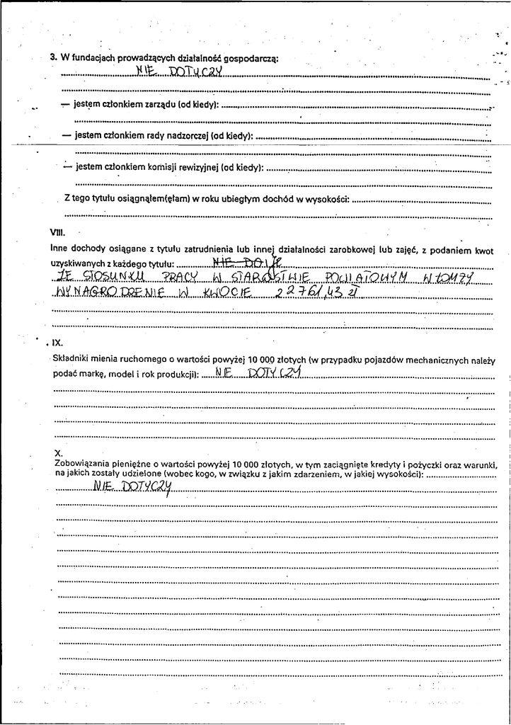 3. W fundacjach prowadzqcych dziatalno“ gospodarczq: ttraT4 jestem cztonkiem zarzqdu (od kiedy): — jestem cztonkiem rady nadzorczej lod kiedy): jestem cztOnkiem kornisji rewizyjnej Cod kiedy): Z tego tytutu osiqgnqtem(etam)w roku ubiegtym doched w wysokoaci: VIII. Inne dochody osiqgane z tytutu zatrudnienia lub inne • dziatalnoaci zarobkowej lub zajea, z podaniem kwot uzyskiwanych z kaidego tytutu: 14 t "1(7S idt luvit ?RICE 141 5.11c1 Parli eiTO '1 At 14 tor ay T"' Pre-R0 .2 a 3 - 4.13 • IX. Sktadniki mienia ruchomego o wartoaci powyiej 10 000 ztotych (w przypadku pojazdow mechanicznych naleiy podad marl% model i rok produkcji) . E Dory (24 X. Zobowiezania pienigine o wartoki powyiej 10 000 ztotych, w tym zaciagniete kredyty i poiyczki oraz warunki, na jakich zostaty udzielone (wobec kogo, w zwiazku z jakim zdarzeniem, w jakiej wysokoki): IVE tOTYGW,1