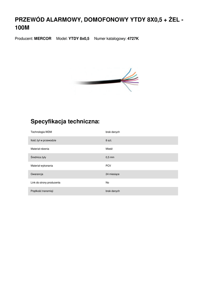 PRZEWÓD ALARMOWY, DOMOFONOWY YTDY 8X0,5 + ŻEL 100M Producent: MERCOR Model: YTDY 8x0,5 Numer katalogowy: 4727K Specyfikacja techniczna: Technologia WDM brak danych Ilość żył w przewodzie 8 szt. Materiał rdzenia Miedź Średnica żyły 0,5 mm Materiał wykonania PCV Gwarancja 24 miesiące Link do strony producenta No Prędkość transmisji brak danych