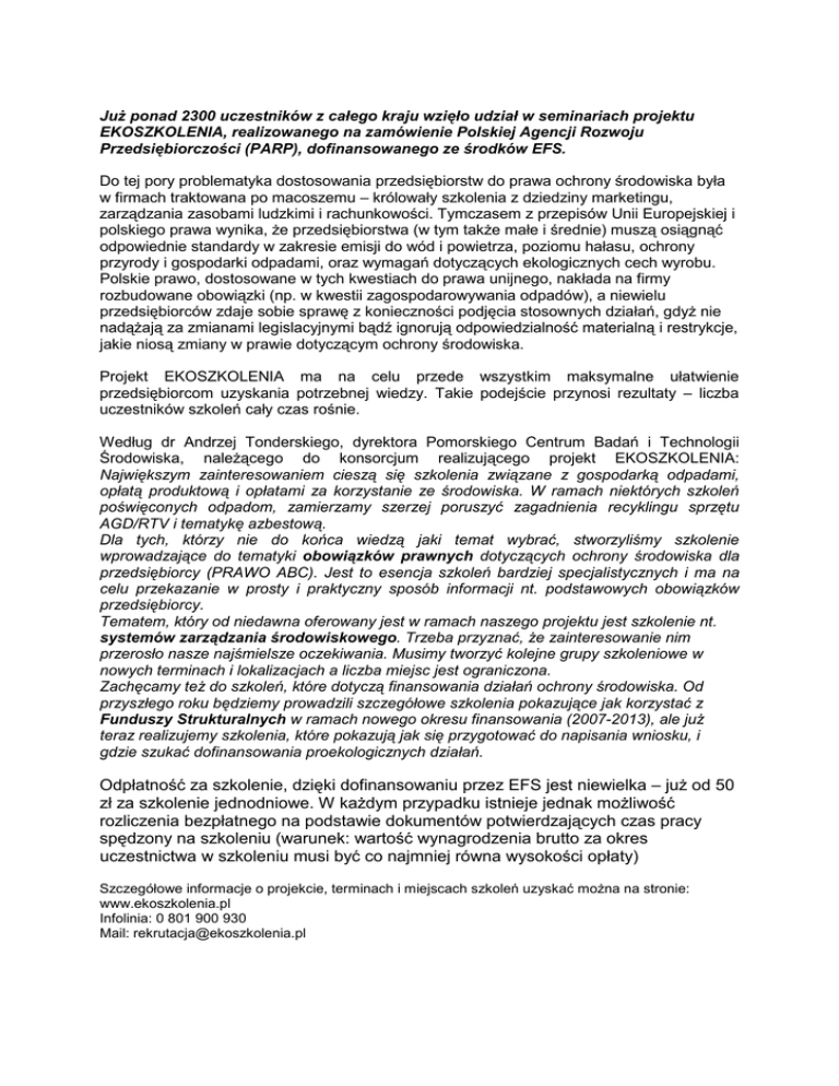 JuŜ ponad 2300 uczestników z całego kraju wzięło udział w seminariach projektu EKOSZKOLENIA, realizowanego na zamówienie Polskiej Agencji Rozwoju Przedsiębiorczości (PARP), dofinansowanego ze środków EFS. Do tej pory problematyka dostosowania przedsiębiorstw do prawa ochrony środowiska była w firmach traktowana po macoszemu – królowały szkolenia z dziedziny marketingu, zarządzania zasobami ludzkimi i rachunkowości. Tymczasem z przepisów Unii Europejskiej i polskiego prawa wynika, Ŝe przedsiębiorstwa (w tym takŜe małe i średnie) muszą osiągnąć odpowiednie standardy w zakresie emisji do wód i powietrza, poziomu hałasu, ochrony przyrody i gospodarki odpadami, oraz wymagań dotyczących ekologicznych cech wyrobu. Polskie prawo, dostosowane w tych kwestiach do prawa unijnego, nakłada na firmy rozbudowane obowiązki (np. w kwestii zagospodarowywania odpadów), a niewielu przedsiębiorców zdaje sobie sprawę z konieczności podjęcia stosownych działań, gdyŜ nie nadąŜają za zmianami legislacyjnymi bądź ignorują odpowiedzialność materialną i restrykcje, jakie niosą zmiany w prawie dotyczącym ochrony środowiska. Projekt EKOSZKOLENIA ma na celu przede wszystkim maksymalne ułatwienie przedsiębiorcom uzyskania potrzebnej wiedzy. Takie podejście przynosi rezultaty – liczba uczestników szkoleń cały czas rośnie. Według dr Andrzej Tonderskiego, dyrektora Pomorskiego Centrum Badań i Technologii Środowiska, naleŜącego do konsorcjum realizującego projekt EKOSZKOLENIA: Największym zainteresowaniem cieszą się szkolenia związane z gospodarką odpadami, opłatą produktową i opłatami za korzystanie ze środowiska. W ramach niektórych szkoleń poświęconych odpadom, zamierzamy szerzej poruszyć zagadnienia recyklingu sprzętu AGD/RTV i tematykę azbestową. Dla tych, którzy nie do końca wiedzą jaki temat wybrać, stworzyliśmy szkolenie wprowadzające do tematyki obowiązków prawnych dotyczących ochrony środowiska dla przedsiębiorcy (PRAWO ABC). Jest to esencja szkoleń bardziej specjalistycznych i ma na celu przekazanie w prosty i praktyczny sposób informacji nt. podstawowych obowiązków przedsiębiorcy. Tematem, który od niedawna oferowany jest w ramach naszego projektu jest szkolenie nt. systemów zarządzania środowiskowego. Trzeba przyznać, Ŝe zainteresowanie nim przerosło nasze najśmielsze oczekiwania. Musimy tworzyć kolejne grupy szkoleniowe w nowych terminach i lokalizacjach a liczba miejsc jest ograniczona. Zachęcamy teŜ do szkoleń, które dotyczą finansowania działań ochrony środowiska. Od przyszłego roku będziemy prowadzili szczegółowe szkolenia pokazujące jak korzystać z Funduszy Strukturalnych w ramach nowego okresu finansowania (2007-2013), ale juŜ teraz realizujemy szkolenia, które pokazują jak się przygotować do napisania wniosku, i gdzie szukać dofinansowania proekologicznych działań. Odpłatność za szkolenie, dzięki dofinansowaniu przez EFS jest niewielka – juŜ od 50 zł za szkolenie jednodniowe. W kaŜdym przypadku istnieje jednak moŜliwość rozliczenia bezpłatnego na podstawie dokumentów potwierdzających czas pracy spędzony na szkoleniu (warunek: wartość wynagrodzenia brutto za okres uczestnictwa w szkoleniu musi być co najmniej równa wysokości opłaty) Szczegółowe informacje o projekcie, terminach i miejscach szkoleń uzyskać moŜna na stronie: www.ekoszkolenia.pl Infolinia: 0 801 900 930 Mail: [email protected]