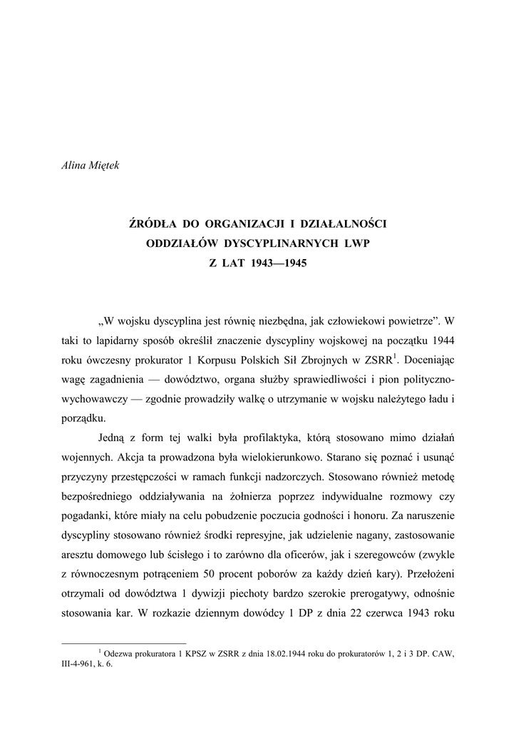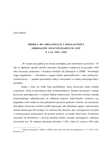 Alina Miętek ŹRÓDŁA DO ORGANIZACJI I DZIAŁALNOŚCI ODDZIAŁÓW DYSCYPLINARNYCH LWP Z LAT 1943—1945 „W wojsku dyscyplina jest równię niezbędna, jak człowiekowi powietrze”. W taki to lapidarny sposób określił znaczenie dyscypliny wojskowej na początku 1944 roku ówczesny prokurator 1 Korpusu Polskich Sił Zbrojnych w ZSRR1. Doceniając wagę zagadnienia — dowództwo, organa służby sprawiedliwości i pion politycznowychowawczy — zgodnie prowadziły walkę o utrzymanie w wojsku należytego ładu i porządku. Jedną z form tej walki była profilaktyka, którą stosowano mimo działań wojennych. Akcja ta prowadzona była wielokierunkowo. Starano się poznać i usunąć przyczyny przestępczości w ramach funkcji nadzorczych. Stosowano również metodę bezpośredniego oddziaływania na żołnierza poprzez indywidualne rozmowy czy pogadanki, które miały na celu pobudzenie poczucia godności i honoru. Za naruszenie dyscypliny stosowano również środki represyjne, jak udzielenie nagany, zastosowanie aresztu domowego lub ścisłego i to zarówno dla oficerów, jak i szeregowców (zwykle z równoczesnym potrąceniem 50 procent poborów za każdy dzień kary). Przełożeni otrzymali od dowództwa 1 dywizji piechoty bardzo szerokie prerogatywy, odnośnie stosowania kar. W rozkazie dziennym dowódcy 1 DP z dnia 22 czerwca 1943 roku 1 Odezwa prokuratora 1 KPSZ w ZSRR z dnia 18.02.1944 roku do prokuratorów 1, 2 i 3 DP. CAW, III-4-961, k. 6. czytamy: „Wobec [...] wypadku złej interpretacji przepisów służbowych wyjaśniam i podaję do zastosowania: Każdy przełożony ma prawo i obowiązek dopilnowania, by przepisy wojskowe nie były naruszane. Wobec naruszających dyscyplinę i przepisy wojskowe muszą być zastosowane wszystkie środki, aż do użycia broni włącznie, by wymusić posłuch i wykonanie rozkazu. Każdemu przełożonemu przysługuje wobec tego prawo aresztowania podwładnego bez względu na jego stopień, jeśli wymagają tego względy dyscypliny”2. Następną formą walki o utrzymanie dyscypliny wojskowej — było kierowanie winnych czynów przestępczych do oddziałów dyscyplinarnych, które utworzono w sierpniu 1943 roku3, na wzór istniejących w Armii Czerwonej batalionów karnych. Żołnierze — kierowani wyrokiem Wojskowego Sądu Polowego 1 DP do oddziału karnego na pierwszą linię frontu — orzeczoną wyrokiem karę mieli jednak odbywać po zakończeniu działań wojennych4. Szczegółowe zasady odbywania kary w oddziałach karnych, tryb kierowania do nich żołnierzy, wreszcie warunki, rehabilitacji w boju oraz awanse i przedterminowe zwolnienia omawiał „Statut kompanii karnej”, wprowadzony w życie przez dowództwo 1 Korpusu Polskich Sił Zbrojnych w ZSRR rozkazem specjalnym nr 3 w dniu 20 stycznia 1944 roku5. Na mocy tego statutu do oddziału dyscyplinarnego mogli być skierowani tylko żołnierze w stopniu szeregowca, lub do tegoż stopnia zdegradowani oficerowie i podoficerowie, którzy popełnili przestępstwa, przewidziane przez Kodeks Polskich Sił Zbrojnych w ZSRR z roku 1943. Skierowanie odbywać się mogło bądź na podstawie prawomocnego wyroku sądu polowego, bądź rozkazem dowódcy dywizji i brygady — w drodze dyscyplinarnej. Początkowo jednak nie wszystkie oddziały dyscyplinarne LWP spełniały rolę wychowawczą, zgodną z założeniami regulaminowymi. W raporcie prokuratora 1 KPSZ w ZSRR do gen. Berlinga z lutego 1944 roku czytamy: „Skazani na skierowanie do kompanii karnej zasadniczo winni być posyłani 2 CAW, III-7-488, k. 32. Rozkaz dzienny 1 DP nr 60 z dnia 7.08.1943 roku o naznaczeniu dowódcy kompanii karnej dywizji. Tamże, k. 17. Innego rozkazu — w tej sprawie — w zbiorach CAW nie odnaleziono. 4 Por. rozkaz dzienny dowódcy 1 DP nr 75 z dnia 24.08.1943 roku. CAW, III-7-488, k. 1. 5 Oryginał tego rozkazu sporządzony jest odręcznie, posiada naniesione poprawki i sygnowany jest przez gen. bryg. Z. Berlinga i płka B. Kieniewicza. Por. CAW, III-3-103, s. 10—12. 3 na najbardziej niebezpieczne odcinki frontu, względnie do zwiadu, by móc w ten sposób krwią odkupić swą winę wobec Polski i polskiego narodu. W rzeczywistości jednak kompania karna korpusu nie odpowiada swemu przeznaczeniu i nie realizuje stojących przed nią celów. Osądzeni na pobyt w kompanii karnej żyją w warunkach bardzo wygodnych — w domach kołchoźników; w walce z niemieckimi zaborcami udziału nie biorą — żadnych ofiar nie ponoszą — co działa demoralizująco na całą kompanię karną, jak i na otoczenie”. W dalszej części raportu znajdujemy stwierdzenie, że cel wychowawczy spełniają jedynie kompanie karne, znajdujące się na zachodnim froncie6. Korpus tymczasem rozrósł się liczebnie, życie zmusiło więc do opracowania nowego regulaminu, dostosowanego do nowych potrzeb Wojska Polskiego. W związku z tym w ślad za omówionym, najwidoczniej merytorycznie niedopracowanym statutem7, dość szybko pojawia się nowy statut pod nazwą „Regulamin Oddziału Karnego 1 Korpusu Polskich Sił Zbrojnych w ZSRR”8. W Centralnym Archiwum Wojskowym nie odnaleziono oryginału tego dokumentu, dostępne zaś maszynowe kopie pozbawione są daty. Powstanie regulaminu ustalić można w przybliżeniu na miesiąc marzec lub kwiecień 1944 roku9. Dokument ten regulował stronę organizacyjną oddziałów dyscyplinarnych LWP. Między innymi dowiaduje się badacz z niego (§ 26), że istniejąca kompania karna została zmieniona no Oddział Karny 1 Korpusu Polskich Sił Zbrojnych w ZSRR. Oddział ten został zaliczony do samodzielnych jednostek WP, podległych bezpośrednio dowódcy oraz nadzorowi prokuratora 1 KPSZ w ZSRR. W skład sformowanego oddziału wchodziły dwie kompanie, każda po trzy plutony. Regulamin precyzował również wychowawczą funkcję i cel istnienia tego rodzaju oddziału, a więc: umożliwienie żołnierzom, którzy dokonali przestępstw, albo wykroczeń dyscyplinarnych — rehabilitacji i 