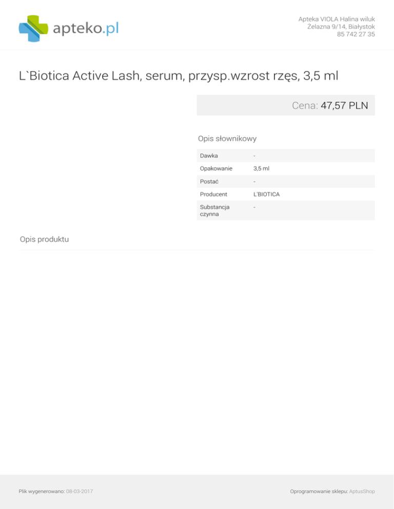 Apteka VIOLA Halina wiluk Żelazna 9/14, Białystok 85 742 27 35 L`Biotica Active Lash, serum, przysp.wzrost rzęs, 3,5 ml Cena: 47,57 PLN Opis słownikowy Dawka - Opakowanie 3,5 ml Postać - Producent L'BIOTICA Substancja czynna - Opis produktu Plik wygenerowano: 08-03-2017 Powered by TCPDF (www.tcpdf.org) Oprogramowanie sklepu: AptusShop