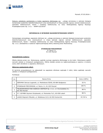 Poznań, 07.03.2016 r. Dotyczy udzielenia zamówienia w trybie zapytania ofertowego na: „usługę serwisową w zakresie bieżącej konserwacji systemów teleinformatycznych oraz ewentualnych w miarę potrzeb napraw centrali telefonicznych, aparatów telefonicznych, faxów i instalacji telefonicznej na rzecz Wielkopolskiej Agencji Rozwoju Przedsiębiorczości Sp. z o.o. – WARP-4/Z/2016” INFORMACJA O WYBORZE NAJKORZYSTNIEJSZEJ OFERTY Zamawiający prowadzący zapytanie ofertowe na: „usługę serwisową w zakresie bieżącej konserwacji systemów teleinformatycznych oraz ewentualnych w miarę potrzeb napraw centrali telefonicznych, aparatów telefonicznych, faxów i instalacji telefonicznej na rzecz Wielkopolskiej Agencji Rozwoju Przedsiębiorczości Sp. z o.o. zawiadamia o wyborze najkorzystniejszej oferty złożonej przez Wykonawcę: STANISŁAW PIECHOWIAK ul. Panny 11 61-245 Poznań Uzasadnienie wyboru: Oferta złożona przez ww. Wykonawcę, spełniła wymogi zapytania ofertowego co do treści. Wykonawca spełnił warunki udziału w niniejszym postępowaniu. Oferta została uznana za najkorzystniejszą w oparciu o kryteria oceny ofert określone w zapytaniu ofertowym. Zbiorcze zestawienie ofert: W terminie przewidzianym na odpowiedź na zapytanie ofertowe wpłynęło 5 ofert, które spełniały warunki udziału w niniejszym postępowaniu. Punktacja: L.p. Nazwa firmy Cena (100%) 1 SERVMAX Dariusz Ługowski, ul. Modrakowa 50/65, 85-864 Bydgoszcz 55 % 2 STANISŁAW PIECHOWIAK, ul. Panny 11, 61-245 Poznań 3 TELEKOMUNIKACYJNA AGENCJA CENTRUM Sp. z o.o., ul. Grunwaldzka 21, 60-783 Poznań 88 % 4 P.T. SZYMEX Szymon Grzybowski, ul. Pomorska 7c/1, 62-030 Luboń 88 % 5 LUKAS Wojciech Mikulski, ul. Widokowa 21/2, 62-052 Komorniki 100 % 97,78 %