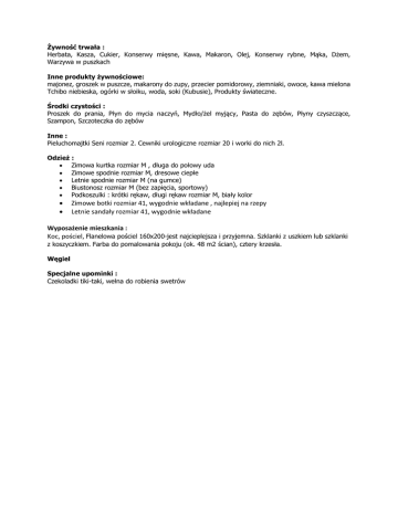 Żywność trwała : Herbata, Kasza, Cukier, Konserwy mięsne, Kawa, Makaron, Olej, Konserwy rybne, Mąka, Dżem, Warzywa w puszkach Inne produkty żywnościowe: majonez, groszek w puszcze, makarony do zupy, przecier pomidorowy, ziemniaki, owoce, kawa mielona Tchibo niebieska, ogórki w słoiku, woda, soki (Kubusie), Produkty świateczne. Środki czystości : Proszek do prania, Płyn do mycia naczyń, Mydło/żel myjący, Pasta do zębów, Płyny czyszczące, Szampon, Szczoteczka do zębów Inne : Pieluchomajtki Seni rozmiar 2. Cewniki urologiczne rozmiar 20 i worki do nich 2l. Odzież : Zimowa kurtka rozmiar M , długa do połowy uda Zimowe spodnie rozmiar M, dresowe ciepłe Letnie spodnie rozmiar M (na gumce) Biustonosz rozmiar M (bez zapięcia, sportowy) Podkoszulki : krótki rękaw, długi rękaw rozmiar M, biały kolor Zimowe botki rozmiar 41, wygodnie wkładane , najlepiej na rzepy Letnie sandały rozmiar 41, wygodnie wkładane Wyposażenie mieszkania : Koc, pościel, Flanelowa pościel 160x200-jest najcieplejsza i przyjemna. Szklanki z uszkiem lub szklanki z koszyczkiem. Farba do pomalowania pokoju (ok. 48 m2 ścian), cztery krzesła. Węgiel Specjalne upominki : Czekoladki tiki-taki, wełna do robienia swetrów