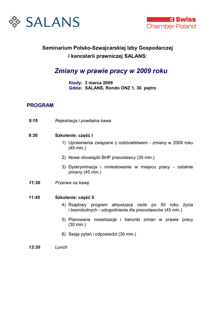 Seminarium Polsko-Szwajcarskiej Izby Gospodarczej i kancelarii prawniczej SALANS: Zmiany w prawie pracy w 2009 roku Kiedy: 3 marca 2009 Gdzie: SALANS, Rondo ONZ 1, 30. piętro PROGRAM 9:15 Rejestracja i powitalna kawa 9:30 Szkolenie: część I 1) Uprawnienia związane z rodzicielstwem - zmiany w 2009 roku (45 min.) 2) Nowe obowiązki BHP pracodawcy (30 min.) 3) Dyskryminacja i molestowanie w miejscu pracy - ostatnie zmiany (45 min.) 11:30 Przerwa na kawę 11:45 Szkolenie: część II 4) Rządowy program aktywizacji osób po 50 roku Ŝycia i bezrobotnych - udogodnienia dla pracodawców (45 min.) 5) Planowane nowelizacje i kierunki zmian w prawie pracy (30 min.) 6) Sesja pytań i odpowiedzi (30 min.) 13:30 Lunch Warsaw 5035873.1 PRELEGENCI Aleksandra Minkowicz-Flanek, radca prawny, counsel. Stoi na czele praktyki prawa pracy w warszawskim biurze kancelarii prawniczej Salans. Specjalizuje się w prawie pracy, w tym w zakresie: umów o pracę, kontraktów menadŜerskich, umów o zakazie działalności konkurencyjnej w czasie trwania i po wygaśnięciu stosunku pracy, umów o zachowanie poufności, zwolnień grupowych, regulaminów wynagradzania i innych regulaminów obowiązujących w miejscu pracy. Regularnie publikuje, występuje na konferencjach i prowadzi szkolenia dla pracowników klientów kancelarii Salans w zakresie zagadnień związanych z prawem pracy. Aleksandra Minkowicz-Flanek jest radcą prawnym od 2007 roku. Ukończyła Uniwersytet Warszawski (magister prawa, 1999) oraz Studium Podyplomowe Prawa Własności Intelektualnej na Uniwersytecie Warszawskim (2003). Paweł Krzykowski, aplikant adwokacki. Specjalizuje się w prawie pracy i prawie korporacyjnym. Doradza klientom w takich sprawach jak przygotowywanie i rozwiązywanie kontraktów pracowniczych, umów o zachowaniu poufności, zwolnień grupowych, regulaminów pracy i wynagradzania, a takŜe innych sprawach związanych ze stosowaniem prawa pracy. W latach 2005-2007 orzekał jako arbiter w sprawach dotyczących odwołań w procedurze zamówień publicznych. Paweł Krzykowski jest aplikantem adwokackim od 2006 roku i absolwentem Uniwersytetu Warszawskiego (magister prawa, 2001); ukończył równieŜ podyplomowe studia menedŜerskofinansowe w Szkole Głównej Handlowej (2006). Adam Brzeziński, aplikant adwokacki. Specjalizuje się w prawie pracy i prawie cywilnym oraz w procedurze cywilnej. Interesuje się takŜe prawem handlowym. Ma doświadczenie w postępowaniu przy likwidacji szkód osobowych, mediacji, a takŜe w postępowaniu w sporach z zakresu prawa pracy. Adam Brzeziński zajmuje się przygotowywaniem i rozwiązywaniem kontraktów menadŜerskich, umów o pracę, opracowywaniem dokumentacji wymaganej przy zwolnieniach grupowych, regulaminów pracy i wynagradzania oraz badaniem innych zagadnień związanych ze stosowaniem prawa pracy. Przeprowadza równieŜ analizy due dilligence. Swoją wiedzę z dziedziny prawa handlowego wykorzystuje w procesie tworzenia dokumentacji korporacyjnej spółek. Jest aplikantem adwokackim od roku 2007 oraz absolwentem Uniwersytetu Warszawskiego (magister prawa, 2006). W roku 2007 ukończył takŜe Centrum Prawa Angielskiego i Europejskiego na Uniwersytecie Warszawskim działającym we współpracy z Cambridge University. Warsaw 5035873.1