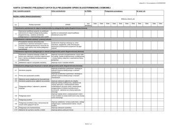 załącznik nr 5 do zarządzenia nr 84/2009/DSOZ KARTA CZYNNOŚCI PIELĘGNACYJNYCH DLA PIELĘGNIARKI OPIEKI DŁUGOTERMINOWEJ DOMOWEJ Imię i nazwisko pacjenta Adres zamieszkania Pielęgniarka prowadząca: Nr PESEL Nr karty/ rok NAZWA I ADRES ŚWIADCZENIODAWCY REALIZACJA Lp. Rodzaj czynności UWAGI kod procedury 1. Świadczenia podstawowe do objęcia świadczeniobiorcy pielęgniarską opieką długoterminową domową 1.1 Wykonanie kwalifikacji pacjenta na podstawie skierowania do objęcia pielęgniarską opieką długoterminową - ustalenie problemów pielęgnacyjnych i indywidualnego planu opieki zgodnie ze wskazaniami zasad kwalifikacji określonymi przez NFZ 2. Świadczenia w zakresie edukacji i promocji zdrowia 2.1 Prowadzenie edukacji zdrowotnej oraz poradnictwa w zakresie samoopieki w życiu z chorobą i niepełnosprawnością w stosunku do chorego i jego rodziny oraz nauka pielęgnacji i samoobsługi świadczenie obejmuje edukację np. przez instruktarz, pogadankę, ulotki informacyjnoedukacyjne przekazywane pacjentowi lub jego rodzinie 3. Świadczenia higieniczno-pielęgnacyjne w ramach pielęgniarskiej opieki długoterminowej domowej 3.1 Wykonanie u pacjenta leżącego w łóżku lub pomoc przy wykonaniu czynności higienicznych oraz z zakresu profilaktyki p/odparzeniowej i p/odleżynowej obejmuje czynności przygotowawcze, mycie ciała lub toaletę, toaletę p/odparzeniową i p/odleżynową , zmianę bielizny (włącznie z ewentualną zmianą pampersa) 3.2 Zakładanie czepca w przypadku wszawicy obejmuje mycie i czesanie włosów 4. Świadczenia pielęgnacyjno-lecznicze w ramach pielęgniarskiej opieki długoterminowej domowej 4.1 Karmienie pacjenta 4.2 Pomoc przy spożywaniu posiłku 4.3 4.4 Założenie sondy żołądkowej lub dwunastniczej Karmienie pacjenta przez zgłębnik lub przetokę 4.5 Pielęgnacja odleżyn i odparzeń u pacjenta leżącego 4.6 Pielęgnacja stomii 4.7 Pielęgnacja przetoki 4.8 Pielęgnacja powikłanej stopy cukrzycowej lub innych trudno gojących się ran obejmuje poradnictwo żywieniowe i edukację w zakresie żywienia dietetycznego w stanach chorobowych obejmuje poradnictwo żywieniowe i edukację w zakresie żywienia dietetycznego w stanach chorobowych obejmuje założenie zgłębnika do żołądka obejmuje toaletę p/odleżynową, założenie lub zmianę opatrunku z zastosowaniem leków wchłaniających się przez skórę, zastosowanie pielęgnacyjnych środków kosmetycznych i leczniczych, założenie lub zmianę opatrunku żelowego obejmuje toaletę stomii z zastosowaniem maści i innych środków na skórę wokół stomii oraz zmianę worka stomijnego 4.9 Pielęgnacja rurki tracheotomijnej obejmuje zakładanie i zmianę opatrunków, zabiegi pielęgnacyjne z zastosowaniem leków i innych środków obejmuje odessanie wydzieliny 4.10 Założenie lub wymiana cewnika u kobiet obejmuje jałowe podmycie krocza Strona 1 z 3 Data Data Data Data Data Data Data Data Data Data Data załącznik nr 5 do zarządzenia nr 84/2009/DSOZ 4.11 4.12 4.13 Pielęgnacja cewnika założonego do pęcherza moczowego Płukanie pęcherza moczowego Wykonanie lewatywy oczyszczającej lub wlewki doodbytniczej 4.14 Wykonanie kompresów i okładów 4.15 Założenie suchej rurki doodbytniczej 4.16 Mechaniczne odbarczanie z wydzieliny górnych dróg oddechowych 4.17 4.18 Stosowanie baniek lekarskich Podawanie leków różnymi drogami - w zależności od zleceń lekarskich (doustnych, doodbytniczych, do oka, do nosa, do ucha, wziewnie) Obejmuje jałowe podmywanie krocza, obserwację ilości i barwy wydalanego moczu, obserwację w kierunku infekcji wstępującej układu moczowego, płukanie cewnika - w zależności od potrzeb, wymianę lub opróżnianie worka na mocz obejmuje toaletę krocza dotyczy okolic całego ciała obejmuje pielegnację rurki tracheotomijnej obejmuje oklepywanie pleców obejmuje podanie wszystkich zaordynowanych leków w trakcie wizyty Podawanie leków w postaci iniekcji śródskórnych, podskórnych i domięśniowych (w tym: podawanie insuliny) obejmuje sprzęt jednorazowego użytku niezbędny do wykonania zlecenia (z wyjątkiem sprzętu do podawania insuliny), a w przypadku podawania insuliny także edukację w zakresie dawkowania, samokontroli i samodzielnego wykonywania iniekcji z insuliny przez pacjenta lub rodzinę 4.20 Podawanie leków w postaci iniekcji dożylnych obejmuje czynności przygotowawcze, kontrolny pomiar tętna i RR, sprzęt jednorazowego użytku i materiały medyczne niezbędne do wykonania zlecenia 4.21 Podawanie płynów infuzyjnych i leków w kroplowych wlewach dożylnych 4.19 5. Świadczenia usprawniające w ramach pielęgniarskiej opieki długoterminowej domowej 5.1 Prowadzenie ćwiczeń biernych i czynnych u pacjenta leżącego obejmuje zastosowanie gimnastyki oddechowej z oklepywaniem 5.2 Prowadzenie usprawniania ruchowego pacjenta obejmuje zastosowanie gimnastyki oddechowej z oklepywaniem 5.3 Zastosowanie drenażu ułożeniowego, wykonanie obejmuje nacieranie pleców, oklepywanie inhalacji 5.4 Gimnastyka oddechowa obejmuje oklepywanie Strona 2 z 3 załącznik nr 5 do zarządzenia nr 84/2009/DSOZ 6. Świadczenia diagnostyczne w ramach pielęgniarskiej opieki długoterminowej domowej 6.1 6.2 6.3 6.4 6.5 Pomiar podstawowych parametrów życiowych (ciśnienia tętniczego krwi, tętna, oddechu, temperatury) Obserwacja występowania i pomiar obrzęków Wykonywanie pomiaru glikemii przy użyciu glukometru lub testów paskowych dotyczy wykonania pomiaru wszystkich parametrów dotyczy wykonania niezbędnych pomiarów Kontrola diurezy, prowadzenie bilansu wodnego Pobieranie materiałów do badań: krwi, moczu, kału, wymazów świadczenie realizowane przy współpracy ze świadczeniodawcą POZ na którego liście lekarskiej znajduje się pacjent. Obejmuje czynności przygotowawcze, sprzęt jednorazowego użytku niezbędny do wykonania zlecenia. Za zapewnienie pojemników do badań oraz warunków transportu pobranych materiałów, zgodnie ze st