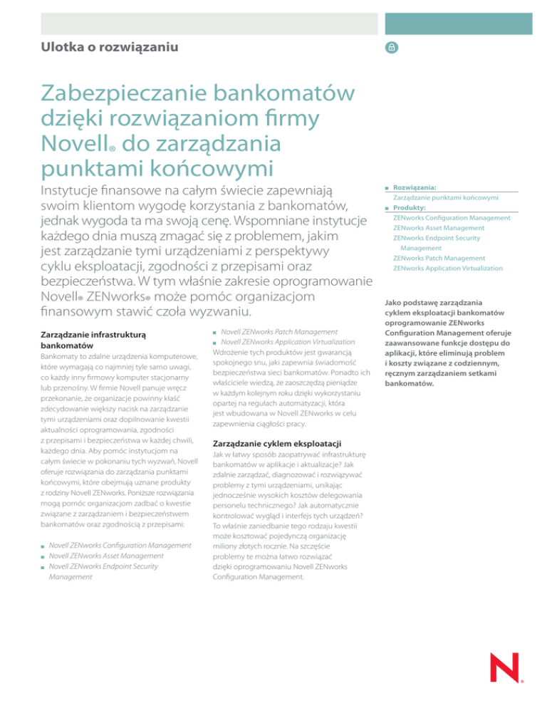 Ulotka o rozwiązaniu Zabezpieczanie bankomatów dzięki rozwiązaniom firmy Novell® do zarządzania punktami końcowymi Instytucje finansowe na całym świecie zapewniają swoim klientom wygodę korzystania z bankomatów, jednak wygoda ta ma swoją cenę. Wspomniane instytucje każdego dnia muszą zmagać się z problemem, jakim jest zarządzanie tymi urządzeniami z perspektywy cyklu eksploatacji, zgodności z przepisami oraz bezpieczeństwa. W tym właśnie zakresie oprogramowanie Novell® ZENworks® może pomóc organizacjom finansowym stawić czoła wyzwaniu. Zarządzanie infrastrukturą bankomatów Bankomaty to zdalne urządzenia komputerowe, które wymagają co najmniej tyle samo uwagi, co każdy inny firmowy komputer stacjonarny lub przenośny. W firmie Novell panuje wręcz przekonanie, że organizacje powinny kłaść zdecydowanie większy nacisk na zarządzanie tymi urządzeniami oraz dopilnowanie kwestii aktualności oprogramowania, zgodności z przepisami i bezpieczeństwa w każdej chwili, każdego dnia. Aby pomóc instytucjom na całym świecie w pokonaniu tych wyzwań, Novell oferuje rozwiązania do zarządzania punktami końcowymi, które obejmują uznane produkty z rodziny Novell ZENworks. Poniższe rozwiązania mogą pomóc organizacjom zadbać o kwestie związane z zarządzaniem i bezpieczeństwem bankomatów oraz zgodnością z przepisami: Novell ZENworks Configuration Management Novell ZENworks Asset Management Novell ZENworks Endpoint Security Management Novell ZENworks Patch Management Novell ZENworks Application Virtualization Wdrożenie tych produktów jest gwarancją spokojnego snu, jaki zapewnia świadomość bezpieczeństwa sieci bankomatów. Ponadto ich właściciele wiedzą, że zaoszczędzą pieniądze w każdym kolejnym roku dzięki wykorzystaniu opartej na regułach automatyzacji, która jest wbudowana w Novell ZENworks w celu zapewnienia ciągłości pracy. Zarządzanie cyklem eksploatacji Jak w łatwy sposób zaopatrywać infrastrukturę bankomatów w aplikacje i aktualizacje? Jak zdalnie zarządzać, diagnozować i rozwiązywać problemy z tymi urządzeniami, unikając jednocześnie wysokich kosztów delegowania personelu technicznego? Jak automatycznie kontrolować wygląd i interfejs tych urządzeń? To właśnie zaniedbanie tego rodzaju kwestii może kosztować pojedynczą organizację miliony złotych rocznie. Na szczęście problemy te można łatwo rozwiązać dzięki oprogramowaniu Novell ZENworks Configuration Management. Rozwiązania: Zarządzanie punktami końcowymi Produkty: ZENworks Configuration Management ZENworks Asset Management ZENworks Endpoint Security Management ZENworks Patch Management ZENworks Application Virtualization Jako podstawę zarządzania cyklem eksploatacji bankomatów oprogramowanie ZENworks Configuration Management oferuje zaawansowane funkcje dostępu do aplikacji, które eliminują problem i koszty związane z codziennym, ręcznym zarządzaniem setkami bankomatów. Oprogramowanie Novell ZENworks Configuration Management pozwala obniżyć koszty użytkowania dzięki wykorzystaniu unikalnej, bazującej na regułach strategii automatyzacji konfiguracji oprogramowania, aktualizacji, naprawy i migracji środowiska bankomatów. Novell ZENworks Endpoint Security M anagement pozwala zablokować bankomaty, aby w ten sposób uniemożliwić intruzom złamanie ich zabezpieczeń z zewnątrz, i co najważniejsze, zapewnić bezpieczeństwo danych. Oprogramowanie Novell ZENworks Configuration Management pozwala obniżyć koszty użytkowania dzięki wykorzystaniu unikalnej, bazującej na regułach strategii automatyzacji konfiguracji oprogramowania, aktualizacji, naprawy i migracji środowiska bankomatów. Dzięki pełnej gamie elastycznych opcji instalacji i wdrażania oprogramowanie ZENworks Configuration Management zapewnia zaawansowane funkcje zarządzania procesem konfigurowania, w tym zarządzanie zdalne, migrację tożsamości, wdrażanie i utrzymywanie standardowego środowiska roboczego (SOE), inwentaryzację sprzętu i oprogramowania, zarządzanie zasobami oraz zoptymalizowane dostarczanie aplikacji zarówno do zastosowań na komputerach biurowych, jak i serwerach. Jako podstawę zarządzania cyklem eksploatacji bankomatów oprogramowanie ZENworks Configuration M anagement oferuje zaawansowane funkcje dostępu do aplikacji, które eliminują problem i koszty związane z codziennym, ręcznym zarządzaniem setkami bankomatów. Zgodność Zgodność z przepisami jest jedną z najważniejszych kwestii, z którymi borykać się muszą dyrektorzy IT – zwłaszcza ci zatrudnieni w firmach świadczących usługi finansowe. Jeśli do drzwi ich gabinetu zapuka audytor, czy będą w stanie pokazać mu raport przedstawiający precyzyjnie sytuację dotyczącą zgodności w zakresie licencji na oprogramowanie, w tym zwłaszcza stan wykorzystania zakupionego oprogramowania? Czy będą w stanie przedstawić ten raport wystarczająco szybko? Taki raport powinien być przygotowany na każdą ewentualność. Oprogramowanie Novell ZENworks Asset Management pozwala stworzyć kompletne zestawienie wszystkich zasobów informatycznych będących własnością firmy, w tym zarówno sprzętu, jak i oprogramowania, dzięki funkcji wykrywania i śledzenia ponad 65 tys. produktów. ZENworks Asset Management umożliwia łatwe dopasowanie wykrytego oprogramowania do zakupionych licencji. Zapewnia to zgodność ze wszystkimi umowami i kontraktami licencyjnymi. Pozwala to także uniknąć kar finansowych oraz uszczerbku na wizerunku firmy, które są konsekwencją naruszenia postanowień umów licencyjnych oraz przepisów prawa. ZENworks Asset Management można także wykorzystać w celu obniżenia kosztów oprogramowania w dłuższej perspektywie. Dzięki raportom obejmującym dane dotyczące licencji, instalacji oraz wykorzystania oprogramowania ZENworks Asset Management może stać się skutecznym narzędziem pozwalającym negocjować bardziej korzys