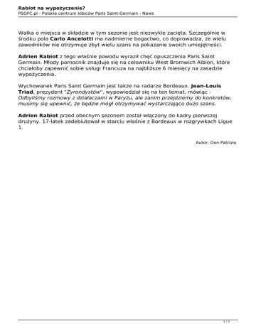 Rabiot na wypożyczenie? PSGFC.pl - Polskie centrum kibiców Paris Saint-Germain - News Walka o miejsca w składzie w tym sezonie jest niezwykle zacięta. Szczególnie w środku pola Carlo Ancelotti ma nadmierne bogactwo, co doprowadza, że wielu zawodników nie otrzymuje zbyt wielu szans na pokazanie swoich umiejętności. Adrien Rabiot z tego właśnie powodu wyraził chęć opuszczenia Paris Saint Germain. Młody pomocnik znajduje się na celowniku West Bromwich Albion, które chciałoby zapewnić sobie usługi Francuza na najbliższe 6 miesięcy na zasadzie wypożyczenia. Wychowanek Paris Saint Germain jest także na radarze Bordeaux. Jean-Louis Triad, prezydent "Żyrondystów", wypowiedział się na ten temat, mówiąc Odbyliśmy rozmowy z działaczami w Paryżu, ale zanim przejdziemy do konkretów, musimy się upewnić, że będzie mógł otrzymywać wystarczająco dużo szans. Adrien Rabiot przed obecnym sezonem został włączony do kadry pierwszej drużyny. 17-latek zadebiutował w starciu właśnie z Bordeaux w rozgrywkach Ligue 1. Autor: Don Patrizio 1/1 Powered by TCPDF (www.tcpdf.org)