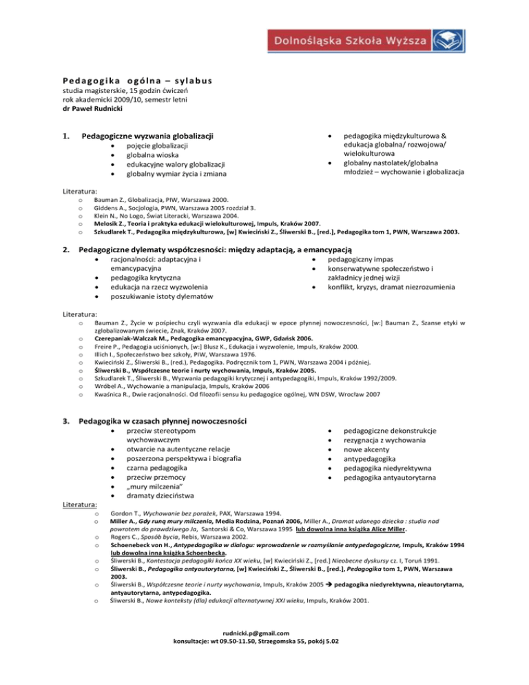 Pe d a g o g i k a o g ó ln a – s y l a b u s studia magisterskie, 15 godzin ćwiczeń rok akademicki 2009/10, semestr letni dr Paweł Rudnicki 1. · Pedagogiczne wyzwania globalizacji · · · · pojęcie globalizacji globalna wioska edukacyjne walory globalizacji globalny wymiar życia i zmiana · pedagogika międzykulturowa & edukacja globalna/ rozwojowa/ wielokulturowa globalny nastolatek/globalna młodzież – wychowanie i globalizacja Literatura: o o o o o 2. Bauman Z., Globalizacja, PIW, Warszawa 2000. Giddens A., Socjologia, PWN, Warszawa 2005 rozdział 3. Klein N., No Logo, Świat Literacki, Warszawa 2004. Melosik Z., Teoria i praktyka edukacji wielokulturowej, Impuls, Kraków 2007. Szkudlarek T., Pedagogika międzykulturowa, [w] Kwieciński Z., Śliwerski B., [red.], Pedagogika tom 1, PWN, Warszawa 2003. Pedagogiczne dylematy współczesności: między adaptacją, a emancypacją · · · · racjonalności: adaptacyjna i emancypacyjna pedagogika krytyczna edukacja na rzecz wyzwolenia poszukiwanie istoty dylematów · · · pedagogiczny impas konserwatywne społeczeństwo i zakładnicy jednej wizji konflikt, kryzys, dramat niezrozumienia Literatura: o o o o o o o o o 3. Bauman Z., Życie w pośpiechu czyli wyzwania dla edukacji w epoce płynnej nowoczesności, [w:] Bauman Z., Szanse etyki w zglobalizowanym świecie, Znak, Kraków 2007. Czerepaniak-Walczak M., Pedagogika emancypacyjna, GWP, Gdańsk 2006. Freire P., Pedagogia uciśnionych, [w:] Blusz K., Edukacja i wyzwolenie, Impuls, Kraków 2000. Illich I., Społeczeństwo bez szkoły, PIW, Warszawa 1976. Kwieciński Z., Śliwerski B., (red.), Pedagogika. Podręcznik tom 1, PWN, Warszawa 2004 i później. Śliwerski B., Współczesne teorie i nurty wychowania, Impuls, Kraków 2005. Szkudlarek T., Śliwerski B., Wyzwania pedagogiki krytycznej i antypedagogiki, Impuls, Kraków 1992/2009. Wróbel A., Wychowanie a manipulacja, Impuls, Kraków 2006 Kwaśnica R., Dwie racjonalności. Od filozofii sensu ku pedagogice ogólnej, WN DSW, Wrocław 2007 Pedagogika w czasach płynnej nowoczesności · · · · · · · Literatura: o o o o o o o o przeciw stereotypom wychowawczym otwarcie na autentyczne relacje poszerzona perspektywa i biografia czarna pedagogika przeciw przemocy „mury milczenia” dramaty dzieciństwa · · · · · · pedagogiczne dekonstrukcje rezygnacja z wychowania nowe akcenty antypedagogika pedagogika niedyrektywna pedagogika antyautorytarna Gordon T., Wychowanie bez porażek, PAX, Warszawa 1994. Miller A., Gdy runą mury milczenia, Media Rodzina, Poznań 2006, Miller A., Dramat udanego dziecka : studia nad powrotem do prawdziwego Ja, Santorski & Co, Warszawa 1995 lub dowolna inna książka Alice Miller. Rogers C., Sposób bycia, Rebis, Warszawa 2002. Schoenebeck von H., Antypedagogika w dialogu: wprowadzenie w rozmyślanie antypedagogiczne, Impuls, Kraków 1994 lub dowolna inna książka Schoenbecka. Śliwerski B., Kontestacja pedagogiki końca XX wieku, [w] Kwieciński Z., [red.] Nieobecne dyskursy cz. I, Toruń 1991. Śliwerski B., Pedagogika antyautorytarna, [w] Kwieciński Z., Śliwerski B., [red.], Pedagogika tom 1, PWN, Warszawa 2003. Śliwerski B., Współczesne teorie i nurty wychowania, Impuls, Kraków 2005 è pedagogika niedyrektywna, nieautorytarna, antyautorytarna, antypedagogika. Śliwerski B., Nowe konteksty (dla) edukacji alternatywnej XXI wieku, Impuls, Kraków 2001. [email protected] konsultacje: wt 09.50-11.50, Strzegomska 55, pokój 5.02 4. Nowe obszary edukacji · · · · · · edukacja mimowolna edukacja i media edukacja i reklama popkultura i edukacja symbole a edukacja edukacja i przestrzeń · · · · · uczenie się z rzeczywistości biograficzne uczenie się społeczeństwo konsumpcyjne czy potrzebujemy szkoły i nauczycieli? „nowa edukacja” na rzecz demokracji Literatura: Baudrillard J., Społeczeństwo konsumpcyjne. Jego mity i struktury, Sic!, Warszawa 2006 Bauman Z., Życie w pośpiechu czyli wyzwania dla edukacji w epoce płynnej nowoczesności, [w:] Bauman Z., Szanse etyki w zglobalizowanym świecie, Znak, Kraków 2007 Bogunia-Borowska M., Reklama jako tworzenie rzeczywistości społecznej, Wydawnictwo Uniwersytetu Jagiellońskiego, Kraków 2004 Burszta W.J., Kuligowski W., Sequel. Dalsze przygody kultury w globalnym świecie, Warszawskie Wydawnictwo Literackie MUZA S.A., Warszawa 2005 Jakubowski W., Kultura popularna jako obszar refleksji pedagogicznej, [w:] Jakubowski W., Zierkiewicz E., Edukacyjne konteksty kultury popularnej, Impuls, Kraków 2002 Johnson R., Uczenie się dorosłych obywatelstwa: odkrywanie założeń praktyki edukacyjnej, „Teraźniejszość – Człowiek – Edukacja”, 2004/1. Melosik Z., Postmodernistyczne kontrowersje wokół edukacji, „Edytor”, Toruń – Poznań 1995 Szkudlarek T., Parcelacje. Topografie społeczeństwa wiedzy, [w:] Mendel M., Pedagogika miejsca, Wyd. DSWE, Wrocław 2006 o o o o o o o o 5. Analiza biografii pedagogów w perspektywie ich koncepcji · · · · · Jacek Kuroń i jego koncepcje pedagogiczne Paulo Freire i pedagogia uciśnionych Alice Miller i Czarna Pedagogika Janusz Korczak i jego pedagogika koncepcja Charlotte Bűchler · · · transformatywny intelektualista facylitator biograficzne źródła koncepcji pedagogicznych Proszę odnaleźć informacje o biografiach wymienionych osób!!! Literatura: o o o o o o o o o o o ð Bűchler Ch., Bieg życia ludzkiego, PWN, Warszawa 1999 Dauzenroth E., Janusz Korczak - życie dla dzieci, WAM, Warszawa 2005 Freire P., Pedagogia uciśnionych, [w:] Blusz K., Edukacja i wyzwolenie, Impuls, Kraków 2000 Korczak J., jak kochać dziecko, Santorski & CO, Warszawa 2004 Kuroń J., Działanie, Wydawnictwo Dolnośląskie, Wrocław 2002 Kuroń J., Wiara i wina, Wydawnictwo Dolnośląskie, Wrocław 1995 Kuroń J., Zło które czynię, Krytyka, Niezależna Oficyna Wydawnicza, Warszawa 1984 Miller A., Zniewolone dzieciństwo - ukryte źródła tyranii, Media Rodzina, Poznań 2007 Miller A., 