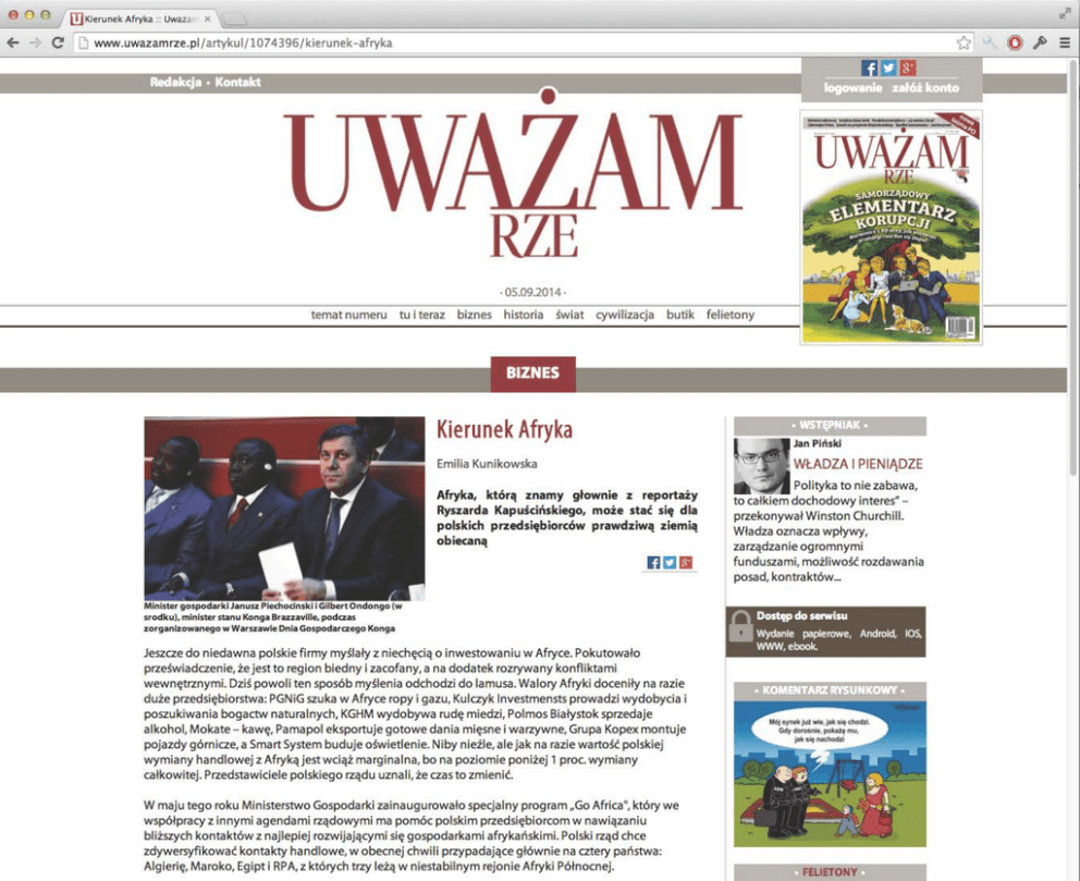 O O O ~ 4 (!] Kierunek Afryk a :: Uważao x l C D www.uwazamrze .pl /artykul/1074396/ kierunek-afryka 't? : Redakcja • Kontakt ·05.09.2014· temat numeru tu i teraz biznes historia świat cywilizacja butik felietony BIZNES WSTĘPNIAK Kierunek Afryka • Emilia Kunikowska WŁADZA • Jan Pińskl Afryka, którą znamy głownie z reportaży Ryszarda Kapuścińskiego, może stać się dla polskich przedsiębiorców prawdziwą ziemią obiecaną IU l ll l PIENIĄDZE Polityka to nie zabawa, to callkiE!mdochodowy interes"przekonywał Winsto n Churchill. Władza oznacza wpływy, zarządzanie ogromnymi funduszami, możliwość rozdawania posad, kontraktów ... srodku), minister stanu Konga Brazzaville, podaas zorganizowanego w Warszawie Dnia Gospodaraego Konga Jeszcze do niedawna polskie firmy myślały z niechęcią o inwestowaniu w Afryce. Pokutowało przeświadczenie, że jest to region biedny i zacofany, a na dodatek rozrywany konfliktami wewnętrznymi. Dziś powoli ten sposób myślenia odchodzi do lamusa. Walory Afryki doceniły na razie duże przedsiębiorstwa : PGNiG szuka w Afryce ropy i gazu, Kulczyk lnvestmensts prowadzi wydobycia i poszukiwania bogactw naturalnych, KGHM wydobywa rudę miedzi, Polmos Białystok sprzedaje alkohol, Mokate - kawę, Pamapol eksportuje gotowe dania mięsne i warzywne, Grupa Kopex montuje pojazdy górnicze, a Smart System buduje oświetlenie. Niby nieźle, alejak na razie wartość polskiej wymiany handlowej z Afrykąjest wciąż marginalna, bo na poziomie poniżej 1 proc. wymiany całkowitej. Przedstawiciele polskiego rządu uznali, że czas to zmienić. W maju tego roku Ministerstwo Gospodarki zainaugurowało specjalny program .,Go Africa ", który we współpracy z innymi agendami rządowymi ma pomóc polskim przedsiębiorcom w nawiązaniu bliższych kontaktów z najlepiej rozwijającymi się gospodarkami afrykańskimi. Polski rząd chce zdywersyfikować kontakty handlowe, w obecnej chwili przypadające głównie na cztery państwa : Algierię, Maroko, Egipt i RPA, z których trzy leżą w niestabilnym rejonie Afryki Północnej. FEliETONY