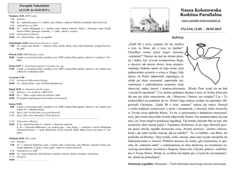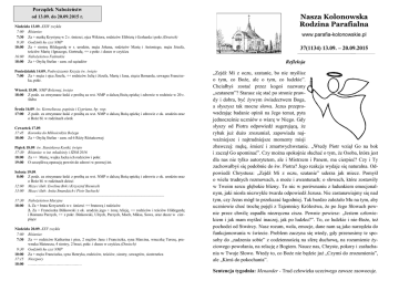Porządek Nabożeństw od 13.09. do 20.09.2015 r. Niedziela 13.09. XXIV zwykła 7:00 Różaniec 7:30 Za + matkę Krystynę w 2 r. śmierci, ojca Wiktora, rodziców Elżbietę i Gerharda i pokr.(Deutsch) 9:30 Godzinki ku czci NMP 10:00 Za + siostrę Hildegardę w r. urodzin, męża Johana, rodziców Marię i Antoniego, męża Józefa, teściów Marię i Ignacego, Gertrudę, ++ z pokr. i dusze w czyśćcu 16:00 Nabożeństwo Fatimskie 18:00 Za + Otylię Stefan - zam. od sąsiadów Poniedziałek 14.09. Podwyższenie Krzyża św. święto 7:00 Za + męża i ojca Józefa, ++ rodziców Julię i Józefa, Martę i Jana, zięcia Bernarda, szwagra Franciszka, pokr. Wtorek 15.09. NMP Bolesnej, święto 18:00 Z podz. za otrzymane łaski z prośbą za wst. NMP o dalszą Bożą opiekę i zdrowie w rodzinie w 20 r. ślubu Środa 16.09. św. Korneliusza, papieża i Cypriana, bp. wsp. 17:00 Z podz. za otrzymane łaski z prośbą za wst. NMP o dalszą Bożą opiekę i zdrowie z ok. urodzin oraz o Boże bł. w rodzinach córek Czwartek 17.09. 17:45 Koronka do Miłosierdzia Bożego 18:00 Za + Otylię Stefan - zam. od 6 Róży Różańcowej Piątek 18.09. św. Stanisława Kostki, święto 17:30 Różaniec w int. młodzieży i ŚDM 2016 18:00 Za ++ Marię, wujka Jacka ich rodziców i pokr. 19:00 O szczęśliwą operację powrót do zdrowi w pewnej int. Sobota 19.09. 8:00 Z podz. za otrzymane łaski z prośbą za wst. NMP o dalszą Bożą opiekę i zdrowie z ok. urodzin oraz o Boże bł. w rodzinach dzieci 12:00 Msza i ślub: Ewelina Bok i Krzysztof Bieniecki 13:00 Msza i ślub: Anita Smandzich i Piotr Suchecki ————————–—–——–————————————–——–—————— 17:30 Nabożeństwo Maryjne 18:00 1. Za + brata Krzysztofa w r. śmierci ++ bratową i rodziców 2. Za + Franciszka Bińkowski z ok. urodzin jego + żonę Alicję, ++ rodziców i teściów Hildegardę i Romana Parzych, ++ z pokr. Binkowski, Ulrych, Parzych, Moch, Miksa, Sowa, oraz dusze w cierpiące Niedziela 20.09. XXV zwykła 7:00 Różaniec 7:30 Za ++ rodziców Katharina i pius, 2 mężów Jana i Franciszka, syna Marcina, wnuczkę Teresę, prawnuka Mateusza, 4 siostry, 2 braci, pokr. i dusze w czyśćcu.(Deutsch) 9:30 Godzinki ku czci NMP 10:00 Za + męża Franciszka, syna Henryka, rodziców, teściów, siostry, szwagrów, siostrzeńca 17:15 Nieszpory 18:00 …………………………………… Nasza Kolonowska Rodzina Parafialna www.parafia-kolonowskie.pl 37(1134) 13.09. – 20.09.2015 Refleksja „Zejdź Mi z oczu, szatanie, bo nie myślisz o tym, co Boże, ale o tym, co ludzkie”. Chciałbyś zostać przez kogoś nazwany „szatanem”? Starasz się stać po stronie prawdy i dobra, być żywym świadectwem Boga, a słyszysz tak mocne słowa. Jezus przeprowadzając badanie opinii na Jego temat, pyta jednocześnie uczniów o wiarę w Niego. Gdy słyszy od Piotra odpowiedź sugerującą, że rybak już dużo zrozumiał, zapowiada najważniejsze i najtrudniejsze momenty misji zbawczej: mękę, śmierć i zmartwychwstanie. „Wtedy Piotr wziął Go na bok i zaczął Go upominać”. Czy można spokojnie słuchać o tym, że Osoba, która jest dla nas nie tylko autorytetem, ale i Mistrzem i Panem, ma cierpieć? Czy i Ty zachowałbyś się podobnie do św. Piotra? Jego reakcja wydaje się naturalna. Odpowiedź Chrystusa: „Zejdź Mi z oczu, szatanie” uderza jak miecz. Pomyśl o wielu trudnych rozmowach, a może i awanturach; o słowach, które zostawiły w Twoim sercu głębokie blizny. To nic w porównaniu z ładunkiem emocjonalnym, jaki niosła niezwykle twarda odpowiedź Jezusa. Nie zastanawiajmy się nad tym, czy Jezus mógł to przekazać łagodniej. Tak bardzo zależało Mu na tym, aby uczniowie choć trochę pojęli z Tajemnicy Królestwa, że po Jego Słowach pewnie przez chwilę zapadła niezręczna cisza. Pewnie powiesz: „Jestem człowiekiem i jak mam myśleć inaczej, jak po ludzku?”. To, co ludzkie i nie-Boże, też pochodzi od Stwórcy. Nasz rozum, wola, emocje, dane nam są jako narzędzia do funkcjonowania w świecie. Problem zaczyna się wtedy, gdy przenosimy te sposoby do „radzenia sobie” z codziennością na sferę duchową, na rozumienie życiowego powołania, na relację z Bogiem. Naucz nas, Chryste, pokory i zasłuchania w Twoje Słowo. Wtedy to, co Boże nie będzie już „Czymś do zrozumienia”, ale „Kimś do pokochania”. Sentencja tygodnia: Menander - Trud człowieka uczciwego zawsze zaowocuje. 37/2015 Modlitwa w intencji ŚDM 2016 „Boże, Ojcze Miłosierny, który objawiłeś swoją miłość w Twoim Synu Jezusie Chrystusie, wylałeś ją na nas w Duchu Świętym, Pocieszycielu, Tobie zawierzamy dziś losy świata i każdego człowieka”. Zawierzamy Ci szczególnie ludzi młodych ze wszystkich narodów, ludów i języków. Prowadź ich bezpiecznie po zawiłych ścieżkach współczesnego świata i daj im łaskę owocnego przeżycia Światowych Dni Młodzieży w Krakowie. Ojcze niebieski, uczyń nas świadkami Twego miłosierdzia. Naucz nieść wiarę wątpiącym, nadzieję zrezygnowanym, miłość oziębłym, przebaczenie winnym i radość smutnym. Niech iskra miłosiernej miłości, którą w nas zapaliłeś, stanie się ogniem przemieniającym ludzkie serca i odnawiającym oblicze ziemi. Maryjo, Matko Miłosierdzia, módl się za nami. Święty Janie Pawle II, módl się za nami. Święta Siostro Faustyno, módl się za nami. ——–————–—–—–—————–—–———–——–———–—— Oprócz codziennego duszpasterstwa będą w tym roku następujące wydarzenia: - 27.09. niedziela – po Mszach św. kiermasz różnych rzeczy związanych z ŚDM. Gościem będzie i podzieli się swoimi wrażeniami nt. Camino pan Kajetan Suchecki. - 02 – 04. 10. piątek – niedziela – Camino od Ślęży do Środy Śl. 70 km. (zgłoszenia u ks. Piotra do 19.09.) - 11.10. niedziela - Dzień Papieski, ofiary będą przezna