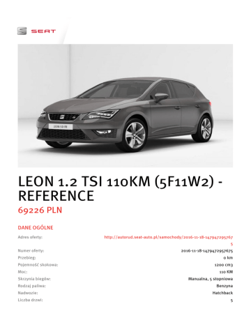 LEON 1.2 TSI 110KM (5F11W2) REFERENCE 69226 PLN DANE OGÓLNE Adres oferty: http://autorud.seat-auto.pl/samochody/2016-11-18-147947295767 5 Numer oferty: Przebieg: Pojemność skokowa: Moc: Skrzynia biegów: Rodzaj paliwa: Nadwozie: Liczba drzwi: 2016-11-18-1479472957675 0 km 1200 cm3 110 KM Manualna, 5 stopniowa Benzyna Hatchback 5 Liczba miejsc: 5 Kolor: Technic Grey Rok produkcji: 2016 WYPOSAŻENIE / ABS / ASR (kontrola trakcji) / Centralny zamek / Elektryczne szyby przednie / Elektrycznie ustawiane lusterka / Gniazdo USB / Isofix / Klimatyzacja manualna / Kurtyny powietrzne / Podgrzewane lusterka boczne / Poduszka powietrzna chroniąca kolana / Poduszka powietrzna kierowcy / Poduszka powietrzna pasażera / Poduszki boczne przednie / Poduszki boczne tylne / Radio fabryczne / Światła do jazdy dziennej / Wielofunkcyjna kierownica / Wspomaganie kierownicy OPIS WYPOSAŻENIE STANDARDOWE Leon 1.2 TSI 110KM REFERENCE: Wnętrze • Oczka do zabezpieczania przedmiotów przewożonych w bagażniku • Uchwyt na napoje w przedniej konsoli • Osłony przeciwsłoneczne kierowcy i pasażera z zamykanymi lusterkami, ze schowkiem na karty po stronie kierowcy • Oświetlenie bagażnika • Lampki do czytania z przodu • Gniazdo 12 V z przodu • Kierownica wielofunkcyjna z tworzywa sztucznego • Dywaniki materiałowe z przodu i z tyłu • Wnętrze w kolorze czarnym • Zagłówek fotela kierowcy i pasażera z systemem WOKS • Składana i dzielona tylna kanapa • Fotel kierowcy z regulacją wysokości • Przednie fotele typu Comfort Elektronika • Oświetlenie • Dwa halogenowe reflektory przednie z funkcją świateł do jazdy dziennej • Media System Touch: 5-calowy ekran dotykowy, Radio, Złącza USB, 4 głośniki • Elektrycznie sterowane szyby boczne z przodu • Centralny zamek ze zdalnym sterowaniem, dwa składane kluczyki, otwieranie klapy bagażnika z pilota (3 przyciski) • Elektrycznie regulowane i podgrzewane lusterka boczne • Podstawowa tablica przyrządów • Funkcja rekomendacji zmiany biegu • Klimatyzacja manualna Climatic Nadwozie • Zawieszenie typu Comfort • 16-calowe dojazdowe koło zapasowe • Lusterka boczne i klamki w kolorze nadwozia • Chromowana osłona chłodnicy Bezpieczeństwo • 4 lata Ochrony Gwarancyjnej SEAT • System kontroli ciśnienia powietrza w oponach • Automatyczny hamulec pokolizyjny ograniczający skutki kolejnych kolizji (Multi Collision Brake) • 2 górne pasy mocujące w systemie iSOFIX na tylnch siedzeniach • 4 zaczepy iSOFIX do mocowania fotelika dla dziecka (2 tylne siedzenia) • System przypominający o obowiązku zapinania pasów bezpieczeństwa przy przednich fotelach • Dezaktywacja poduszki powietrznej pasażera • 7 poduszek powietrznych (2 przednie, 2 boczne, 2 kurtyny powietrzne, poduszka kolanowa kierowcy) • ESC z ABS, ASR i EBA