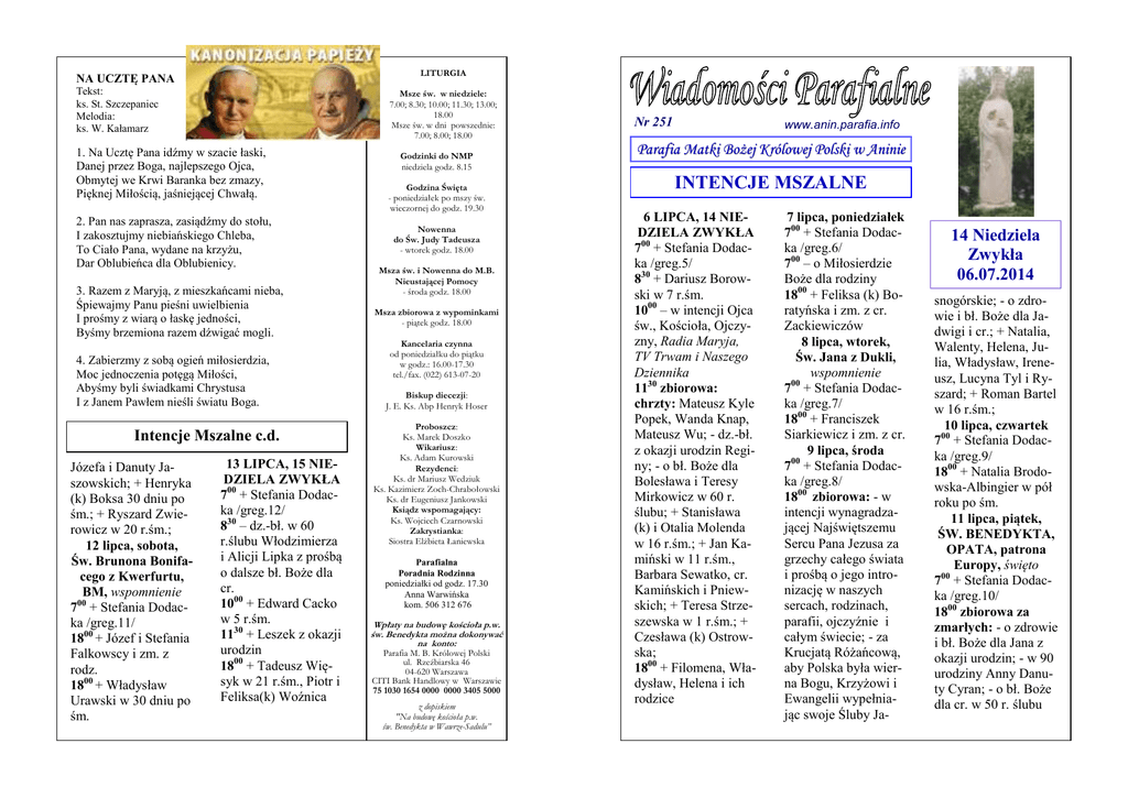 LITURGIA NA UCZTĘ PANA Tekst: ks. St. Szczepaniec Melodia: ks. W. Kałamarz Msze św. w niedziele: 7.00; 8.30; 10.00; 11.30; 13.00; 18.00 Msze św. w dni powszednie: 7.00; 8.00; 18.00 1. Na Ucztę Pana idźmy w szacie łaski, Danej przez Boga, najlepszego Ojca, Obmytej we Krwi Baranka bez zmazy, Pięknej Miłością, jaśniejącej Chwałą. 2. Pan nas zaprasza, zasiądźmy do stołu, I zakosztujmy niebiańskiego Chleba, To Ciało Pana, wydane na krzyżu, Dar Oblubieńca dla Oblubienicy. 3. Razem z Maryją, z mieszkańcami nieba, Śpiewajmy Panu pieśni uwielbienia I prośmy z wiarą o łaskę jedności, Byśmy brzemiona razem dźwigać mogli. 4. Zabierzmy z sobą ogień miłosierdzia, Moc jednoczenia potęgą Miłości, Abyśmy byli świadkami Chrystusa I z Janem Pawłem nieśli światu Boga. Intencje Mszalne c.d. Józefa i Danuty Jaszowskich; + Henryka (k) Boksa 30 dniu po śm.; + Ryszard Zwierowicz w 20 r.śm.; 12 lipca, sobota, Św. Brunona Bonifacego z Kwerfurtu, BM, wspomnienie 700 + Stefania Dodacka /greg.11/ 1800 + Józef i Stefania Falkowscy i zm. z rodz. 1800 + Władysław Urawski w 30 dniu po śm. 13 LIPCA, 15 NIEDZIELA ZWYKŁA 700 + Stefania Dodacka /greg.12/ 830 – dz.-bł. w 60 r.ślubu Włodzimierza i Alicji Lipka z prośbą o dalsze bł. Boże dla cr. 1000 + Edward Cacko w 5 r.śm. 1130 + Leszek z okazji urodzin 1800 + Tadeusz Więsyk w 21 r.śm., Piotr i Feliksa(k) Woźnica Godzinki do NMP niedziela godz. 8.15 Godzina Święta - poniedziałek po mszy św. wieczornej do godz. 19.30 Nowenna do Św. Judy Tadeusza - wtorek godz. 18.00 Msza św. i Nowenna do M.B. Nieustającej Pomocy - środa godz. 18.00 Msza zbiorowa z wypominkami - piątek godz. 18.00 Kancelaria czynna od poniedziałku do piątku w godz.: 16.00-17.30 tel./fax. (022) 613-07-20 Biskup diecezji: J. E. Ks. Abp Henryk Hoser Proboszcz: Ks. Marek Doszko Wikariusz: Ks. Adam Kurowski Rezydenci: Ks. dr Mariusz Wedziuk Ks. Kazimierz Zoch-Chrabołowski Ks. dr Eugeniusz Jankowski Ksiądz wspomagający: Ks. Wojciech Czarnowski Zakrystianka: Siostra ElŜbieta Łaniewska Parafialna Poradnia Rodzinna poniedziałki od godz. 17.30 Anna Warwińska kom. 506 312 676 Wpłaty na budowę kościoła p.w. św. Benedykta moŜna dokonywać na konto: Parafia M. B. Królowej Polski ul. Rzeźbiarska 46 04-620 Warszawa CITI Bank Handlowy w Warszawie 75 1030 1654 0000 0000 3405 5000 z dopiskiem "Na budowę kościoła p.w. św. Benedykta w Wawrze-Sadulu” Nr 251 www.anin.parafia.info Parafia Matki BoŜej Królowej Polski w Aninie INTENCJE MSZALNE 6 LIPCA, 14 NIEDZIELA ZWYKŁA 700 + Stefania Dodacka /greg.5/ 830 + Dariusz Borowski w 7 r.śm. 1000 – w intencji Ojca św., Kościoła, Ojczyzny, Radia Maryja, TV Trwam i Naszego Dziennika 1130 zbiorowa: chrzty: Mateusz Kyle Popek, Wanda Knap, Mateusz Wu; - dz.-bł. z okazji urodzin Reginy; - o bł. Boże dla Bolesława i Teresy Mirkowicz w 60 r. ślubu; + Stanisława (k) i Otalia Molenda w 16 r.śm.; + Jan Kamiński w 11 r.śm., Barbara Sewatko, cr. Kamińskich i Pniewskich; + Teresa Strzeszewska w 1 r.śm.; + Czesława (k) Ostrowska; 1800 + Filomena, Władysław, Helena i ich rodzice 7 lipca, poniedziałek 700 + Stefania Dodacka /greg.6/ 700 – o Miłosierdzie Boże dla rodziny 1800 + Feliksa (k) Boratyńska i zm. z cr. Zackiewiczów 8 lipca, wtorek, Św. Jana z Dukli, wspomnienie 700 + Stefania Dodacka /greg.7/ 1800 + Franciszek Siarkiewicz i zm. z cr. 9 lipca, środa 700 + Stefania Dodacka /greg.8/ 1800 zbiorowa: - w intencji wynagradzającej Najświętszemu Sercu Pana Jezusa za grzechy całego świata i prośbą o jego intronizację w naszych sercach, rodzinach, parafii, ojczyźnie i całym świecie; - za Krucjatą Różańcową, aby Polska była wierna Bogu, Krzyżowi i Ewangelii wypełniając swoje Śluby Ja- 14 Niedziela Zwykła 06.07.2014 snogórskie; - o zdrowie i bł. Boże dla Jadwigi i cr.; + Natalia, Walenty, Helena, Julia, Władysław, Ireneusz, Lucyna Tyl i Ryszard; + Roman Bartel w 16 r.śm.; 10 lipca, czwartek 700 + Stefania Dodacka /greg.9/ 1800 + Natalia Brodowska-Albingier w pół roku po śm. 11 lipca, piątek, ŚW. BENEDYKTA, OPATA, patrona Europy, święto 700 + Stefania Dodacka /greg.10/ 1800 zbiorowa za zmarłych: - o zdrowie i bł. Boże dla Jana z okazji urodzin; - w 90 urodziny Anny Danuty Cyran; - o bł. Boże dla cr. w 50 r. ślubu Ogłoszenia na 14 Niedzielę Zwykłą 06.07.2014 r. Liturgia Słowa Bożego Za 9,9-10 Będę Cię wielbił, Boże mój i Królu Rz 8,9.11-13 Mt 11,25-30 W owym czasie Jezus przemówił tymi słowami: Wysławiam Cię, Ojcze, Panie nieba i ziemi, że zakryłeś te rzeczy przed mądrymi i roztropnymi, a objawiłeś je prostaczkom. Tak, Ojcze, gdyż takie było Twoje upodobanie. Wszystko przekazał Mi Ojciec mój. Nikt też nie zna Syna, tylko Ojciec, ani Ojca nikt nie zna, tylko Syn, i ten, komu Syn zechce objawić. Przyjdźcie do Mnie wszyscy, którzy utrudzeni i obciążeni jesteście, a Ja was pokrzepię. Weźcie moje jarzmo na siebie i uczcie się ode Mnie, bo jestem cichy i pokorny sercem, a znajdziecie ukojenie dla dusz waszych. Albowiem jarzmo moje jest słodkie, a moje brzemię lekkie. • Wszystkim wyjeżdżającym na wakacje życzymy pomyślnego wypoczynku i radosnego odkrywania obecności Boga w przyrodzie i czasie wolnym. Jednocześnie przypominamy o obowiązku uczestniczenia w niedzielnej mszy św. i uczulamy na godny strój w czasie obecności w świątyni. • 13.07 - w niedzielę - o godz. 17.30 zapraszamy na Różaniec Fatimski. • Od wtorku - 01.07 - z racji wakacyjnego porządku w lipcu i sierpniu nie ma Mszy św. o godz. 13.00 w niedziele i o godz. 8.00 w dni powszednie. • Biuro Radia Maryja serdecznie zaprasza członków i sympatyków Radia Maryja na pielgrzymkę do Częstochowy w dniu 13 lipca na ogólnopolskie Spotkanie Rodziny Radia Maryja u stóp Jasnogórskiej Pani. Bliższe informacje w kiosku przy kościele. • Zachęcamy do lektury najnowszego, wakacyjnego numeru miesięcznika Salve Regina. Polecamy szczeg
