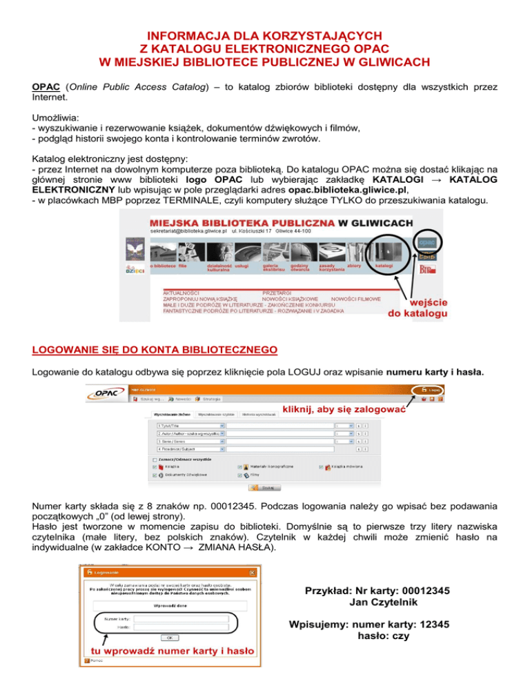 INFORMACJA DLA KORZYSTAJĄCYCH Z KATALOGU ELEKTRONICZNEGO OPAC W MIEJSKIEJ BIBLIOTECE PUBLICZNEJ W GLIWICACH OPAC (Online Public Access Catalog) – to katalog zbiorów biblioteki dostępny dla wszystkich przez Internet. Umożliwia: - wyszukiwanie i rezerwowanie książek, dokumentów dźwiękowych i filmów, - podgląd historii swojego konta i kontrolowanie terminów zwrotów. Katalog elektroniczny jest dostępny: - przez Internet na dowolnym komputerze poza biblioteką. Do katalogu OPAC można się dostać klikając na głównej stronie www biblioteki logo OPAC lub wybierając zakładkę KATALOGI → KATALOG ELEKTRONICZNY lub wpisując w pole przeglądarki adres opac.biblioteka.gliwice.pl, - w placówkach MBP poprzez TERMINALE, czyli komputery służące TYLKO do przeszukiwania katalogu. LOGOWANIE SIĘ DO KONTA BIBLIOTECZNEGO Logowanie do katalogu odbywa się poprzez kliknięcie pola LOGUJ oraz wpisanie numeru karty i hasła. Numer karty składa się z 8 znaków np. 00012345. Podczas logowania należy go wpisać bez podawania początkowych „0” (od lewej strony). Hasło jest tworzone w momencie zapisu do biblioteki. Domyślnie są to pierwsze trzy litery nazwiska czytelnika (małe litery, bez polskich znaków). Czytelnik w każdej chwili może zmienić hasło na indywidualne (w zakładce KONTO → ZMIANA HASŁA). Przykład: Nr karty: 00012345 Jan Czytelnik Wpisujemy: numer karty: 12345 hasło: czy Po zalogowaniu w zakładce KONTO jest możliwe wyświetlenie danych czytelnika, listy dokumentów wypożyczonych i zarezerwowanych czy też zmiana hasła. Czytelnik, który posiada kartę biblioteczną może sprawdzić historię własnego konta oraz termin zwrotu wypożyczonych zbiorów. PRZEGLĄDANIE, WYSZUKIWANIE I REZEROWANIE KSIĄŻEK W katalogu komputerowym można wyszukiwać zbiory m.in. według: tytułu, autora, serii wydawniczej, haseł przedmiotowych, roku wydania, numeru ISBN. Oprócz książek w katalogu elektronicznym ujęte są dokumenty dźwiękowe, książki mówione i filmy. Wyszukiwanie można prowadzić dla wszystkich tych dokumentów lub wybierając np. tylko jeden rodzaj. 1. Wyszukiwanie w katalogu jest możliwe na wiele sposobów. Poniżej przedstawiono wyszukiwanie wg tytułu. Aby znaleźć np. książkę Gra o tron wpisujemy ten tytuł w odpowiednie pole i klikamy SZUKAJ. Jako wynik wyświetli się lista dokumentów o danym tytule. Jeśli nie określiliśmy, że szukamy TYLKO książki, w wynikach będą też filmy i audiobooki. Klikamy w wybrane wydanie, aby wyświetlić informacje szczegółowe. Pojawi się tabela Dokumenty przeznaczone do wypożyczania. Zawiera ona następujące informacje: SYGNATURA oznacza miejsce na półce oraz placówkę, w której znajduje się wybrana pozycja. Po kliknięciu podkreślonej sygnatury wyświetlą się dane adresowe placówki oraz jej godziny otwarcia. Aby łatwo odnaleźć książkę w bibliotece warto zapisać sobie jej sygnaturę. STATUS dostępności danej książki oznaczony może być następująco: o status dostępna - zapraszamy do biblioteki, książka czeka Warto telefonicznie poprosić o odłożenie książki, ponieważ zanim czytelnik dotrze do biblioteki, pozycja może zostać wypożyczona przez kogoś innego. o status informacja w filii - dostępność należy sprawdzić w danej placówce (osobiście, telefonicznie, pocztą elektroniczną), o status wypożyczona - na taką pozycję można dokonać rezerwacji, o status niedostępna - w opracowaniu - książka przygotowywana jest do udostępniania. AKCJA – w tym polu jest widoczna data zwrotu dokumentu wypożyczonego oraz dla użytkowników zalogowanych - ikonka ZAREZERWUJ. Kliknięcie w nią umożliwia wpisanie się na listę oczekujących na dany dokument. W momencie, gdy pojawi się on w bibliotece, system zamówi go na konto pierwszej osoby z listy oczekujących. Należy zwrócić uwagę, aby wybrać egzemplarz z filii, do której chcemy się udać. Skorzystanie z opcji ZAREZERWUJ DOWOLNY DOKUMENT skutkuje zamówieniem dla czytelnika pierwszego dostępnego egzemplarza, bez względu na jego lokalizację. Domyślny czas ważności rezerwacji to 60 dni. Można go zmienić. UWAGI – pole zawiera informacje o stanie fizycznym książki. Analogiczny sposób postępowania należy zastosować do każdej opcji wyszukiwania (wg autora, hasła przedmiotowego etc.). W razie problemów z logowaniem bibliotekarze chętnie udzielą pomocy. Korzystając z katalogu poza domem należy pamiętać o WYLOGOWANIU SIĘ.