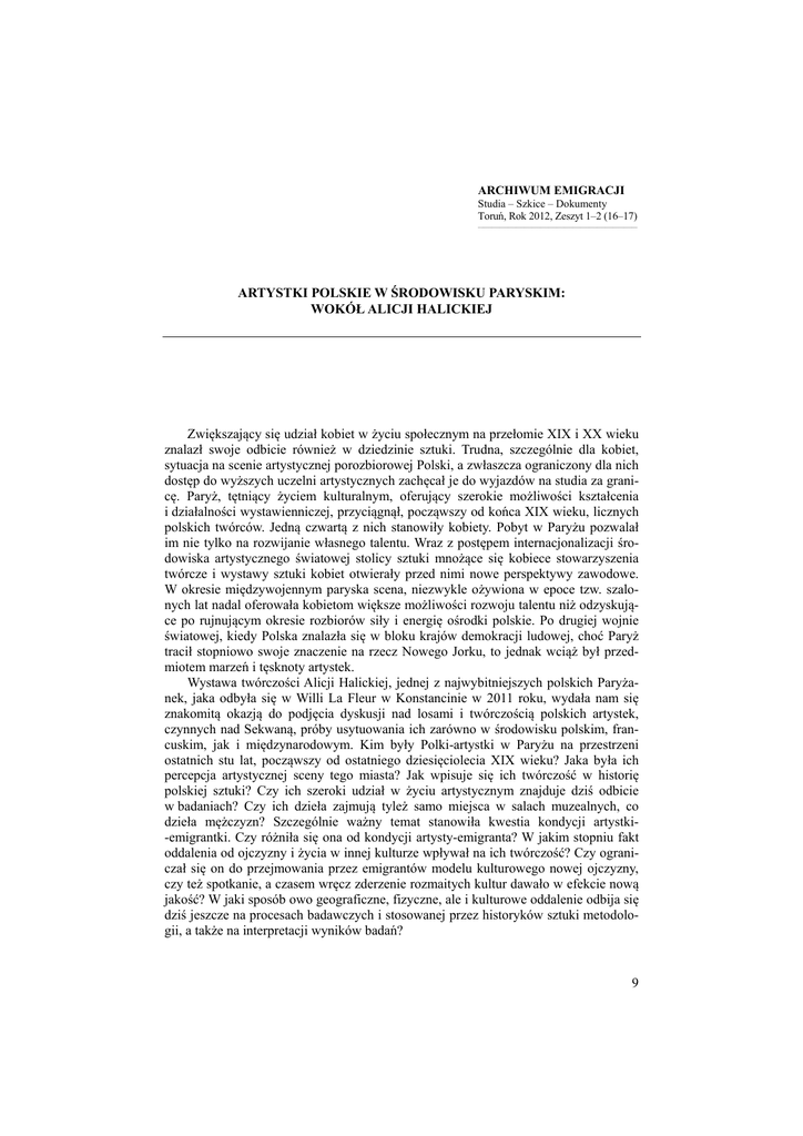 ARCHIWUM EMIGRACJI Studia – Szkice – Dokumenty Toruń, Rok 2012, Zeszyt 1–2 (16–17) ___________________________________________________________ ARTYSTKI POLSKIE W ŚRODOWISKU PARYSKIM: WOKÓŁ ALICJI HALICKIEJ Zwiększający się udział kobiet w życiu społecznym na przełomie XIX i XX wieku znalazł swoje odbicie również w dziedzinie sztuki. Trudna, szczególnie dla kobiet, sytuacja na scenie artystycznej porozbiorowej Polski, a zwłaszcza ograniczony dla nich dostęp do wyższych uczelni artystycznych zachęcał je do wyjazdów na studia za granicę. Paryż, tętniący życiem kulturalnym, oferujący szerokie możliwości kształcenia i działalności wystawienniczej, przyciągnął, począwszy od końca XIX wieku, licznych polskich twórców. Jedną czwartą z nich stanowiły kobiety. Pobyt w Paryżu pozwalał im nie tylko na rozwijanie własnego talentu. Wraz z postępem internacjonalizacji środowiska artystycznego światowej stolicy sztuki mnożące się kobiece stowarzyszenia twórcze i wystawy sztuki kobiet otwierały przed nimi nowe perspektywy zawodowe. W okresie międzywojennym paryska scena, niezwykle ożywiona w epoce tzw. szalonych lat nadal oferowała kobietom większe możliwości rozwoju talentu niż odzyskujące po rujnującym okresie rozbiorów siły i energię ośrodki polskie. Po drugiej wojnie światowej, kiedy Polska znalazła się w bloku krajów demokracji ludowej, choć Paryż tracił stopniowo swoje znaczenie na rzecz Nowego Jorku, to jednak wciąż był przedmiotem marzeń i tęsknoty artystek. Wystawa twórczości Alicji Halickiej, jednej z najwybitniejszych polskich Paryżanek, jaka odbyła się w Willi La Fleur w Konstancinie w 2011 roku, wydała nam się znakomitą okazją do podjęcia dyskusji nad losami i twórczością polskich artystek, czynnych nad Sekwaną, próby usytuowania ich zarówno w środowisku polskim, francuskim, jak i międzynarodowym. Kim były Polki-artystki w Paryżu na przestrzeni ostatnich stu lat, począwszy od ostatniego dziesięciolecia XIX wieku? Jaka była ich percepcja artystycznej sceny tego miasta? Jak wpisuje się ich twórczość w historię polskiej sztuki? Czy ich szeroki udział w życiu artystycznym znajduje dziś odbicie w badaniach? Czy ich dzieła zajmują tyleż samo miejsca w salach muzealnych, co dzieła mężczyzn? Szczególnie ważny temat stanowiła kwestia kondycji artystki-emigrantki. Czy różniła się ona od kondycji artysty-emigranta? W jakim stopniu fakt oddalenia od ojczyzny i życia w innej kulturze wpływał na ich twórczość? Czy ograniczał się on do przejmowania przez emigrantów modelu kulturowego nowej ojczyzny, czy też spotkanie, a czasem wręcz zderzenie rozmaitych kultur dawało w efekcie nową jakość? W jaki sposób owo geograficzne, fizyczne, ale i kulturowe oddalenie odbija się dziś jeszcze na procesach badawczych i stosowanej przez historyków sztuki metodologii, a także na interpretacji wyników badań? 9 Powyższe pytania podjęte zostały zarówno przez badaczy z Polski, jak i z zagranicy, a także tych, którzy sami mają za sobą długi pobyt, nie tylko naukowy, za granicą. Teksty zebrane w niniejszym tomie reprezentują różne punkty widzenia i opierają się na różnego rodzaju źródłach, zarówno archiwalnych, jak i wtórnych, m.in. relacjach prasowych, wobec których wypadało zachować wysoki krytycyzm, w czym niewątpliwie pomocna jest dobra znajomość paryskich realiów. Większość tekstów ma charakter monograficzno-biograficzny i przedstawia nowe aspekty twórczości słynnych artystek, bądź twórczynie zapomniane lub niewystarczająco znane. Autorzy pochylili się m.in. nad losami i twórczością Anny Bilińskiej, Olgi Boznańskiej, Meli Muter, Alicji Halickiej, Sary Lipskiej, Tamary Łempickiej, Zofii Stryjeńskiej, czy Joanny Wierusz-Kowalskiej. Inni skoncentrowali się na analizie socjologiczno-historycznej polskiego środowiska artystycznego w Paryżu w różnych okresach, obejmującej systemy kształcenia, czy strategie zawodowe, mających prowadzić do osiągnięcia uznania i sukcesów, zarwano na forum kolonii polskiej, jak i środowiska międzynarodowego. Podjęta została również próba spojrzenia na inne ośrodki artystyczne we Francji niż Paryż, w szczególności na południe Francji, zwane popularnie „wielką pracownią śródziemnomorską”. Pozwoliło to rozszerzyć horyzont badawczy i zwrócić uwagę na twórczynie, które bądź to dzieliły swój czas pomiędzy stolicę i odlegle od niej prowincje, bądź to świadomie unikały paryskiego zgiełku. Nie pominięto wpływu wybitnych postaci polskiego i francuskiego życia artystycznego, z Feliksem Jasieńskim w roli mecenasa na czele, na rozwój karier artystycznych Polek. Cennym uzupełnieniem była rekonstrukcja obrazu polskiego Paryża, widzianego oczyma „cudzoziemki” — polskiej artystki z Londynu, Haliny Korn-Żuławskiej. Jej spojrzenie, czułe i krytyczne zarazem na miasto i jego artystyczne oblicze, rzuca nowe światło na wciąż mało znaną historię polskiego środowiska twórczego w stolicy Francji po drugiej wojnie światowej. Bez względu na przyjętą metodologię i punkt wyjścia większość badaczy podkreśla w swoich tekstach specyficzną sytuację, jakiej znalazły się polskie twórczynie w Paryżu w kontekście innego, nowego modelu kulturowego i społecznego, i wynikające stąd trudności. Pomimo szerokiego wachlarza podjętych tematów i rezultatów, wzbogacających dotychczasowy stan wiedzy, mamy świadomość, że prezentowane w niniejszym tomie teksty nie wyczerpują w najmniejszym stopniu rozległego pola badań, jakim są kariery polskich artystek w środowisku paryskim. Wręcz odwrotnie, wydaje się, że otwierają one nowe perspektywy, w szczególności w zakresie badań komparatystycznych nad rolą i osiągnięciami polskich twórczyń w aspekcie międzynarodowym. Ustalenie całego bogactwa wkładu polskich artystek w rozwój paryski