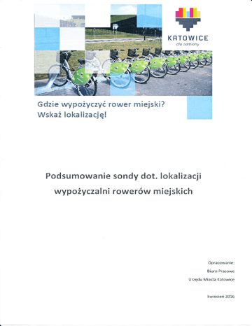 T I tl. KHTOWICE dlo odrni0ny Gdzie wypożyczyć rower miejski? Wskaż lokalizację! Podsu mowanie sondy dot. lokalizacji wypożyczaIni rowerów miejskich Opracowanie: Biuro Prasowe U rzędu Miasta Katowice kwiecień 2016 Cel sondy Uruchomione badanie miało na celu zebranie opinii mieszkańców Katowic w kwestii optymaInego pod kątem oczekiwań społecznych zlokalizowania mie.|skich stacji wypożyczania rowerów. Zasięg sondy Sonda była przeprowadzona wśród mieszkańców miasta Katowice. Termin przeprowadzenia sondy Ankietę można było uzupetnić od 1do 7 kwietnia 2016 roku. Formy przeprowadzenia sondy sonda została opublikowana w formie ankiety w wersji elektronicZnej na stronie katowice.eu, kon sultacje. katowice. eu, pks.katoWice.eu oraz na portalu społecznościowym Facebook. Ankieta składała się z.jednego pytania dot. lokalizacji Wypożyczalni rowerów w brzmieniu: Wybierz z poniższej listy maksymalnie 4lokalizdcje, w których Twoim zdoniem wypożyczolnio rowerów miejskich powinna powstoć jeszcze w tym roku oraZ metryczki, W której poproszono o zaznaczenia wiaściwego przedziału wiekowego oraz dzielnicę zamiesŻkania respondenta. W ankiecie wzięło udział 977 respondentów, w tym ważnie oddanych głosów było 958 (12 osób wypowiedziało się po czasie trwania sondażu, a 7 wypełniłobłędnie ankietę, oddając głos na więcej niŹ 4 lokalizacje stacji wypożyczania rowerów). Wyniki Mieszkańcy w sondażu mieli możliwośćwskazania wśród ośmiulokalizacji preferowane cztery miejsca. społecznej ocenie poddano następujące propozycje lokalizacji: . . . o o . . o Park Kościuszki Nikiszowiec ulica Mariacka (pomiędzy ul. Francuską a Placem im. ks. Emila Szramka) Plac Sejmu śląskiego Park Budnioka osiedle Paderewskiego prŻy Bibliotece śląskiej Zawodzie w rejonie kompleksu sportowego ''Słowian" Plac Grunwaldzki Najwięcej - 52% pytanych wskazało Park Kościuszkijako dobrą lokalizację wypożyczaIni rowerów (499 osób), niewiele mniej, bo 48% wskazalo teren przy Bibliotece śląskiejna osiedlu Paderewskiego (465 osób). Na trzecim miejscu uplasowała się propozycja zlokalizowania Wypożyczalni na ul. Mariackiej (429 osób), a na czwartym na Placu Sejmu śląskiego(354 osób). Najmniejsze poparcie zyskał teren przy kompleksie sportoWym ,,Słowian" na zawodziu- I5yo. Wybierz z poniższej listy maksymalnie 4lokalizacje, w których Twoim zdaniem wypożyczalnia rowerów miejskich powinna powstać ieszcze w tym roku ZaWodzie W rejonie komp eksu spońoWego "słoWian" Park Budnioka 199 -148 244 Plac Crunw"ldzk NikiŚzoWiec P ac sejmu śląskiego ulica Mariacka (pomiędzyu ' Francuską Placem im. ks. Emila sŻramka) a Osiedle Paderewskiego przy Bibl;otece śląskiej Park kościrrs7ki Wiek respondentów PRzEDzlAŁ WlEKoWY 18 lat i mniej 19-2Ą Żs-34 3S-44 45-54 55-64 65 i więcej 49 296 4Ż4 137 32 IA 6 Najliczniejszą grupą, która brała udział w badaniu, byli mieszkańcy w przedziale wiekowym 25-34 lata. Najmniej licznymi grupami wiekowym byli respondenci najstarsi - osoby w przedziale wiekowym 55-64 lata oraz powyżej 65 roku życia - łącznie stanowili zaledwie Ż%o ogółu badanych. Struktu ra wieku 450 424 400 350 296 300 250 2AO 100 49 5o o i m1ie' 18 lat 19 24 25-34 35-44 45-54 55-64 65 at i Więce. Miejsce zamieszkania DZIEINICA załę5ke Halda Os. c2ęść Ligota ś.ódmieśGie osiedle osi€dla załąże Osiedl. Dąb zgrzebnioka 199 Ż6 35 99 39 83 t7 14 s2 34 Ż3 7 8 DZIELNICA r14 Bogu.i.e Dąbrówka Mała 40 lŻ Murcki za 4A 33 6 - ochoi€. 34 Zarzecz. 7 Miejsce ulokalizowania miejskich wypożyczalni rowerów najchętniej wskazywali mieszkańcy śródmieścia(199 respondentów) oraz Koszutki (114 respondentów). Najrzadzie.j w sondzie wypowiadali się mieszkańcy południowych dzielni Katowic _ Zarzecza, Kostuchny, Podlesia oraz Murcek _ łącznie 3%o oEólU badanych. Dzielnice zamieszkania respondentóW Zawodzre zatzecze I 15 )7 ąałężef74 załęska Haida _ BrynóW częśćwschodnia -26 WelnoWiec.]ózefoWiec śródmieście Szopienice - Burowiec Podlesie Piotrowice - Ochojec Osiedle Witosa osiedIe Tysiąclecia Osiedle Paderewskiego- Muchowiec Mu.cki Ligota - Panewniki Koszutka Kostuchna ]anóW - Nikiszowiec Giszowiec Dąbrówka Mała Dąb Brynów częśćzachodnia osied]e Zgrzebnioka Bogucice 250