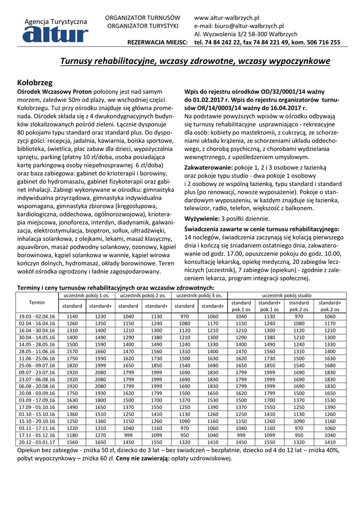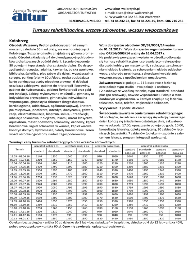 Agencja Turystyczna ORGANIZATOR TURNUSÓW ORGANIZATOR TURYSTYKI www.altur-walbrzych.pl e-mail: [email protected] Al. Wyzwolenia 3/2 58-300 Wałbrzych REZERWACJA MIEJSC: tel. 74 84 242 22, fax 74 84 221 49, kom. 506 716 255 Turnusy rehabilitacyjne, wczasy zdrowotne, wczasy wypoczynkowe Kołobrzeg Ośrodek Wczasowy Proton położony jest nad samym morzem, zaledwie 50m od plaży, we wschodniej części Kołobrzegu. Tuż przy ośrodku znajduje się główna promenada. Ośrodek składa się z 4 dwukondygnacyjnych budynków zlokalizowanych pośród zieleni. Łącznie dysponuje 80 pokojami typu standard oraz standard plus. Do dyspozycji gości: recepcja, jadalnia, kawiarnia, boiska sportowe, biblioteka, świetlica, plac zabaw dla dzieci, wypożyczalnia sprzętu, parking (płatny 10 zł/doba, osoba posiadająca kartę parkingową osoby niepełnosprawnej 6 zł/doba) oraz baza zabiegowa: gabinet do krioterapii i borowiny, gabinet do hydromasażu, gabinet fizykoterapii oraz gabinet inhalacji. Zabiegi wykonywane w ośrodku: gimnastyka indywidualna przyrządowa, gimnastyka indywidualna wspomagana, gimnastyka zbiorowa (kręgosłupowa, kardiologiczna, oddechowa, ogólnorozwojowa), krioterapia miejscowa, jonoforeza, interdyn, diadynamik, galwanizacja, elektrostymulacja, bioptron, sollux, ultradźwięki, inhalacja solankowa, z olejkami, lekami, masaż klasyczny, aquavibron, masaż podwodny solankowy, ozonowy, kąpiel borowinowa, kąpiel solankowa w wannie, kąpiel wirowa kończyn dolnych, hydromasaż, okłady borowinowe. Teren wokół ośrodka ogrodzony i ładnie zagospodarowany. Wpis do rejestru ośrodków OD/32/0001/14 ważny do 01.02.2017 r. Wpis do rejestru organizatorów turnusów OR/14/0003/14 ważny do 16.04.2017 r. Na podstawie powyższych wpisów w ośrodku odbywają się turnusy rehabilitacyjne usprawniająco - rekreacyjne dla osób: kobiety po mastektomii, z cukrzycą, ze schorzeniami układu krążenia, ze schorzeniami układu oddechowego, z chorobą psychiczną, z chorobami wydzielania wewnętrznego, z upośledzeniem umysłowym. Zakwaterowanie: pokoje 1, 2 i 3 osobowe z łazienką oraz pokoje typu studio - dwa pokoje 1 osobowy i 2 osobowy ze wspólną łazienką, typu standard i standard plus (po renowacji, nowsze wyposażenie). Pokoje o standardowym wyposażeniu, w każdym znajduje się łazienka, telewizor, radio, telefon, większość z balkonem. Wyżywienie: 3 posiłki dziennie. Świadczenia zawarte w cenie turnusu rehabilitacyjnego: 14 noclegów, świadczenia zaczynają się kolacją pierwszego dnia i kończą się śniadaniem ostatniego dnia, zakwaterowanie od godz. 17.00, opuszczenie pokoju do godz. 10.00, konsultację lekarską, opiekę medyczną, 20 zabiegów leczniczych (uczestnik), 7 zabiegów (opiekun) - zgodnie z zaleceniem lekarza, program integracji społecznej. Terminy i ceny turnusów rehabilitacyjnych oraz wczasów zdrowotnych: uczestnik pokój 1 os. Termin 19.03 - 02.04.16 02.04 - 16.04.16 16.04 - 30.04.16 30.04 - 14.05.16 14.05 - 28.05.16 28.05 - 11.06.16 11.06 - 25.06.16 25.06 - 09.07.16 09.07 - 23.07.16 23.07 - 06.08.16 06.08 - 20.08.16 20.08 - 03.09.16 03.09 - 17.09.16 17.09 - 01.10.16 01.10 - 15.10.16 15.10 - 29.10.16 03.11 - 17.11.16 17.11 - 01.12.16 20.12 - 03.01.17 uczestnik pokój 2 os. uczestnik pokój 3 os. standard standard+ standard standard+ standard standard+ 1140 1260 1310 1400 1500 1570 1750 1820 1920 1920 1920 1750 1630 1490 1360 1250 1220 1180 1560 1230 1350 1400 1490 1590 1660 1930 1999 2080 2080 2080 1930 1800 1650 1510 1360 1310 1270 1650 1040 1150 1210 1290 1400 1470 1620 1650 1799 1799 1799 1620 1500 1370 1250 1150 1040 999 1450 1130 1240 1300 1380 1490 1560 1730 1850 1999 1999 1999 1799 1700 1550 1410 1260 1160 1099 1550 970 1080 1120 1210 1240 1310 1500 1540 1690 1690 1690 1500 1370 1250 1130 1090 970 950 1320 1060 1170 1210 1300 1330 1400 1630 1680 1830 1830 1830 1650 1530 1390 1260 1160 1060 1040 1410 standard pok.1 os 1040 1150 1210 1290 1400 1470 1620 1650 1799 1799 1799 1620 1500 1370 1250 1150 1040 999 1450 uczestnik pokój studio standard+ standard pok.1 os pok.2 os 1130 970 1240 1080 1300 1120 1380 1210 1490 1240 1560 1310 1730 1500 1850 1540 1999 1690 1999 1690 1999 1690 1799 1500 1700 1370 1550 1250 1410 1130 1260 1090 1160 970 1099 950 1550 1320 standard+ pok.2 os 1060 1170 1210 1300 1330 1400 1630 1680 1830 1830 1830 1650 1530 1390 1260 1160 1060 1040 1410 Opiekun bez zabiegów - zniżka 50 zł, dziecko do 3 lat – bez świadczeń – bezpłatnie, dziecko od 4 do 12 lat – zniżka 40%, pobyt wypoczynkowy – zniżka 60 zł. Ceny nie zawierają: opłaty uzdrowiskowej. Świadczenia zawarte w cenie 7 dniowych wczasów wypoczynkowych: 7 noclegów, świadczenia zaczynają się kolacją pierwszego dnia i kończą się śniadaniem ostatniego dnia, zakwaterowanie od godz. 17.00, opuszczenie pokoju do godz. 10.00, program animacyjny podczas pobytu (ogniska, imprezy integracyjne, zwiedzanie miasta). Terminy i ceny 7 dniowych wczasów wypoczynkowych: uczestnik pokój 1 os. uczestnik pokój 2 os. uczestnik pokój 3 os. Termin sobota-sobota standard standard+ standard standard+ standard standard+ 19.03-30.04.16 30.04-25.06.16 25.06-27.08.16 27.08-01.10.16 01.10-29.10.16 02.11-17.11.16 625 825 989 825 625 625 720 950 1120 950 725 725 569 719 889 719 580 540 659 829 1049 829 650 590 529 679 819 679 499 480 615 799 915 799 560 540 standard 1 os. 569 719 889 719 580 540 uczestnik pokój studio standard+ standard standard+ 1 os. 2 os. 2 os. 659 529 615 829 679 799 1049 819 915 829 679 799 650 499 560 590 480 540 Dziecko do 3 lat z dwoma osobami dorosłymi - bez świadczeń - bezpłatnie, dziecko od 3 do 12 lat - zniżka 40%. Cena nie zawiera: opłaty uzdrowiskowej. Świadczenia zawarte w cenie 7 dniowych wczasów zdrowotnych – pakiet Zdrowie: 7 noclegów, świadczenia zaczynają się kolacją pierwszego dnia i kończą się śniadaniem ostatniego dnia, zakwaterowanie od godz. 17.00, opuszczenie pokoju do godz. 10.00, konsultacja lekarska, 2 zabiegi 