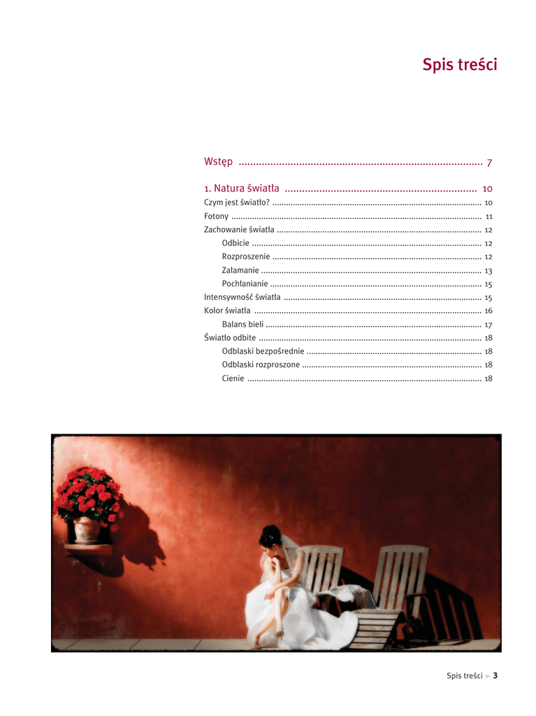 Spis treÊci Wst´p ..................................................................................... 7 1. Natura Êwiat∏a ................................................................... 10 Czym jest Êwiat∏o? ............................................................................................ 10 Fotony .............................................................................................................. 11 Zachowanie Êwiat∏a .......................................................................................... 12 Odbicie ..................................................................................................... 12 Rozproszenie ............................................................................................ 12 Za∏amanie ................................................................................................. 13 Poch∏anianie ............................................................................................. 15 IntensywnoÊç Êwiat∏a ....................................................................................... 15 Kolor Êwiat∏a .................................................................................................... 16 Balans bieli ............................................................................................... 17 Âwiat∏o odbite .................................................................................................. 18 Odblaski bezpoÊrednie ............................................................................. 18 Odblaski rozproszone ............................................................................... 18 Cienie ....................................................................................................... 18 Spis treÊci 3 2. Podstawy oÊwietlenia ................................... 21 Dwa podstawowe rodzaje Êwiat∏a ......................................... 21 Âwiat∏o g∏ówne .............................................................. 21 Âwiat∏o wype∏niajàce ..................................................... 23 WielkoÊç êród∏a Êwiat∏a ......................................................... 25 Pomiar Êwiat∏a ....................................................................... 26 Proporcje oÊwietlenia ............................................................ 26 OkreÊlanie proporcji oÊwietlenia ................................... 28 Proporcje oÊwietlenia i ich cechy ................................... 29 OÊwietlenie w technice wysokiego klucza ............................. 33 OÊwietlenie w technice niskiego klucza ................................. 33 3. Podstawy oÊwietlenia portretowego ............ 36 OÊwietlenie szerokie i wàskie ................................................ 36 Pi´ç podstawowych rodzajów oÊwietlenia portretowego ........ 38 OÊwietlenie typu paramount ......................................... 38 OÊwietlenie typu loop ................................................... 41 OÊwietlenie rembrandtowskie ....................................... 41 OÊwietlenie boczne ....................................................... 44 OÊwietlanie profilu ........................................................ 44 OÊwietlenie stosowane w fotografii mody (fashion lighting) ......... 46 4. Âwiat∏o zastane ................................................................. 47 Narz´dzia do modelowania Êwiat∏a zastanego ................................................. 47 Blendy ...................................................................................................... 47 Lustra ....................................................................................................... 54 Ekrany ...................................................................................................... 55 Zastawki ................................................................................................... 57 Âwiat∏o padajàce z okna ................................................................................... 61 Problemy .................................................................................................. 61 Strony Êwiata i pora dnia .......................................................................... 61 Ustawienie modela ................................................................................... 62 Pomiar ekspozycji .................................................................................... 64 Âwiat∏o wype∏niajàce ................................................................................ 64 Niestandardowy balans bieli .................................................................... 67 Rozpraszanie Êwiat∏a padajàcego z okna .................................................. 67 Âwiat∏o sztuczne .............................................................................................. 70 Âwiat∏o reflektora punktowego ........................................................................ 70 Âwiat∏o w plenerze ........................................................................................... 73 Dostosuj si´ do okolicznoÊci ............................................................................ 74 4 Âwiat∏o mieszane w praktyce Âwiat∏o na zewnàtrz ........................................................................................................ 75 Unikanie bezpoÊredniego Êwiat∏a s∏onecznego ....................................................... 76 Po∏udnie .................................................................................................................. 79 Niskie Êwiat∏o s∏oneczne ......................................................................................... 82 Po zachodzie s∏oƒca ................................................................................................ 83 T∏o .......................................