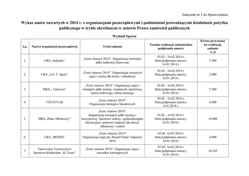Załącznik nr 3 do Sprawozdania Wykaz umów zawartych w 2014 r. z organizacjami pozarządowymi i podmiotami prowadzącymi działalność pożytku publicznego w trybie określonym w ustawie Prawo zamówień publicznych Wydział Sportu Kwota przyznana na realizację zadania w zł Nazwa organizacji pozarządowej Tytuł zadania Termin realizacji zadania/data podpisania umowy 1. UKS „Jedynka” „Ferie zimowe 2014”. Organizacja turniejów piłki siatkowej dziewcząt 03.02 - 16.02.2014 r. Data podpisania umowy: 16.01.2014 r. 3.500 2. UKS „A.C.T. Sport” „Ferie zimowe 2014”. Organizacja otwartych zajęć z tenisa dla dzieci i młodzieży 03.02 - 16.02.2014 r. Data podpisania umowy: 16.01.2014 r. 2.000 3. MKS „ Tarnovia” „Ferie zimowe 2014”. Organizacja zajęć i turniejów piłki nożnej, wspinaczki sportowej, tenisa stołowego, tenisa nożnego 03.02 - 16.02.2014 r. Data podpisania umowy: 16.01.2014 r. 5.300 4. TTS FUTAR „Ferie zimowe 2014”. Organizacja turniejów futsalowych 03.02 - 16.02.2014 r. Data podpisania umowy: 6.01.2014 r. 4.400 5. MKS „Pałac Młodzieży” „Ferie zimowe 2014”. Organizacja turniejów piłki ręcznej i koszykowej. Sportowe soboty- ogólnodostępne rekreacyjno- sportowe imprezy dla dzieci, młodzieży i rodzin 03.02 - 16.02.2014 r. Data podpisania umowy: 16.01.2014 r. 14.000 6. UKS „HESED” „Ferie zimowe 2014” Organizacja zajęć pn. Hesed Futsal Zaprasza 2014 03.02- 16.02.2014 r. Data podpisania umowy: 16.01.2014 r. 4.800 7. Tarnowskie Towarzystwo Sportowo-Kulturalne „K-Team” „Ferie zimowe 2014”. Organizacja zajęć i zawodów kartingowych 03.02- 16.02.2014 r. Data podpisania umowy: 16.01.2014 r. 10.265 Lp. 8. Katolickie Centrum Edukacji Młodzieży „KANA” „Ferie zimowe 2014” pn. „ KANA” Winter 2014” 03.02.2014- 16.02.2014/ Data podpisania umowy: 16.01.2014 r. 9.000 9. LOK( Liga Obrony Kraju) „Ferie zimowe 2014”-strzelectwo sportowe 03.02.2014- 16.02.2014/ Data podpisania umowy: 15.01.2014 r. 2.355 10. Parafialny Uczniowski Klub Sportowy „Karolina” „Lato w mieście”- bezpieczne wakacje 2014.Organizacja turnieju szachowego dla dzieci i młodzieży 12, 26, 07.2014/ Data podpisania umowy: 02.06.2014 r. 2.400 UKS „HESED” „Lato w mieście”- bezpieczne wakacje 2014. LETNIA AKADEMIA FUTSALU 2014. FUNINHO- PIŁKARSKA GRA TRÓJEK. 25.08.-29.08.2014 14.07-18.07.2014 Data podpisania umowy: 02.06.2014 r. 7.000 11. 30.06.2014 r. 01.07-04.07.2014 r. 21.07-25.07.2014 r. 28.07-31.07.2014 r. 01.08.2014 r. Data podpisania umowy: 02.06.2014 r. 01.07-04.07.2014 r. 10.07-15.07.2014 r. w każdy wtorek i czwartek miesiąca lipca i sierpnia/ Data podpisania umowy: 05.06.2014 r. UKS „ Kung Fu Vo Thuat Thanh Quyen” „Lato w mieście”- bezpieczne wakacje 2014. Lato z Kung Fu „ZKS UNIA” Tarnów „Lato w mieście”- bezpieczne wakacje 2014. Turniej Piłki Nożnej „MINI MUNDIAL 2014”. Zajęcia treningowe oraz zabawy z piłką nożną 14. KS „Iskra” „Lato w mieście”- bezpieczne wakacje 2014.” „Wakacje z Iskrą” turnieje piłki nożnej dla dzieci i młodzieży do lat 18 01,03,08,10,15.17,22, 24.07.2014 r. Data podpisania umowy: 18.06.2014 r. 9.500 15. UKS „Grabówka” „Lato w mieście”- bezpieczne wakacje 2014.” Młodzieżowa Liga Letnia U-14 i U-16 o Puchar Prezydenta Miasta Tarnowa 07.07-11.07.2014 r. 21.07- 25.07.2014 r. 28.07-31.07.2014 r. 13.500 12. 13. 2.300 14.500 2 Puchar Młodzieżowej Ligii Letniej 01.08.2014 r. 04.08.-08.08.2014 r. 18-22.08.2014 r. Data podpisania umowy: 30.06.2014 r. 16. Małopolski Związek Kolarski Organizacja Międzynarodowego Karpackiego Wyścigu Kurierów 2014 29.04-04.05.2014 r. Data podpisania umowy: 28.03.2014 r. 50.000 17. Tarnowskie Wodne Ochotnicze Pogotowie Ratunkowe Szkolenie polegające na organizacji w tarnowskich szkołach pogadanek na temat „Bezpieczeństwo nad wodą”, „ Kultura wypoczynku nad wodą”, „ Pierwsza pomoc” 01.02.-31.05.2014 r. Data podpisania umowy: 29.01.2014 r. 5.000 18. UKS „Kępa Sport” Organizacja imprezy pn.” Małopolskie Sprinty Rowerowe MTB 2014” 05.10.2014 r. Data podpisania umowy: 29.04.2014 r. 10.000 19. Tarnowski Okręgowy Związek Piłki Nożnej Organizacja „Halowej Ligii sezonu mistrzowskiego2013/2014” 16.02-01.03.2014 r. Data podpisania umowy: 14.02.2014 r. 4.000 Stowarzyszenie Piłki Ręcznej Prowadzenie zajęć w zakresie piłki ręcznej w liczbie 30godz. Prowadzenie pokazowych treningów piłki ręcznej w liczbie 10 godz. 24.03-24.04.2014 r. Data podpisania umowy: 02.04.2014 r. 5.000 MKS „ Pałac Młodzieży” Przygotowanie i organizacja udziału reprezentacji Tarnowa w sportowych rozgrywkach centralnych: Piłka ręczna chłopców-kategoria junior młodszy Piłka ręczna chłopców-kategoria młodzik Piłka ręczna dziewcząt-kategoria młodzik Koszykówka dziewcząt-kategoria Kadet A 20. 21. 11.03-13.04.2014 r. 09.05-11.05.2014 r. 16.05.-18.05.2014 r. 10.000 16.05.-18.05.2014 r. Data podpisania umowy: 14.04.2014 r. 3 UKS „Lider” Organizacja XIV Tarnowskiej Olimpiady Przedszkolaków 30.04-14-06.2014 r. Data podpisania umowy: 29.04.2014 23. UKS „Sokół- Mościce” Organizacja imprez pływackich z udziałem uczniów szkół podstawowych a także UKSów z terenu miasta Tarnowa na pływalni PWSZ 25.04, 16.05,06.06.2014 r. Data podpisania umowy: 24.04.2014 r. 24. Tarnowski Okręgowy Związek Piłki Nożnej 25. MKS „ Pałac Młodzieży” 26. 22. 15.762 5.000 07.06.2014 r. Data podpisania umowy: 28.05.2014 r. 4.000 „Lato w mieście”- bezpieczne wakacje 2014.”.Dotyczy prowadzenia zajęć piłki ręcznej chłopców i dziewcząt 16.06-16.07.2014 r. Data podpisania umowy: 16.06.2014 r. 10.000 Stowarzyszenie Sportowe Sokół Tarnów Wykonanie dokumentacji ścieżek i ciągów pieszo- rowerowych na terenie miasta Tarnowa 10.03-30.04.2014 r. Data podpisania umowy: 10.03.2014 r. 8.000 27. MKS „Tarnovia” VIII Międzynarodowy Turniej Piłki Nożnej im. Antoniego Barwińskieg
