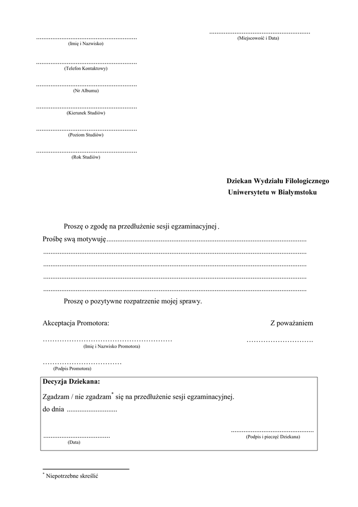 ........................................................ ........................................................ (Miejscowość i Data) (Imię i Nazwisko) ........................................................ (Telefon Kontaktowy) ........................................................ (Nr Albumu) ........................................................ (Kierunek Studiów) ........................................................ (Poziom Studiów) ........................................................ (Rok Studiów) Dziekan Wydziału Filologicznego Uniwersytetu w Białymstoku Proszę o zgodę na przedłużenie sesji egzaminacyjnej . Prośbę swą motywuję ............................................................................................................... .................................................................................................................................................. .................................................................................................................................................. .................................................................................................................................................. .................................................................................................................................................. Proszę o pozytywne rozpatrzenie mojej sprawy. Akceptacja Promotora: Z poważaniem ……………………………………………… ………………………. (Imię i Nazwisko Promotora) …………………………… (Podpis Promotora) Decyzja Dziekana: Zgadzam / nie zgadzam* się na przedłużenie sesji egzaminacyjnej. do dnia ............................ ..................................... (Data) * Niepotrzebne skreślić .............................................. (Podpis i pieczęć Dziekana)