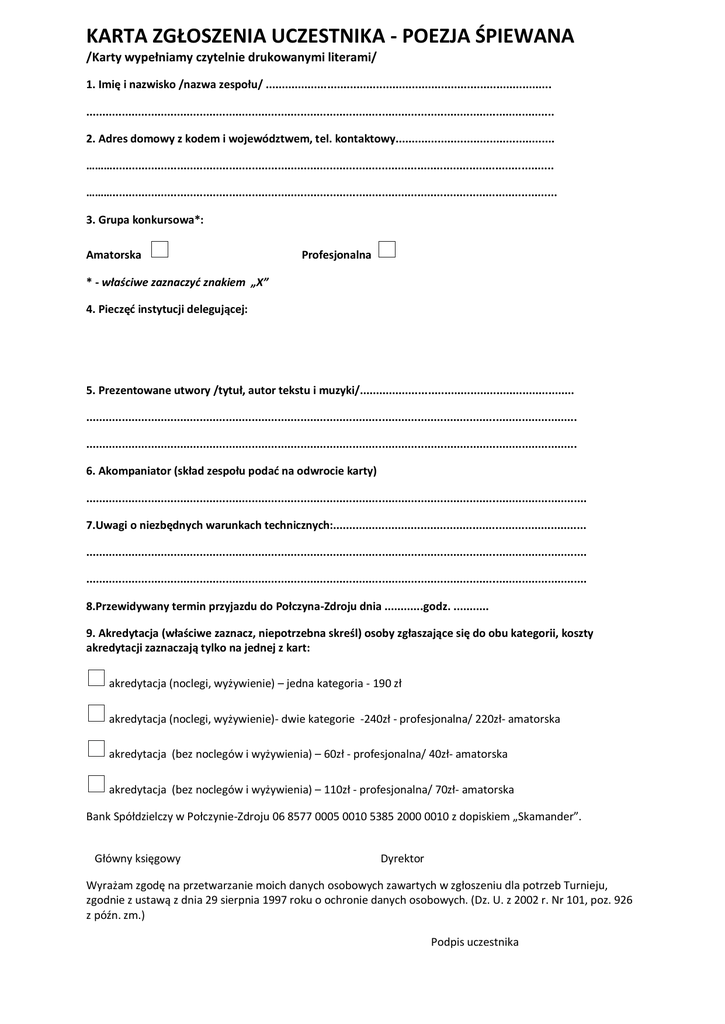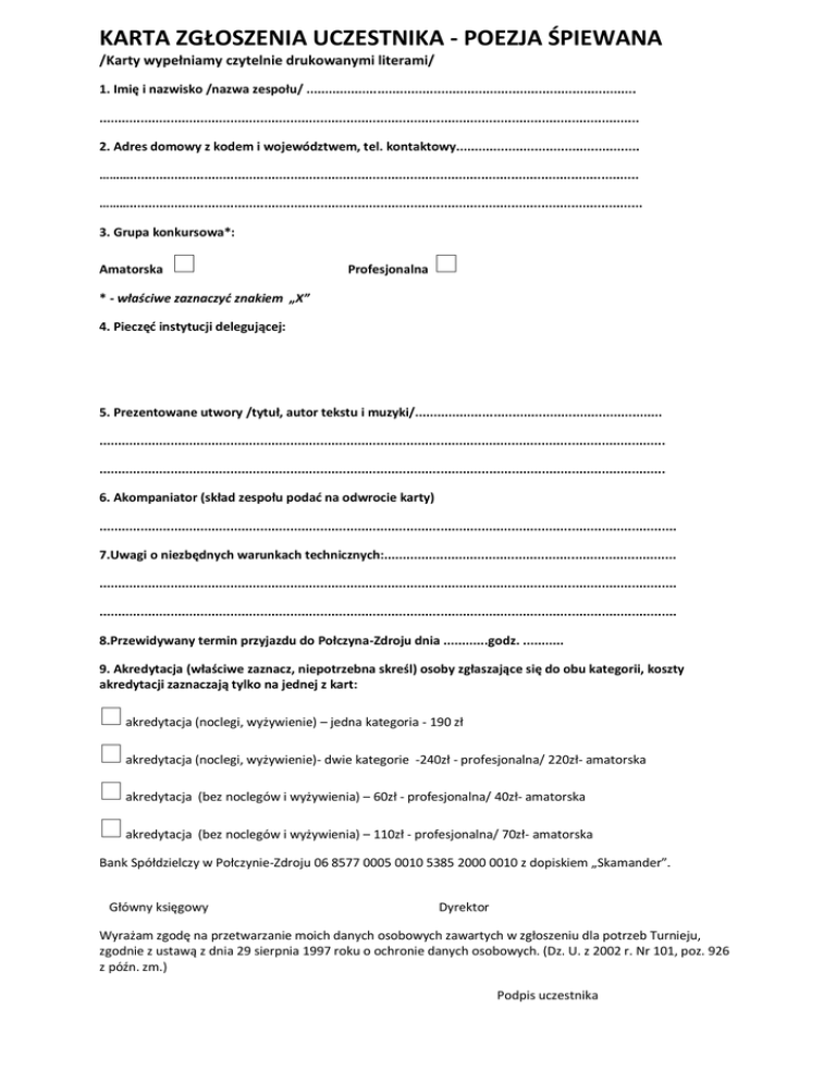 KARTA ZGŁOSZENIA UCZESTNIKA - POEZJA ŚPIEWANA /Karty wypełniamy czytelnie drukowanymi literami/ 1. Imię i nazwisko /nazwa zespołu/ ........................................................................................ ................................................................................................................................................ 2. Adres domowy z kodem i województwem, tel. kontaktowy................................................. ………........................................................................................................................................ ………......................................................................................................................................... 3. Grupa konkursowa*: Amatorska Profesjonalna * - właściwe zaznaczyć znakiem „X” 4. Pieczęć instytucji delegującej: 5. Prezentowane utwory /tytuł, autor tekstu i muzyki/.................................................................. ....................................................................................................................................................... ....................................................................................................................................................... 6. Akompaniator (skład zespołu podać na odwrocie karty) .......................................................................................................................................................... 7.Uwagi o niezbędnych warunkach technicznych:.............................................................................. .......................................................................................................................................................... .......................................................................................................................................................... 8.Przewidywany termin przyjazdu do Połczyna-Zdroju dnia ............godz. ........... 9. Akredytacja (właściwe zaznacz, niepotrzebna skreśl) osoby zgłaszające się do obu kategorii, koszty akredytacji zaznaczają tylko na jednej z kart: akredytacja (noclegi, wyżywienie) – jedna kategoria - 190 zł akredytacja (noclegi, wyżywienie)- dwie kategorie -240zł - profesjonalna/ 220zł- amatorska akredytacja (bez noclegów i wyżywienia) – 60zł - profesjonalna/ 40zł- amatorska akredytacja (bez noclegów i wyżywienia) – 110zł - profesjonalna/ 70zł- amatorska Bank Spółdzielczy w Połczynie-Zdroju 06 8577 0005 0010 5385 2000 0010 z dopiskiem „Skamander”. Główny księgowy Dyrektor Wyrażam zgodę na przetwarzanie moich danych osobowych zawartych w zgłoszeniu dla potrzeb Turnieju, zgodnie z ustawą z dnia 29 sierpnia 1997 roku o ochronie danych osobowych. (Dz. U. z 2002 r. Nr 101, poz. 926 z późn. zm.) Podpis uczestnika