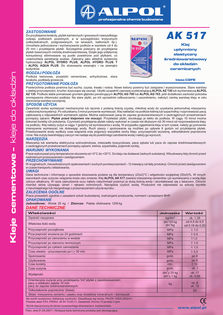 ZASTOSOWANIE AK 517 Klej up³ynniony elastyczny œredniowarstwowy do ok³adzin ceramicznych RODZAJ POD£O¯A Pod³o¿a betonowe, posadzki cementowe, anhydrytowe, stara terakota, podk³ady grzewcze. klasa C2FE PRZYGOTOWANIE POD£O¯A Powierzchnia pod³o¿a powinna byæ sucha, czysta, trwa³a i noœna. Nowe betony powinny byæ zwi¹zane i wysezonowane. Stare warstwy o s³abej przyczepnoœci, kruche i ³uszcz¹ce siê usun¹æ. Ubytki uzupe³niæ zapraw¹ szybkowi¹¿¹c¹ ALPOL AZ 130 lub wyrównawcz¹ ALPOL AZ 135. Pod³o¿e s³abe pomalowaæ gruntem g³êboko penetruj¹cym ALPOL AG 700 lub ALPOL AG 703, jeœli dodatkowo zachodzi potrzeba zmniejszenia ch³onnoœci pod³o¿a. Na stare p³ytki, po ich uprzednim odt³uszczeniu i uszorstnieniu, na³o¿yæ cienk¹ warstwê kleju w celu stworzenia warstwy szczepnej. SPOSÓB U¯YCIA Zawartoœæ worka wymieszaæ mechanicznie lub rêcznie z podan¹ iloœci¹ czystej, ch³odnej wody do uzyskania jednorodnej mieszaniny i za³o¿onej konsystencji. Po odczekaniu 3 minut ponownie wymieszaæ. Klej nak³adaæ na pod³o¿e kielni¹ lub szpachelk¹ i rozprowadzaæ pac¹ z¹bkowan¹ o odpowiednich wymiarach zêbów. Mo¿na zastosowaæ pacê do zapraw grubowarstwowych o zaokr¹glonych przestrzeniach pomiêdzy zêbami. P³ytek przed klejeniem nie moczyæ. Przyk³adaæ p³ytki, dociskaj¹c je lekko do pod³o¿a. W ci¹gu 10 minut mo¿na dokonaæ korekty ich po³o¿enia. Czynnoœæ przyklejania p³ytek nale¿y wykonaæ w czasie nie d³u¿szym ni¿ 30 minut od rozprowadzenia kleju na pod³o¿u. Klej nale¿y zu¿yæ w ci¹gu 1 godziny od wymieszania z wod¹. W przypadku zgêstnienia kleju w tym czasie, nale¿y go ponownie intensywnie wymieszaæ nie dolewaj¹c wody. Ruch pieszy i spoinowanie s¹ mo¿liwe po up³ywie 6 godzin od przyklejenia p³ytek. Przedozowanie wody wyd³u¿y czas wi¹zania oraz pogorszy wszystkie cechy kleju: przyczepnoœæ wczesn¹, odkszta³cenie poprzeczne i inne. Nie zu¿yty twardniej¹cy zaczyn nie nadaje siê do powtórnego zarobienia wod¹ i nale¿y go wyrzuciæ. NARZÊDZIA Mieszarka lub wiertarka elektryczna wolnoobrotowa, mieszad³o koszyczkowe, paca zêbata lub paca do zapraw œredniowarstwowych o zaokr¹glonych przestrzeniach pomiêdzy zêbami, kielnia, szpachelka, pojemnik na klej. WARUNKI WYKONANIA Prace wykonywaæ przy temperaturze otoczenia od +5°C do +30°C. Do kleju nie dodawaæ ¿adnych substancji. Wbudowany klej chroniæ przed nadmiernym przesuszeniem i zawilgoceniem. PRZECHOWYWANIE W oryginalnych, nieuszkodzonych opakowaniach i suchych pomieszczeniach - 12 miesiêcy od daty produkcji. Chroniæ przed zawilgoceniem w czasie transportu i sk³adowania. UWAGI Dane techniczne i informacje o sposobie stosowania podane s¹ dla temperatury (23±2)°C i wilgotnoœci wzglêdnej (50±5)%. W innych warunkach czas zu¿ycia i wi¹zania mo¿e ulec zmianie. Klej ALPOL AK 517 zawiera mieszaninê cementów i po wymieszaniu z wod¹ daje odczyn alkaliczny. W razie zabrudzenia oczu nale¿y natychmiast przemyæ je du¿¹ iloœci¹ wody i skontaktowaæ siê z lekarzem. Chroniæ równie¿ skórê u¿ywaj¹c ubrañ i rêkawic ochronnych. Narzêdzia czyœciæ wod¹. Producent nie odpowiada za szkody wynik³e z nieumiejêtnego lub niezgodnego z przeznaczeniem u¿ycia wyrobu. ZALECENIA OGÓLNE Prace prowadziæ zgodnie z zasadami sztuki budowlanej, instrukcjami producenta, normami i przepisami BHP. OPAKOWANIE Jednostkowe: Worek 25 kg / Zbiorcze: Paleta ofoliowana 1200 kg DANE TECHNICZNE W³a œ ciwo œ ci Jednostka Wartoœ æ Gêstoœæ nasypowa kg/dm3 dm3/25 kg 3 dm /kg ok. 1,39 od 4,5 do 5,0 od 0,18 do 0,20 1,0 0,5 1,0 1,0 1,0 W³aœciwa iloœæ wody Przyczepnoœæ pocz¹tkowa Przyczepnoœæ wczesna po 24 godzinach Przyczepnoœæ po zanurzeniu w wodzie Przyczepnoœæ po starzeniu termicznym Przyczepnoœæ po cyklach zamra¿ania Czas otwarty - przyczepnoœæ po t > 30 min. Wydajnoœæ Orientacyjne zu¿ycie przy przyklejaniu 1m2 p³ytek z zawstosowaniem: pacy o wielkoœci zêbów 10 mm pacy do zapraw œredniowarstwowych. Odkszta³cenie poprzeczne: (klasa) Sk³ad: mieszanina cementu i piasku oraz dodatków mineralnych i domieszek kg 0,5 po 6 po 6 10 ok. 1 ok. 17 ok. 0,68 VI Spoinowanie U¿ytkowanie Czas korekty Czas zu¿ycia MPa MPa MPa MPa MPa MPa godz. godz. min. godz. dm3 z 25 kg 3 dm z 1 kg IV IV IV IV IV IV Kleje cementowe - kleje do ok³adzin Do przyklejania terakoty, p³ytek kamiennych i gresowych nawszelkiego rodzaju pod³o¿ach poziomych, a w szczególnoœci krytycznych (odkszta³calnych, podgrzewanych, na tarasach, balkonach itp.). Umo¿liwia jednoczesne i wyrównywanie pod³o¿a w warstwie od 4 do 20 mm i przyklejanie p³ytek. Szczególnie polecany do przyklejania p³ytek basenowych metod¹ œredniowarstwow¹. Dziêki jego pó³p³ynnej konsystencji eliminowane s¹ pustki powietrzne pod p³ytkami, co uniemo¿liwia penetracjê wodzie. Zalecany jako sk³adnik systemów hydroizolacji ALPOL HYDRO PLUS, ALPOL HYDRO PLUS T i ALPOL AQUA PLUS. Do stosowania wewn¹trz i na zewn¹trz budynków. ok. 6 ok. 12 S2 Na wyrób wystawiono deklaracjê zgodnoœci. Klasyfikacja wg normy: PN-EN 12004:2002/A1. Posiada atest PZH. PKWiU: 26.64.10-00.11. Zawartoœæ chromu VI poni¿ej 2 ppm. Wyrób dopuszczony do obrotu i powszechego stosowania w budownictwie. Fidor, dnia 01.04.2007 r. Niniejsza karta techniczna produktu jest obowi¹zuj¹ca. 07 www.alpol.pl