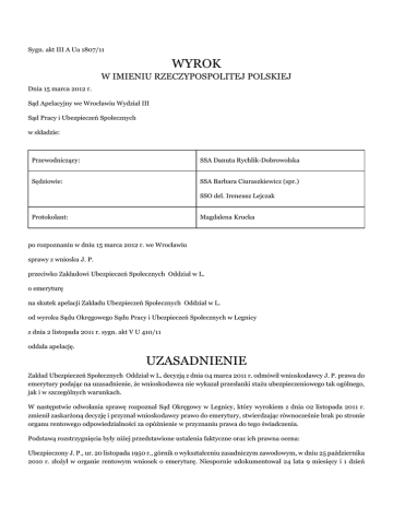 Sygn. akt III A Ua 1807/11 WYROK W IMIENIU RZECZYPOSPOLITEJ POLSKIEJ Dnia 15 marca 2012 r. Sąd Apelacyjny we Wrocławiu Wydział III Sąd Pracy i Ubezpieczeń Społecznych w składzie: Przewodniczący: SSA Danuta Rychlik-Dobrowolska Sędziowie: SSA Barbara Ciuraszkiewicz (spr.) SSO del. Ireneusz Lejczak Protokolant: Magdalena Krucka po rozpoznaniu w dniu 15 marca 2012 r. we Wrocławiu sprawy z wniosku J. P. przeciwko Zakładowi Ubezpieczeń Społecznych Oddział w L. o emeryturę na skutek apelacji Zakładu Ubezpieczeń Społecznych Oddział w L. od wyroku Sądu Okręgowego Sądu Pracy i Ubezpieczeń Społecznych w Legnicy z dnia 2 listopada 2011 r. sygn. akt V U 410/11 oddala apelację. UZASADNIENIE Zakład Ubezpieczeń Społecznych Oddział w L. decyzją z dnia 04 marca 2011 r. odmówił wnioskodawcy J. P. prawa do emerytury podając na uzasadnienie, że wnioskodawca nie wykazał przesłanki stażu ubezpieczeniowego tak ogólnego, jak i w szczególnych warunkach. W następstwie odwołania sprawę rozpoznał Sąd Okręgowy w Legnicy, który wyrokiem z dnia 02 listopada 2011 r. zmienił zaskarżoną decyzję i przyznał wnioskodawcy prawo do emerytury, stwierdzając równocześnie brak po stronie organu rentowego odpowiedzialności za opóźnienie w przyznaniu prawa do tego świadczenia. Podstawą rozstrzygnięcia były niżej przedstawione ustalenia faktyczne oraz ich prawna ocena: Ubezpieczony J. P., ur. 20 listopada 1950 r., górnik o wykształceniu zasadniczym zawodowym, w dniu 25 października 2010 r. złożył w organie rentowym wniosek o emeryturę. Niespornie udokumentował 24 lata 9 miesięcy i 1 dzień okresów składkowych i nieskładkowych. Organ rentowy uznał też okres pracy w szczególnych warunkach w rozmiarze 1 roku 3 miesięcy i 28 dni. Spór w sprawie dotyczył uzupełniającego ogólny staż ubezpieczeniowy wnioskodawcy okresu pracy w gospodarstwie rolnym rodziców od 01 lipca 1970 r. do 15 lipca 1971 r. oraz wykonywanej w szczególnych warunkach pracy w charakterze malarza konstrukcji na wysokości podczas zatrudnienia w okresie od 16 sierpnia 1971 r. do 10 marca 1978 r. w Przedsiębiorstwie (...) w O. nadto w okresie od 15 marca 1978 r. do 30 listopada 1985 r. w Przedsiębiorstwie (...) w L.. Odnośnie pierwszego z wymienionych warunków Sąd Okręgowy ustalił, że J. P. 28 marca 1970 r. przerwał zatrudnienie w Zakładach (...)w P. i podjął pracę w gospodarstwie rolnym rodziców położonym w W., w którym mieszkał od urodzenia. Rodzice wnioskodawcy, J. i Z. P., w okresie od 05 grudnia 1963 r. do 20 lutego 1974 r. prowadzili gospodarstwo rolne o powierzchni 4,97 ha, zaś wnioskodawca pracował w nim od 29 marca 1970 r. do 10 marca 1971 r. Od 11 marca do 06 sierpnia 1971 r. J. P. zatrudniony był w pełnym wymiarze czasu pracy w Okręgowym Zarządzie Wodnym we W., Oddział w J., jako robotnik regulacyjny. W kwestii drugiego, spornego warunku prawa do emerytury w niższym wieku emerytalnym, Sąd I instancji ustalił, że wnioskodawca w obydwu okresach zatrudnienia, to jest od 16 sierpnia 1971 r. do 10 marca 1978 r. w Przedsiębiorstwie (...) w O. oraz od 15 marca 1978 r. do 30 listopada 1985 r. w Przedsiębiorstwie (...) w L., stale i w pełnym wymiarze czasu pracy wykonywał prace malarskie konstrukcji na wysokości, mając do tej pracy stosowne uprawnienia. Przy użyciu związków ołowiu, czyli tzw. minii, farb, w których spoiwem jest chlorowany kauczuk i plastyfikatory oraz farb zawierających żywice chemoutwardzalne, zabezpieczał przed korozją i malował kominy przemysłowe, galerie konstrukcji stalowych urządzeń przenośno - transportowych, suwnice. Podczas zatrudnienia w Przedsiębiorstwie (...) wykonywał te prace także na budowach w byłej NRD, na podstawie skierowania do pracy przy realizacji zadań kontraktowych pracodawcy. Stan faktyczny sprawy, przytoczony tu w syntetycznej formie, Sąd Okręgowy ustalił w oparciu o dokumenty złożone do akt strony pozwanej, akta osobowe i przesłuchanie wnioskodawcy, zeznania świadków. Oceniając dowody przedstawione przez skarżącego, Sąd stwierdził, że „rozmiar i rodzaj prowadzonej działalności rolniczej uzasadniał pracę (wnioskodawcy) w gospodarstwie rolnym rodziców co najmniej w pełnym wymiarze czasu pracy. Praca wnioskodawcy w tym gospodarstwie nie była doraźna i nie miała charakteru zwyczajowej pomocy pracownika przy pracach rolnych”. Dalej Sąd Okręgowy stwierdził, że chociaż wnioskodawca nie przedstawił świadectw pracy w szczególnych warunkach z powodu likwidacji obu zakładów pracy, zachowały się archiwalne dokumenty, kompletne akta osobowe, które dały podstawę dla ustaleń faktycznych w powiązaniu z zeznaniami świadków. Te ostatnie były zgodne z zapisami zawartymi w aktach osobowych co do spornego charakteru pracy J. P.. W tej sytuacji J. P. spełnił ustawowe rygory, którymi ustawodawca obwarował nabycie prawa do emerytury w niższym wieku dla osób pracujących w szczególnych warunkach. Zaskarżona decyzja podlegała zmianie w sposób wskazany w sentencji wyroku Sądu Okręgowego. Organ rentowy wniósł apelację od opisanego wyroku, zarzucając naruszenie prawa materialnego art. 184 i art. 32 ustawy z 17 grudnia 1998 r. o emeryturach i rentach z FUS przez przyjęcie, że wnioskodawca nabył prawo do świadczenia z tytułu pracy w szczególnych warunkach w wyniku sprzecznego z rezultatami postępowania dowodowego ustalenia, że w spornych okresach wykonywał pracę uprawniającą do emerytury w niższym wieku emerytalnym. W szczególności apelujący zarzucił, że wątpliwe jest wykonywanie przez wnioskodawcę pracy w charakterze malarza konstrukcji na wysokości w sytuacji, gdy: • tytuł czeladnika w rzemiośle malarskim uzyskał 09 marca 1974 r., co oznacza, że przed tą datą nie mógł wykonywać prac malarskich konstrukcji na wysokości; • Przedsiębiorstwo (...) w L. tylko w niektórych miesiącach wypłaciło wnioskodawcy dodatek za szkodliw