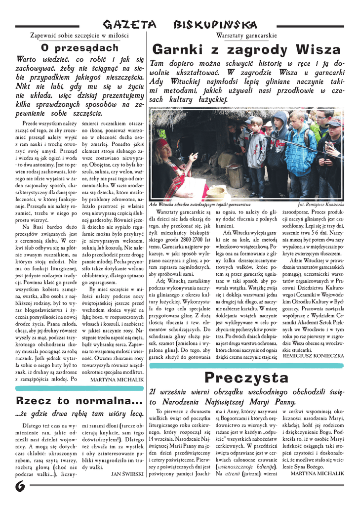 Zapewnić sobie szczęście w miłości Warsztaty garncarskie O przesądach Garnki z zagrody Wisza Warto wiedzieć, co robić i jak się zachowywać, żeby nie ściągnąć na siebie przypadkiem jakiegoś nieszczęścia. Nikt nie lubi, gdy mu się w życiu nie układa, więc dzisiaj prezentujemy kilka sprawdzonych sposobów na zapewnienie sobie szczęścia. Przede wszystkim należy zacząć od tego, że aby zrozumieć przesąd należy wyjść z ram nauki i trochę otworzyć swój umysł. Przesąd i wiedza są jak ogień i woda - to dwa antonimy. Jest to pewien rodzaj zachowania, którego nie idzie wyjaśnić w żaden racjonalny sposób, charakterystyczny dla danej społeczności, w której funkcjonuje. Przesądu nie należy rozumieć, trzeba w niego po prostu wierzyć. Na Rusi bardzo dużo przesądów związanych jest z ceremonią ślubu. W cerkwi ślub odbywa się na płótnie zwanym rucznikiem, na którym stoją młodzi. Nie ma on funkcji liturgicznej, jest jedynie rodzajem tradycji. Powinna kłaść go przede wszystkim kobieta zamężna, swatka, albo osoba z najbliższej rodziny, był to wyraz błogosławieństwa i życzenia pomyślności na nowej drodze życia. Panna młoda, chcąc, aby jej druhny również wyszły za mąż, podczas trzykrotnego obchodzenia ikony musiała pociągnąć za sobą rucznik. Jeśli jednak wytarła sobie o niego buty był to znak, iż druhny są zazdrosne z zamążpójścia młodej. Po śmierci rucznikiem otaczano ikonę, ponieważ wierzono w obecność ducha osoby zmarłej. Ponadto jakiś element stroju ślubnego zawsze zostawiano niewyprany. Obojętne, czy to była koszula, suknia, czy welon, ważne, żeby nie prać tego od momentu ślubu. W razie urodzenia się dziecka, które miałoby problemy zdrowotne, należało przetrzeć je właśnie ową niewypraną częścią ślubnej garderoby. Również jeżeli dziecko nie sypiało regularnie można było przykryć je niewypranym welonem, suknią lub koszulą. Nie należało przechodzić przez drogę pannie młodej. Pecha przynosiło także dotykanie welonu oblubienicy, dlatego spinano go asparagusem. By mieć szczęście w miłości należy podczas nocy świętojańskiej jeszcze przed wschodem słońca wyjść na łąkę boso, w rozpuszczonych włosach i koszuli, i nazbierać w jakieś naczynie rosy. Następnie trzeba napoić nią męża, bądź wybrankę serca. Zapewnia to wzajemną miłość i wierność. Owemu zbieraniu rosy towarzyszyła również niejednokrotnie specjalna modlitwa. Martyna Michalik Rzecz to normalna... ...że gdzie drwa rąbią tam wióry lecą. Dlatego też czas na wymienienie ran, jakie odnieśli nasi dzielni wojownicy. A mogą się dotychczas chlubić: ukruszonym zębem, raną szytą twarzy, rozbitą głową (choć nie podczas walki...), liczny- mi ranami dłoni (tarcze obcierają knykcie, sam tego doświadczyłem!). Dlatego też chwała im za wysiłek i oby zainteresowanie publiki wynagrodziło im trudy walki. Jan Świrski Tam dopiero można schwycić historię w ręce i ją dowolnie ukształtować. W zagrodzie Wisza u garncarki Ady Wituckiej najmłodsi lepią gliniane naczynie takimi metodami, jakich używali nasi przodkowie w czasach kultury łużyckiej. Ada Witucka zdradza zwiedzającym tajniki garncarstwa Warsztaty garncarskie są dla dzieci nie lada okazją do tego, aby przekonać się, jak żyli mieszkańcy biskupińskiego grodu 2800-2700 lat temu. Garncarka najpierw pokazuje, w jaki sposób wylepiano naczynia z gliny, a potem zaprasza najmłodszych, aby spróbowali sami. Adę Witucką zastaliśmy podczas wykonywania naczynia glinianego z okresu kultury łużyckiej. Wykorzystała do tego celu specjalnie przygotowana glinę. Z dużą ilością tłucznia i tzw. elementów schudzających. Do schudzania gliny służą: piasek, szamot (zmielona i wypalona glina). Do tego, aby garnek służył do gotowania na ogniu, to należy do gliny dodać tłucznia z polnych kamieni. Ada Witucka wylepia garnki nie na kole, ale metodą włeczkowo-wstążeczkową. Polega ona na formowaniu z gliny kilku dziesięciocentymetrowych wałków, które potem są przez garncarkę ugniatane w taki sposób, aby powstała wstążka. Wstążkę zwija się i dokleja warstwami jedna na drugiej tak długo, aż naczynie nabierze kształtu. W miarę doklejania wstążek naczynie jest wyklepywane w celu pozbycia się pęcherzyków powietrza. Po dwóch dniach dolepiana jest druga warstwa ochronna, która chroni naczynie od ognia dzięki czemu naczynie staje się fot. Remigiusz Konieczka żaroodporne. Proces produkcji naczyń glinianych jest czasochłonny. Lepi się je trzy dni, suszenie trwa 5-6 dni. Naczynia muszą być potem dwa razy wypalone, a w międzyczasie pokryte zwierzęcym tłuszczem. Adzie Wituckiej w prowadzeniu warsztatów garncarskich pomagają uczestniczki warsztatów organizowanych w Pracowni Dziedzictwa Kulturowego i Ceramiki w Wojewódzkim Ośrodku Kultury w Bydgoszczy. Pracownia nawiązała współpracę z Wydziałem Ceramiki Akademii Sztuk Pięknych we Wrocławiu i w tym roku po raz pierwszy w zagrodzie Wisza obecne są wrocławskie studentki. Remigiusz Konieczka Preczysta 21 września wierni obrządku wschodniego obchodzili święto Narodzenia Najświętszej Maryi Panny. To pierwsze z dwunastu wielkich świąt od początku liturgicznego roku cerkiewnego, który rozpoczął się 14 września. Narodzenie Najświętszej Marii Panny ma jeden dzień przedświąteczny i cztery poświąteczne. Pierwszy z poświątecznych dni jest poświęcony pamięci Joachi- ma i Anny, którzy nazywani są Bogootcami i których orędownictwo za wiernych wyrażane jest w każdym „odpuście” wszystkich nabożeństw cerkiewnych. W przeddzień święta odprawiane jest w cerkwiach całonocne czuwanie (wsienoszcznoje bdienije). Na utrenii (jutrzni) wierni w cerkwi wspominają okoliczności narodzenia Maryi, składają hołd jej rodzicom i dziękczynienie Bogu. Podkreśla to, iż w osobie Maryi ludzkość osiągnęła taki 