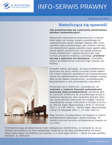 INFO-SERWIS PRAWNY Październik 2014 Niekończąca się opowieść Jak przedawniają się roszczenia stwierdzone tytułem wykonawczym? Roszczenie stwierdzone prawomocnym orzeczeniem sądu lub innego organu powołanego do rozpoznawania spraw danego rodzaju albo orzeczeniem sądu polubownego, jak również roszczenie stwierdzone ugodą zawartą przed sądem albo przed sądem polubownym lub ugodą zawartą przed mediatorem i zatwierdzoną przez sąd, w myśl przepisów kodeksu cywilnego, przedawnia się z upływem lat dziesięciu, chociażby termin przedawnienia roszczeń tego rodzaju był krótszy. Ponadto należy pamiętać, że bieg przedawnienia przerywa się przez każdą czynność przed sądem lub innym organem powołanym do rozpoznawania spraw lub egzekwowania roszczeń danego rodzaju albo przed sądem polubownym, przedsięwziętą bezpośrednio w celu dochodzenia roszczenia. Przyjmuje się w doktrynie i judykaturze, że wniosek o nadanie klauzuli wykonalności przerywa bieg przedawnienia, ponieważ jest to czynność konieczna do prawidłowego przeprowadzenia egzekucji, bez uzyskania bowiem klauzuli wykonalności wierzyciel nie mógłby uzyskać zaspokojenia swego roszczenia w drodze przymusu (Wyrok Sądu Najwyższego z dnia 12 stycznia 2012 r.,II CSK 203/11, Wyrok Sądu Najwyższego z dnia 23 listopada 2011 r., IV CSK 156/11). Bieg terminu przedawnienia nie biegnie w trakcie postępowania sądowego i egzekucyjnego. Po każdej przerwie terminu przedawnienia biegnie on na nowo. Przerwanie biegu przedawnienia może następować wielokrotnie, co oznacza to, że po każdym przerwaniu od dnia następnego rozpoczyna się bieg przedawnienia na nowo. Dług może ciążyć na dłużniku już zawsze, a w razie jego śmierci – także na jego spadkobiercach, tj. dzieciach. www.e-kancelaria.com