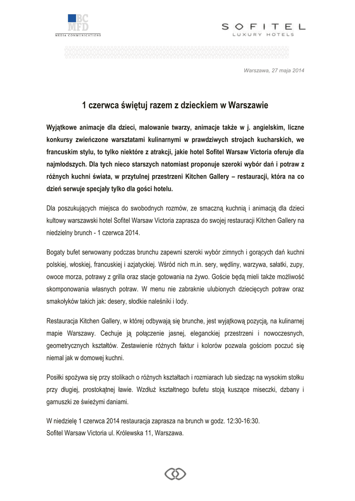 Warszawa, 27 maja 2014 1 czerwca świętuj razem z dzieckiem w Warszawie Wyjątkowe animacje dla dzieci, malowanie twarzy, animacje także w j. angielskim, liczne konkursy zwieńczone warsztatami kulinarnymi w prawdziwych strojach kucharskich, we francuskim stylu, to tylko niektóre z atrakcji, jakie hotel Sofitel Warsaw Victoria oferuje dla najmłodszych. Dla tych nieco starszych natomiast proponuje szeroki wybór dań i potraw z różnych kuchni świata, w przytulnej przestrzeni Kitchen Gallery – restauracji, która na co dzień serwuje specjały tylko dla gości hotelu. Dla poszukujących miejsca do swobodnych rozmów, ze smaczną kuchnią i animacją dla dzieci kultowy warszawski hotel Sofitel Warsaw Victoria zaprasza do swojej restauracji Kitchen Gallery na niedzielny brunch - 1 czerwca 2014. Bogaty bufet serwowany podczas brunchu zapewni szeroki wybór zimnych i gorących dań kuchni polskiej, włoskiej, francuskiej i azjatyckiej. Wśród nich m.in. sery, wędliny, warzywa, sałatki, zupy, owoce morza, potrawy z grilla oraz stacje gotowania na żywo. Goście będą mieli także możliwość skomponowania własnych potraw. W menu nie zabraknie ulubionych dziecięcych potraw oraz smakołyków takich jak: desery, słodkie naleśniki i lody. Restauracja Kitchen Gallery, w której odbywają się brunche, jest wyjątkową pozycją, na kulinarnej mapie Warszawy. Cechuje ją połączenie jasnej, eleganckiej przestrzeni i nowoczesnych, geometrycznych kształtów. Zestawienie różnych faktur i kolorów pozwala gościom poczuć się niemal jak w domowej kuchni. Posiłki spożywa się przy stolikach o różnych kształtach i rozmiarach lub siedząc na wysokim stołku przy długiej, prostokątnej ławie. Wzdłuż kształtnego bufetu stoją kuszące miseczki, dzbany i garnuszki ze świeżymi daniami. W niedzielę 1 czerwca 2014 restauracja zaprasza na brunch w godz. 12:30-16:30. Sofitel Warsaw Victoria ul. Królewska 11, Warszawa.