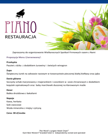 Zapraszamy do organizowanie Wielkanocnych Spotkań Firmowych razem z Nami Propozycja Menu I/serwowana/: Przekąska Pasztet z dzika z dodatkiem żurawiny i świeżych winogron Zupa Świąteczny żurek na zakwasie razowym w towarzystwie pieczonej białej kiełbasy oraz jajka Danie główne Soczysty schab marynowany z majerankiem i czosnkiem w sosie chrzanowym z dodatkiem kopytek szpinakowych oraz baby marchewki duszonej na klarowanym maśle Deser Babka drożdżowa z bakaliami Napoje Kawa, herbata Soki owocowe Woda mineralna z miętą i cytryną Cena: 38 zł/osoba The Word’s Largest Hotel Chain® Each Best Western branded hotel is independently owned and operated ® Propozycja Menu II/serwowana/: Przekąska Festiwal jajek: z pastą z łososia, pieczarek i makreli podanych na kruchych sałatach Zupa Krem z pieczonego pora i grillowanych ziemniaków z dodatkiem chrustów z boczku Damie główne Delikatna kaczka podana z ziemniakami po staropolsku, burakami i miodem oraz z pieczonym jabłkiem, żurawiną i pachnącym cynamonem Deser Waniliowa pascha wielkanocna Napoje Kawa, herbata Soki owocowe Woda mineralna z miętą i cytryną Cena: 42 zl/osoba The Word’s Largest Hotel Chain® Each Best Western branded hotel is independently owned and operated ® Propozycja Menu III/serwowana/: Przystawka Roladki schabowe faszerowane puree chrzanowo-maślanym Zupa Krem z zielonego groszku przyprawiany serem perłowym w towarzystwie chrupiącej grzanki Danie główne Polędwiczka wieprzowa faszerowana karmelizowanymi jabłkami w miodzie i maśle z dodatkiem borowikowego makaronu tagliatelle oraz sałatki z młodego szpinaku Deser Złocisty miodownik Napoje Kawa, herbata Soki owocowe Woda mineralna z miętą i cytryną Cena: 48 zł/osoba The Word’s Largest Hotel Chain® Each Best Western branded hotel is independently owned and operated ® CATERING Propozycja Menu I: Zupa Żurek na zakwasie razowym ze świeżo tartym chrzanem, pieczoną białą kiełbasą i jajkiem Bufet przekąskowy /zimny/ Jajka faszerowane: pastą z makreli, z twarożkiem, w majonezie z delikatną cebulką Pasztet drobiowy z żurawiną Rożki z ciasta francuskiego ze szpinakiem i sosem jogurtowo koperkowym Wybór wędlin z naszej wędzarni z dodatkiem domowej ćwikły ze świeżo tartym chrzanem Blanszowane brokuły z serem feta i jakiem polane greckim jogurtem naturalnym Mix świeżych sałat w towarzystwie kaszy jaglanej, suszonych pomidorów oraz szynki parmeńskiej Pieczywo, masło Deser Babka drożdżowa z bakaliami Sernik z rodzynkami Napoje Kawa, herbata Soki owocowe Woda mineralna z mięta i cytryną Cena: 44 zł/osoba The Word’s Largest Hotel Chain® Each Best Western branded hotel is independently owned and operated ® Propozycja Menu II: Zupa Żurek na zakwasie razowym ze świeżo tartym chrzanem, pieczoną białą kiełbasą i jajkiem Bufet przekąskowy /zimny/ Jajka faszerowane: pastą z makreli, z twarożkiem , w majonezie z delikatną cebulką Pasztet drobiowy z sosem tatarskim Terrina z dorsza na pumperniklu Rożki z ciasta francuskiego ze szpinakiem i sosem jogurtowo-koperkowym Wybór wędlin z naszej wędzarni z dodatkiem domowej ćwikły ze świeżo tartym chrzanem Sałatka nicejska z tuńczykiem, jajkiem, fasolką szparagową, sałatą rzymską i sosem vinegrette Bukiet sałat z wędzoną piersią kaczki, truskawkami i kremowym sosem balsmico Pieczywo ,masło Deser Babka drożdżowa z bakaliami Sernik z rodzynkami Napoje Kawa, Herbata Soki owocowe Woda mineralna z mięta i cytryną Cena: 75 zł/osoba The Word’s Largest Hotel Chain® Each Best Western branded hotel is independently owned and operated ® Propozycja Menu III: Zupa Żurek na zakwasie razowym ze świeżo tartym chrzanem, pieczoną białą kiełbasą i jajkiem Bufet przekąskowy /zimny/ Jajka faszerowane pastą z makreli, twarożkiem, w majonezie z delikatną cebulką Pasztet drobiowy z żurawiną Galantyna z kurczaka faszerowana soczystą wieprzowiną Kaczka faszerowana soczystą wieprzowiną i orzechami nerkowca Rożki z ciasta francuskiego ze szpinakiem i sosem jogurtowo-koperkowym Mix świeżych sałat z kaszą jaglaną, suszonymi pomidorami oraz szynką parmeńską Sałatka ze szpinaku baby, sera pleśniowego i sosu balsamicznego Pieczywo, masło Bufet przekąskowy /ciepły/ Pieczony schab w sosie śmietanowo-chrzanowym Eskalopki drobiowe zapiekane pod grillowaną cukinią Cukinia faszerowana kaszą kus kus i warzywami Ryż curry Ziemniaki puree z koprem Bukiet parowanych warzyw Deser Babka drożdżowa Sernik z rodzynkami Miodownik Napoje Kawa, Herbata Soki owocowe Woda mineralna z mięta i cytryną Cena: 90 zł/osoba The Word’s Largest Hotel Chain® Each Best Western branded hotel is independently owned and operated ® Zapraszamy Barbara Stawiarska Maja Bielecka Dyrektor Sprzedaży i Marketingu kom.505 466 348 e-mail:[email protected] Specjalista ds. marketingu kom.790 466 080 e-mail:[email protected] The Word’s Largest Hotel Chain® Each Best Western branded hotel is independently owned and operated ®