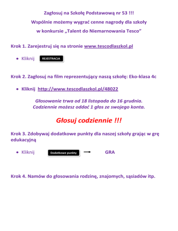 Zagłosuj na Szkołę Podstawową nr 53 !!! Wspólnie możemy wygrać cenne nagrody dla szkoły w konkursie „Talent do Niemarnowania Tesco” Krok 1. Zarejestruj się na stronie www.tescodlaszkol.pl Kliknij REJESTRACJA Krok 2. Zagłosuj na film reprezentujący naszą szkołę: Eko-klasa 4c Kliknij http://www.tescodlaszkol.pl/48022 Głosowanie trwa od 18 listopada do 16 grudnia. Codziennie możesz oddać 1 głos ze swojego konta. Głosuj codziennie !!! Krok 3. Zdobywaj dodatkowe punkty dla naszej szkoły grając w grę edukacyjną Kliknij Dodatkowe punkty GRA Krok 4. Namów do głosowania rodzinę, znajomych, sąsiadów itp.