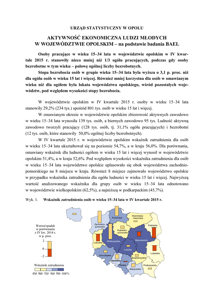 URZĄD STATYSTYCZNY W OPOLU AKTYWNOŚĆ EKONOMICZNA LUDZI MŁODYCH W WOJEWÓDZTWIE OPOLSKIM – na podstawie badania BAEL Osoby pracujące w wieku 15–34 lata w województwie opolskim w IV kwartale 2015 r. stanowiły nieco mniej niż 1/3 ogółu pracujących, podczas gdy osoby bezrobotne w tym wieku – połowę ogólnej liczby bezrobotnych. Stopa bezrobocia osób w grupie wieku 15–34 lata była wyższa o 3,1 p. proc. niż dla ogółu osób w wieku 15 lat i więcej. Również mniej korzystna dla osób w omawianym wieku niż dla ogółem była lokata województwa opolskiego, wśród pozostałych województw, pod względem wysokości stopy bezrobocia. W województwie opolskim w IV kwartale 2015 r. osoby w wieku 15–34 lata stanowiły 29,2% (234 tys.) spośród 801 tys. osób w wieku 15 lat i więcej. W omawianym okresie w województwie opolskim zbiorowość aktywnych zawodowo w wieku 15–34 lata wynosiła 139 tys. osób, a biernych zawodowo 95 tys. Ludność aktywną zawodowo tworzyli pracujący (128 tys. osób, tj. 31,1% ogółu pracujących) i bezrobotni (12 tys. osób, które stanowiły 50,0% ogólnej liczby bezrobotnych). W IV kwartale 2015 r. w województwie opolskim wskaźnik zatrudnienia dla osób w wieku 15–34 lata ukształtował się na poziomie 54,7%, a w kraju 56,0%. Dla porównania, omawiany wskaźnik dla ludności ogółem w wieku 15 lat i więcej wynosił w województwie opolskim 51,4%, a w kraju 52,6%. Pod względem wysokości wskaźnika zatrudnienia dla osób w wieku 15–34 lata województwo opolskie uplasowało się obok województwa zachodniopomorskiego na 8 miejscu w kraju. Również 8 miejsce zajmowało województwo opolskie w przypadku wskaźnika zatrudnienia dla ogółu ludności w wieku 15 lat i więcej. Najwyższą wartość analizowanego wskaźnika dla grupy osób w wieku 15–34 lata odnotowano w województwie wielkopolskim (62,5%), a najniższą w podkarpackim (45,7%). Wyk. 1. Wskaźnik zatrudnienia osób w wieku 15–34 lata w IV kwartale 2015 r. Warmińsko-mazurskie Pomorskie Wzrost/spadek w porównaniu z IV kw. 2014 r. w p. proc. 2 Zachodniopomorskie Podlaskie Kujawsko-pomorskie Lubuskie 0 –2 Mazowieckie Wielkopolskie Łódzkie Lubelskie Dolnośląskie Świętokrzyskie Opolskie Wskaźnik zatrudnienia Śląskie Podkarpackie Małopolskie 45,0 50,0 53,0 56,0 59,0 63,0 % W większości województw w IV kwartale 2015 r. wskaźnik zatrudnienia wśród osób w wieku 15–34 lata był wyższy niż dla ogółu ludności (w wieku 15 lat i więcej), a największa różnica (7,7 p. proc.) wystąpiła w województwie wielkopolskim. W województwie świętokrzyskim wskaźnik zatrudnienia dla obu omawianych grup ludności kształtował się na tym samym poziomie (52,0%), natomiast w trzech województwach: podlaskim, podkarpackim i lubelskim miernik dla rozpatrywanej grupy osób młodych był niższy niż dla ogółu (odpowiednio: o 2,5, o 2,3 i o 1,9 p. proc.). W odniesieniu do analogicznego kwartału 2014 r. wskaźnik zatrudnienia dla omawianej zbiorowości ludzi młodych w województwie opolskim zwiększył się o 1,2 p. proc. (w skali kraju wzrósł o 0,4 p. proc.). Stopa bezrobocia w IV kwartale 2015 r. w województwie opolskim wśród osób w wieku 15–34 lata ukształtowała się na poziomie 8,6% (wobec 5,5% dla ogółu ludności w wieku 15 lat i więcej) i była o 2,1 p. proc. niższa od wskaźnika ogólnokrajowego. Na przestrzeni roku stopa bezrobocia dla omawianej grupy osób w województwie opolskim zmalała o 0,4 p. proc. (w kraju – o 1,3 p. proc.). Wyk. 2. Stopa bezrobocia ludności w wieku 15–34 lata oraz w wieku 15 lat i więcej % 16,0 14,0 12,0 10,0 8,0 6,0 Ludność w wieku 15−34 lata Ludność w wieku 15 lat i więcej 4,0 2,0 0,0 I kw. II kw. III kw. 2014 IV kw. I kw. II kw. III kw. IV kw. 2015 Dla osób w wieku 15–34 lata stopa bezrobocia w poszczególnych kwartałach 2014 r. i 2015 r. była wyższa niż dla ogółu ludności w wieku 15 lat i więcej. Największa rozpiętość (5,7 p. proc.) występowała w II kwartale 2014 r., a najmniejsza (2,3 p. proc.) w II kwartale 2015 r. Różnica między analizowanymi wskaźnikami wzrosła w IV kwartale 2015 r. w porównaniu z analogicznym okresem ub. roku o 0,5 p. proc. W IV kwartale 2015 r. pod względem wysokości stopy bezrobocia dla rozpatrywanej grupy osób młodych województwo opolskie uplasowało się obok województwa dolnośląskiego i śląskiego na 3 miejscu w kraju. Dla porównania stopa bezrobocia dla ogółu ludności w wieku 15 lat i więcej sytuowała województwo opolskie na 2 miejscu w kraju. Omawiany miernik wśród osób w wieku 15–34 lata kształtował się w granicach od 7,4% w województwie wielkopolskim do 21,0% w województwie podkarpackim (dla ludności w wieku 15 lat i więcej wielkość stopy bezrobocia wahała się od 5,0% w województwie wielkopolskim do 11,7% w województwie podkarpackim). Wyk. 3. Stopa bezrobocia osób w wieku 15-34 lata w IV kwartale 2015 r. Wielkopolskie Pomorskie 10,7% Dolnośląskie Opolskie Śląskie Mazowieckie Łódzkie Lubuskie Małopolskie Kujawsko-pomorskie Podlaskie Zachodniopomorskie Warmińsko-mazurskie Świętokrzyskie Lubelskie Podkarpackie 0,0 5,0 10,0 15,0 20,0 25,0 %