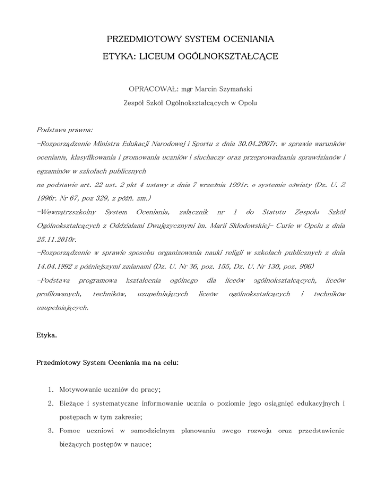 PRZEDMIOTOWY SYSTEM OCENIANIA ETYKA: LICEUM OGÓLNOKSZTAŁCĄCE OPRACOWAŁ: mgr Marcin Szymański Zespół Szkół Ogólnokształcących w Opolu Podstawa prawna: -Rozporządzenie Ministra Edukacji Narodowej i Sportu z dnia 30.04.2007r. w sprawie warunków oceniania, klasyfikowania i promowania uczniów i słuchaczy oraz przeprowadzania sprawdzianów i egzaminów w szkołach publicznych na podstawie art. 22 ust. 2 pkt 4 ustawy z dnia 7 września 1991r. o systemie oświaty (Dz. U. Z 1996r. Nr 67, poz 329, z późń. zm.) -Wewnątrzszkolny System Oceniania, załącznik nr 1 do Statutu Zespołu Szkół Ogólnokształcących z Oddziałami Dwujęzycznymi im. Marii Skłodowskiej- Curie w Opolu z dnia 25.11.2010r. -Rozporządzenie w sprawie sposobu organizowania nauki religii w szkołach publicznych z dnia 14.04.1992 z późniejszymi zmianami (Dz. U. Nr 36, poz. 155, Dz. U. Nr 130, poz. 906) -Podstawa programowa profilowanych, kształcenia techników, ogólnego uzupełniających dla liceów liceów ogólnokształcących, ogólnokształcących i liceów techników uzupełniających. Etyka. Przedmiotowy System Oceniania ma na celu: 1. Motywowanie uczniów do pracy; 2. Bieżące i systematyczne informowanie ucznia o poziomie jego osiągnięć edukacyjnych i postępach w tym zakresie; 3. Pomoc uczniowi w samodzielnym planowaniu swego rozwoju oraz przedstawienie bieżących postępów w nauce; 4. Dostarczenie bieżącej informacji o trudnościach w przyswajaniu wiedzy przez uczniów; 5. Umożliwienie nauczycielowi doskonalenia organizacji pracy na lekcji; Narzędzia sprawdzania wiedzy i umiejętności: 1. Ćwiczenia na zajęciach; 2. Wypowiedzi ustne; 3. Prace pisemne; Sposoby informowania o wymaganiach: 1. Uczniowie są zapoznawani z wymaganiami na stopnie (PSO) na pierwszych zajęciach każdego roku szkolnego; 2. Każdy uczeń, jak i jego opiekun prawny może zapoznać się z wymaganiami na poszczególne stopnie z etyki (PSO) w trakcie roku szkolnego, po wcześniejszym zgłoszeniu takiej potrzeby u nauczyciela prowadzącego lub dyrekcji szkoły; 3. Za pośrednictwem strony internetowej szkoły; Zasady poprawiania stopni: 1. Uczniowie mogą zgłosić chęć poprawiania stopni; 2. Poprawa przeprowadzana jest w formie pisemnej; 3. Poprawa stopnia może być przeprowadzona w okresie dwóch tygodni od wystawienia oceny lub absencji ucznia na zajęciach; 4. Poprawa oceny semestralnej odbywa się w terminie określonym przez Radę Pedagogiczną, jednak nie później, niż 6. tygodni po zakończeniu semestru; 5. Poprawiane oceny pozostają ocenami branymi pod uwagę w trakcie klasyfikacji; Wymagania na stopnie: Ocenę niedostateczną otrzymuje uczeń, który: 1. Nie opanował wiadomości określanych w wymaganiach edukacyjnych określonych w podstawie programowej dla przedmiotu etyka w danym roku szkolnym; 2. Nie jest w stanie wykonać zadań o elementarnym stopniu trudności; 3. Unika wykonania zadań przewidzianych w programie nauczania i w programie lekcji; Ocenę dopuszczającą otrzymuje uczeń, który: 1. Ma braki w opanowaniu materiału programowego, ale braki te nie przekreślają możliwości uzyskania przez ucznia podstawowej wiedzy w ciągu dalszej nauki; 2. Wykonuje zadania typowe, o niewielkim stopniu trudności; 3. Wykonuje zadania przewidziane w programie nauczania na poziomie elementarnym, niepełnym, przy wsparciu innych osób; Ocenę dostateczną otrzymuje uczeń, który: 1. Opanował wiadomości i umiejętności określone w podstawie programowej na poziomie nieprzekraczającym wymagań podstawy programowej; 2. Wykonuje typowe zadania o średnim stopniu trudności; 3. Wykonuje zadania przewidziane w programie nauczania i programie lekcji samodzielnie; 4. Konstruuje wypowiedzi ustne i pisemne, wewnętrznie uporządkowane; Ocenę dobrą otrzymuje uczeń, który: 1. Nie opanował w pełni wiadomości określanych programem nauczania w danej klasie, ale opanował je na poziomie przekraczającym wymagania zawarte w podstawie programowej; 2. Poprawnie wykorzystuje wiadomości, wykonuje samodzielnie typowe zadania; 3. Buduje samodzielne wypowiedzi łączące wiedzę z wielu tematów i mające charakter interdyscyplinarny; 4. Tworzy płaszczyznę zadań wykonywanych na zajęciach; 5. Wartościuje źródła informacji i określa te, które mają szczególne znaczenie; 6. Podejmuje próby samodzielnych dociekań etycznych; 7. Potrafi przyjmować określone role w zespole i współpracować przy wykonaniu określonego zadania; Ocenę bardzo dobrą otrzymuje uczeń, który: 1. Opanował pełny zakres wiedzy i umiejętności określony programem nauczania przedmiotu w danym roku szkolnym; 2. Sprawnie posługuje się zdobytymi wiadomościami, rozwiązuje samodzielny problem; 3. Potrafi zastosować posiadaną wiedzę do rozwiązywania zadań i problemów w nowych sytuacjach; 4. Inicjuje działania i dyskusje, w których prezentuje własne przemyślenia i potrafi je uargumentować; 5. Odnosi się i tłumaczy, posługując się argumentami, wydarzenia i problemy o charakterze moralnym; 6. Sprawdza i analizuje przyczyny i skutki wydarzeń i zmian oraz dostrzega związki między nimi; 7. Opisuje i wyjaśnia różne interpretacje wydarzeń, zmian i działań; 8. Na podstawie posiadanej wiedzy wartościuje i wyróżnia źródła informacji, krytycznie je wykorzystuje w celu sformułowania wniosków; 9. Podejmuje samodzielne dociekania etyczne, ujawniając kreatywność w myśleniu i pomysłowość w prezentacji rozwiązywanych problemów; Ocenę celującą otrzymuje uczeń, który: 1. Spełnia wymogi uzyskania oceny bardzo dobrej; 2. Podejmuje działania wykraczające poza uczestnictwo w zajęciach lekcyjnych, które mają charakter upowszechniania wskazań etyki, wcielania w życie zasad moralnych poprze między innymi: 1. Udział w konkursach; 2. Zaangażowanie w pracę organizacji humanitarnych, promujących tolerancję; 3. Organizację akademii, warsztatów, happeningów upowszechniających zasady etyki;