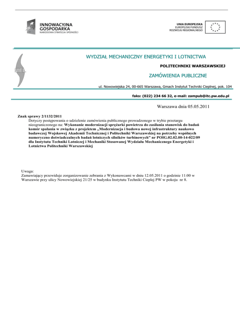 WYDZIAŁ MECHANICZNY ENERGETYKI I LOTNICTWA POLITECHNIKI WARSZAWSKIEJ ZAMÓWIENIA PUBLICZNE ul. Nowowiejska 24, 00-665 Warszawa, Gmach Instytut Techniki Cieplnej, pok. 104 faks: (022) 234 66 32, e-mail: [email protected] Warszawa dnia 05.05.2011 Znak sprawy 2/1132/2011 Dotyczy postępowania o udzielenie zamówienia publicznego prowadzonego w trybie przetargu nieograniczonego na: Wykonanie modernizacji sprężarki powietrza do zasilania stanowisk do badań komór spalania w związku z projektem „Modernizacja i budowa nowej infrastruktury naukowo badawczej Wojskowej Akademii Technicznej i Politechniki Warszawskiej na potrzeby wspólnych numeryczno doświadczalnych badań lotniczych silników turbinowych” nr POIG.02.02.00-14-022/09 dla Instytutu Techniki Lotniczej i Mechaniki Stosowanej Wydziału Mechanicznego Energetyki i Lotnictwa Politechniki Warszawskiej Uwaga: Zamawiający przewiduje zorganizowanie zebrania z Wykonawcami w dniu 12.05.2011 o godzinie 11:00 w Warszawie przy ulicy Nowowiejskiej 21/25 w budynku Instytutu Techniki Cieplej PW w pokoju nr 8.