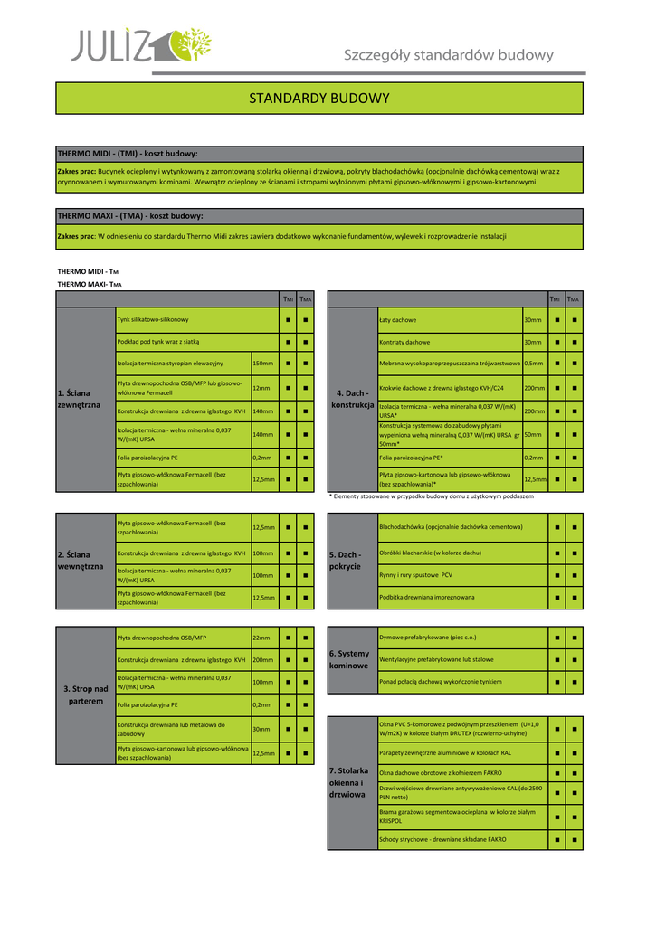 STANDARDY BUDOWY THERMO MIDI - (TMI) - koszt budowy: Zakres prac: Budynek ocieplony i wytynkowany z zamontowaną stolarką okienną i drzwiową, pokryty blachodachówką (opcjonalnie dachówką cementową) wraz z orynnowanem i wymurowanymi kominami. Wewnątrz ocieplony ze ścianami i stropami wyłożonymi płytami gipsowo-włóknowymi i gipsowo-kartonowymi THERMO MAXI - (TMA) - koszt budowy: Zakres prac: W odniesieniu do standardu Thermo Midi zakres zawiera dodatkowo wykonanie fundamentów, wylewek i rozprowadzenie instalacji THERMO MIDI - TMI THERMO MAXI- TMA TMI TMA Tynk silikatowo-silikonowy Podkład pod tynk wraz z siatką 1. Ściana zewnętrzna Izolacja termiczna styropian elewacyjny 150mm Płyta drewnopochodna OSB/MFP lub gipsowowłóknowa Fermacell 12mm Konstrukcja drewniana z drewna iglastego KVH 140mm Izolacja termiczna - wełna mineralna 0,037 W/(mK) URSA 140mm Folia paroizolacyjna PE 0,2mm Płyta gipsowo-włóknowa Fermacell (bez szpachlowania) 12,5mm ▪ ▪ ▪ ▪ ▪ ▪ ▪ ▪ ▪ ▪ ▪ ▪ ▪ ▪ ▪ ▪ TMI TMA Łaty dachowe 30mm Kontrłaty dachowe 30mm Mebrana wysokoparoprzepuszczalna trójwarstwowa 0,5mm 4. Dach konstrukcja Krokwie dachowe z drewna iglastego KVH/C24 200mm Izolacja termiczna - wełna mineralna 0,037 W/(mK) URSA* 200mm Konstrukcja systemowa do zabudowy płytami wypełniona wełną mineralną 0,037 W/(mK) URSA gr 50mm 50mm* Folia paroizolacyjna PE* 0,2mm Płyta gipsowo-kartonowa lub gipsowo-włóknowa (bez szpachlowania)* 12,5mm ▪ ▪ ▪ ▪ ▪ ▪ ▪ ▪ ▪ ▪ ▪ ▪ ▪ ▪ ▪ ▪ ▪ ▪ ▪ ▪ ▪ ▪ ▪ ▪ * Elementy stosowane w przypadku budowy domu z użytkowym poddaszem 2. Ściana wewnętrzna 3. Strop nad parterem Płyta gipsowo-włóknowa Fermacell (bez szpachlowania) 12,5mm Konstrukcja drewniana z drewna iglastego KVH 100mm Izolacja termiczna - wełna mineralna 0,037 W/(mK) URSA 100mm Płyta gipsowo-włóknowa Fermacell (bez szpachlowania) 12,5mm Płyta drewnopochodna OSB/MFP 22mm Konstrukcja drewniana z drewna iglastego KVH 200mm Izolacja termiczna - wełna mineralna 0,037 W/(mK) URSA 100mm Folia paroizolacyjna PE 0,2mm Konstrukcja drewniana lub metalowa do zabudowy 30mm Płyta gipsowo-kartonowa lub gipsowo-włóknowa 12,5mm (bez szpachlowania) ▪ ▪ ▪ ▪ ▪ ▪ ▪ ▪ ▪ ▪ ▪ ▪ ▪ ▪ ▪ ▪ ▪ ▪ ▪ ▪ Blachodachówka (opcjonalnie dachówka cementowa) 5. Dach pokrycie Obróbki blacharskie (w kolorze dachu) Rynny i rury spustowe PCV Podbitka drewniana impregnowana Dymowe prefabrykowane (piec c.o.) 6. Systemy kominowe Wentylacyjne prefabrykowane lub stalowe Ponad połacią dachową wykończonie tynkiem Okna PVC 5-komorowe z podwójnym przeszkleniem (U=1,0 W/m2K) w kolorze białym DRUTEX (rozwierno-uchylne) Parapety zewnętrzne aluminiowe w kolorach RAL 7. Stolarka okienna i drzwiowa Okna dachowe obrotowe z kołnierzem FAKRO Drzwi wejściowe drewniane antywyważeniowe CAL (do 2500 PLN netto) Brama garażowa segmentowa ocieplana w kolorze białym KRISPOL Schody strychowe - drewniane składane FAKRO ▪ ▪ ▪ ▪ ▪ ▪ ▪ ▪ ▪ ▪ ▪ ▪ ▪ ▪ ▪ ▪ ▪ ▪ 8. Instalacja Elektryczna TMI TMA 12. Fundamenty TMI TMA Roboty ziemne ▫ ▪ Pokój dzienny, kuchnia 4 szt - podwójne gniazdka , 2 szt - punkty oświetleniowe wraz z wyłacznikiem ▫ ▪ Sypialnia, gabinet 3 szt - podwójne gniazdka , 1 szt - punkt oświetleniowy wraz z wyłacznikiem Łazienka, WC, korytarz 1 szt - podwójne gniazdko , 1 szt - punkt oświetleniowy wraz z wyłacznikiem jadalnia, kotłownia 1 szt - podwójne gniazdko , 1 szt - punkt oświetleniowy wraz z wyłacznikiem klatka schodowa 1 szt - podwójne gniazdko , 1 szt - punkt oświetleniowy wraz z 2 wyłacznikami ▫ ▫ ▫ ▫ ▫ ▫ ▫ ▫ ▫ ▫ Rozprowadzenie instalacji elektrycznej od skrzynki bezpiecznikowej Zewnętrzny punkt oswietleniowy (balkon lub taras) oraz punkt zasilający (ściana) włącznik wewnątrz domu Gniazdo antenowe na parterze i poddaszu Gniazdo telefoniczne na parterze i poddaszu Dzwonek na korytarzu parteru Rozdzielnia RG nadtynkowa ▪ ▪ ▪ ▪ ▪ ▪ ▪ ▪ ▪ ▪ Ławy żelbetowe Ściany fundamentowe z betonu lub bloczków betonowych zakończone wieńcem żelbetowym (do 110 cm) Izolacja termiczna pionowa fundamentu - polistyren ekstrudowany (XPS) - 10 cm Warstwa osłonowa z siatki z włókna szklanego zatopiona w masie klejowej Podsypka piaskowa zagęszczona mechanicznie ~15 cm Instalacja kanalizacji sanitarnej poziomu 0 Izolacja termiczna pozioma - styropian EPS -gr. 12 cm Warstwa chudego betonu betonem B-10 gr. 10cm 9. Instalacja Gazowa Podsypka piaskowa zagęszczona mechanicznie ~20 cm ▫ ▪ ▪ ▪ ▪ ▪ ▪ ▪ ▪ ▪ ▫ ▫ ▫ ▫ ▪ ▪ ▪ ▪ ▫ ▫ ▫ ▫ ▪ ▪ ▪ ▪ 13. Płyta fundamentowa* Roboty ziemne instalacja gazowa wykonana w świetle konstrukcji budynku - rury stalowe bez szwu ▫ ▫ ▫ ▫ ▫ ▫ ▫ ▫ Izolacja termiczna pozioma 12cm - styropian EPS Płyta żelbetowa gr 12 cm z poszerzeniami do ok 25cm pod ścianami konstrukcyjnymi 10. Instalacaja C.O. Instalacja c.o. wykonana wg projektu (system rozdzielaczowy lub trójnikowy) rury PEX/AL./PEX w izolacji z pianki poliuretanowej ▫ ▪ 14. Wylewki Parter 10a. Instalacaja C.O. - osprzęt Piec dwufunkcyjny z zasobnikiem 120L wraz z osprzętem VIESSMANN Grzejniki panelowe z głowicami termostatycznymi ▫ ▫ ▫ ▫ Wylewka cementowa 60mm Izolacja z płyt styropianowych 30mm wylewka cementowa 60mm Izolacja z płyt styropianowych 30mm Poddasze 11. Instalacaja wod-kan Wykonanie instalacji kanalizacji wewnętrznej poziomej i pionowej - rury PCV, bez białego montażu Wykonanie instalacji wody do punktów czerpalnych wg projektu - rury zgrzewane PP, bez białego montażu ▫ ▪ ▫ ▪ Zakres obejmuje a) prace projektowe b )załadunek i transport materiałów c) montaż elementów ( dźwig do 25T) d) dojazd i zakwaterowanie ekipy montażowej e) wysokość kondygnacji maksymalnie 265 cm f) Oferta zakłada wykonanie fundamentów/płyty fundamentowej dla typ