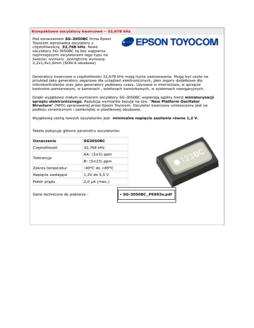 Kompaktowe oscylatory kwarcowe – 32,678 kHz Pod oznaczeniem SG-3050BC firma Epson Toyocom wprowadza oscylatory z częstotliwością 32,768 kHz. Nowe oscylatory SG-3050BC są bez wątpienia najmniejszymi oscylatorami tego typu na świecie; wymiary zewnętrzne wynoszą: 2,2x1,4x1,0mm (SON-6 obudowa) Generatory kwarcowe o częstotliwości 32,678 kHz mają liczne zastosowania. Mogą być użyte na przykład jako generatory zegarowe dla urządzeń elektronicznych, jako zegary dodatkowe dla mikrokontrolerów oraz jako generatory podstawy czasu. Używane w miernictwie, w sprzęcie kontrolno-pomiarowym, w kamerach , telefonach komórkowych, w systemach nawigacyjnych. Dzięki wyjątkowo małym wymiarom oscylatory SG-3050BC wspierają ogólny trend miniaturyzacji sprzętu elektronicznego. Redukcja wymiarów bazuje na tzw. "New Platform Oscillator Structure" (NPO) opracowanej przez Epson Toyocom. Oscylator kwarcowy umieszczony jest na podłożu ceramicznym i zamkniętej w plastikowej obudowie. Wyjątkową cechą nowych oscylatorów jest minimalne napięcie zasilania równe 1,2 V. Tabela pokazuje główne parametry oscylatorów: Oznaczenie SG3050BC Częstotliwość 32,768 kHz Tolerancja AA: (5±5) ppm B: (5±23) ppm Zakres temperatur -40°C do +85°C Napięcie zasilające 1,2V do 5,5 V Pobór prądu 2,0 µA (max.) Dane techniczne do pobrania : • SG-3050BC_PE093a.pdf