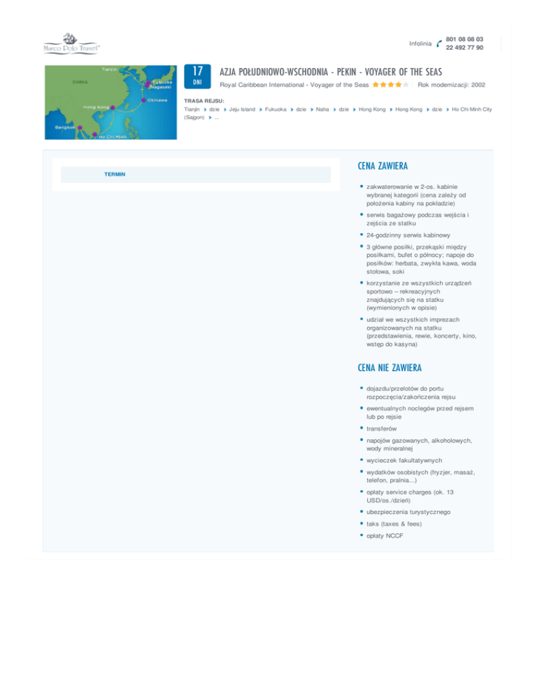 801 08 08 03 22 492 77 90 Infolinia 17 AZJA POŁUDNIOWO-WSCHODNIA - PEKIN - VOYAGER OF THE SEAS DNI Royal Caribbean International - Voyager of the Seas | Rok modernizacji: 2002 TRASA REJSU: Tianjin (Sajgon) TERMIN dzie Jeju Island Fukuoka dzie Naha dzie Hong Kong Hong Kong dzie Ho Chi Minh City ... CENA ZAWIERA zakwaterowanie w 2-os. kabinie wybranej kategorii (cena zależy od położenia kabiny na pokładzie) serwis bagażowy podczas wejścia i zejścia ze statku 24-godzinny serwis kabinowy 3 główne posiłki, przekąski między posiłkami, bufet o północy; napoje do posiłków: herbata, zwykła kawa, woda stołowa, soki korzystanie ze wszystkich urządzeń sportowo – rekreacyjnych znajdujących się na statku (wymienionych w opisie) udział we wszystkich imprezach organizowanych na statku (przedstawienia, rewie, koncerty, kino, wstęp do kasyna) CENA NIE ZAWIERA dojazdu/przelotów do portu rozpoczęcia/zakończenia rejsu ewentualnych noclegów przed rejsem lub po rejsie transferów napojów gazowanych, alkoholowych, wody mineralnej wycieczek fakultatywnych wydatków osobistych (fryzjer, masaż, telefon, pralnia...) opłaty service charges (ok. 13 USD/os./dzień) ubezpieczenia turystycznego taks (taxes & fees) opłaty NCCF