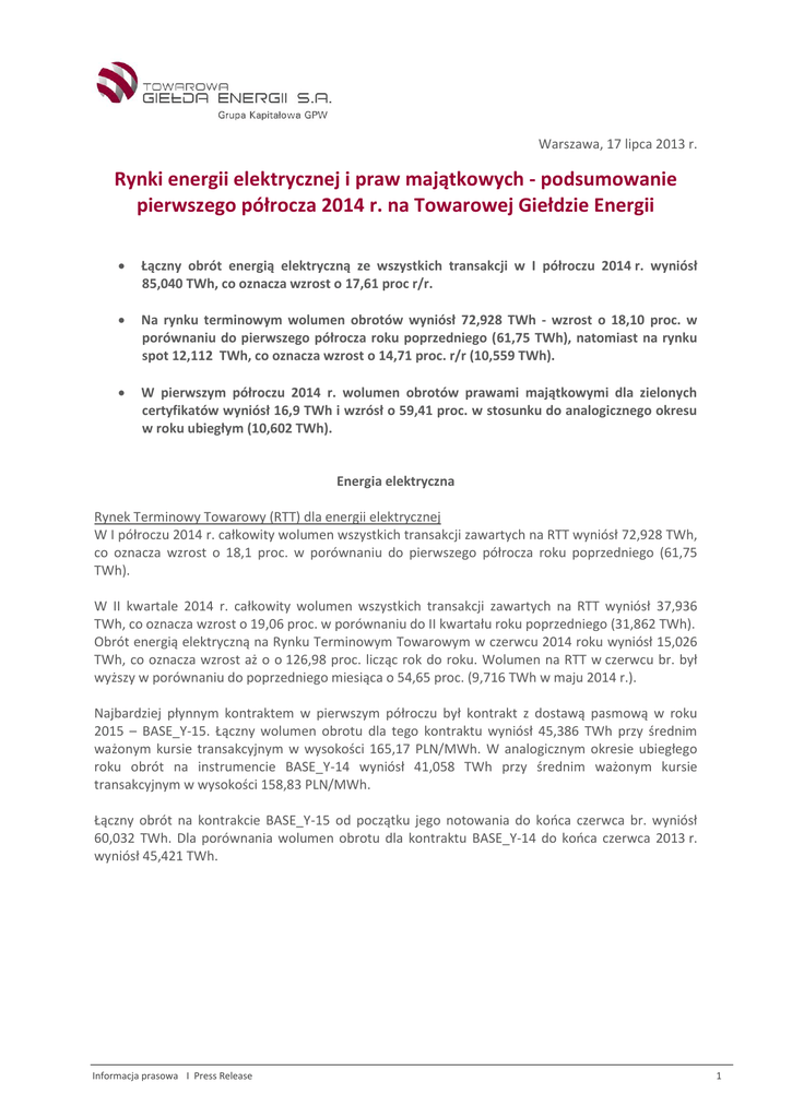 Warszawa, 17 lipca 2013 r. Rynki energii elektrycznej i praw majątkowych - podsumowanie pierwszego półrocza 2014 r. na Towarowej Giełdzie Energii Łączny obrót energią elektryczną ze wszystkich transakcji w I półroczu 2014 r. wyniósł 85,040 TWh, co oznacza wzrost o 17,61 proc r/r. Na rynku terminowym wolumen obrotów wyniósł 72,928 TWh - wzrost o 18,10 proc. w porównaniu do pierwszego półrocza roku poprzedniego (61,75 TWh), natomiast na rynku spot 12,112 TWh, co oznacza wzrost o 14,71 proc. r/r (10,559 TWh). W pierwszym półroczu 2014 r. wolumen obrotów prawami majątkowymi dla zielonych certyfikatów wyniósł 16,9 TWh i wzrósł o 59,41 proc. w stosunku do analogicznego okresu w roku ubiegłym (10,602 TWh). Energia elektryczna Rynek Terminowy Towarowy (RTT) dla energii elektrycznej W I półroczu 2014 r. całkowity wolumen wszystkich transakcji zawartych na RTT wyniósł 72,928 TWh, co oznacza wzrost o 18,1 proc. w porównaniu do pierwszego półrocza roku poprzedniego (61,75 TWh). W II kwartale 2014 r. całkowity wolumen wszystkich transakcji zawartych na RTT wyniósł 37,936 TWh, co oznacza wzrost o 19,06 proc. w porównaniu do II kwartału roku poprzedniego (31,862 TWh). Obrót energią elektryczną na Rynku Terminowym Towarowym w czerwcu 2014 roku wyniósł 15,026 TWh, co oznacza wzrost aż o o 126,98 proc. licząc rok do roku. Wolumen na RTT w czerwcu br. był wyższy w porównaniu do poprzedniego miesiąca o 54,65 proc. (9,716 TWh w maju 2014 r.). Najbardziej płynnym kontraktem w pierwszym półroczu był kontrakt z dostawą pasmową w roku 2015 – BASE_Y-15. Łączny wolumen obrotu dla tego kontraktu wyniósł 45,386 TWh przy średnim ważonym kursie transakcyjnym w wysokości 165,17 PLN/MWh. W analogicznym okresie ubiegłego roku obrót na instrumencie BASE_Y-14 wyniósł 41,058 TWh przy średnim ważonym kursie transakcyjnym w wysokości 158,83 PLN/MWh. Łączny obrót na kontrakcie BASE_Y-15 od początku jego notowania do końca czerwca br. wyniósł 60,032 TWh. Dla porównania wolumen obrotu dla kontraktu BASE_Y-14 do końca czerwca 2013 r. wyniósł 45,421 TWh. Informacja prasowa Ι Press Release 1 Rynek spot W pierwszym półroczu na Rynku Dnia Następnego i Bieżącego (RDNiB) wolumen obrotu wyniósł 12,112 TWh, co oznacza wzrost o 14,71 proc. r/r (10,559 TWh w I półroczu 2013). Kurs BASE, liczony jako średnia ważona wolumenem ze wszystkich transakcji zawartych na Rynku Dnia Następnego, wyniósł w pierwszym półroczu 174,12 PLN/MWh (wzrost r/r o 17,12 PLN). W II kwartale br. na Rynku Dnia Następnego i Bieżacego (RDNiB) wolumen obrotu wyniósł 5,608 TWh co oznacza wzrost o 13,8 proc. r/r (4,928 TWh w II kwartale 2013). Kurs BASE dla II kwartału br., liczony jako średnia ważona wolumenem ze wszystkich transakcji zawartych na Rynku Dnia Następnego, wyniósł 182,80 PLN/MWh (wzrost r/r o 31,87 PLN). Na Rynku Dnia Nastepnego (RDN) obrót energią elektryczną na parkiecie TGE wyniósł w czerwcu 2014 r. 1 730 903 MWh, wzrastając o 14,30 proc. w skali roku (1 514 373 MWh w czerwcu 2013 r.). W porównaniu do poprzedniego miesiąca obrót jest niższy o 8,26 proc. (1 886 660 MWh w maju 2014 r.). Miesięczny kurs BASE, liczony jako średnia ważona wolumenem ze wszystkich kursów transakcji zawartych na Rynku Dnia Następnego, wyniósł 180,69 PLN/MWh (wzrost m/m o 10,54 PLN). Z kolei miesięczny kurs PEAK, liczony jako średnia ważona wolumenem ze wszystkich transakcji zawartych na Rynku Dnia Następnego dla godzin od 8 do 22, ukształtował się na poziomie 203,33 PLN/MWh (wzrost m/m o 17,44 PLN). Informacja prasowa Ι Press Release 2 Rynek Praw Majątkowych Zielone certyfikaty W pierwszym półroczu 2014 r. wolumen obrotów prawami majątkowymi dla zielonych certyfikatów wyniósł 16,9 TWh i wzrósł o 59,41 proc. w stosunku do analogicznego okresu w roku ubiegłym (10,602 TWh). W drugim kwartale br. handel certyfikatami na instrumencie PMOZE_A osiągnął wartość 6,165 TWh i wzrósł w porównaniu do roku poprzedniego o 57,58 proc. (3,913 TWh). Łączny obrót na instrumencie PMOZE_A w czerwcu 2014 r. ukształtował się na poziomie 2 112 201 MWh dając wzrost o 69,2 proc. r/r (1 248 356 MWh w czerwcu 2013 r.) oraz wzrost 20,34 proc. m/m (1 755 222 MWh w maju 2014 r.). Na łączny wolumen złożyły się transakcje na sesjach giełdowych – 404 637 MWh oraz pozasesyjne – 1 707 563 MWh. Średnioważona cena praw majatkowych typu PMOZE_A, ze wszystkich transakcji zawartych w czerwcu 2014 r., wyniosła 196,85 PLN/MWh (spadek m/m o 5,61 PLN/MWh). Natomiast średnioważona cena w transakcjach na sesji osiągnęła wartość – 178,47 PLN/MWh (spadek m/m o 1,77 PLN/MWh), a w transakcjach pozasesyjnych – 201,21 PLN/MWh (spadek m/m o 9,96 PLN/MWh). Fioletowe certyfikaty Dla praw majątkowych z fioletowych certyfikatów obroty w pierwszym półroczu 2014 r. w wysokości 517 460 MWh wzrosły w stosunku do obrotów w pierwszym półroczu 2013 r. (282 565 MWh) o 83,13%. Z kolei w drugim kwartale wolumen obrotu w wysokości 197 002 MWh wzrósł w stosunku do analogicznego okresu ubiegłego roku (22 854) ponad ośmiokrotnie. Łączny obrót fioletowymi certyfikatami - instrumenty PMMET-2014 oraz PMMET-2013 w czerwcu 2014 r. wyniósł 98 258 MWh, co oznacza ponad dziewięciokrotny wzrost r/r (10 673 MWh w czerwcu 2013 r.). Łączny obrót na instrumencie PMMET-2014 w czerwcu 2014 r., ukształtował się na poziomie 31 031 MWh. Złożyły się na to transakcje na sesjach giełdowych – 19 865 MWh oraz transakcje pozasesyjne – 11 166 MWh. Informacja prasowa Ι Press Release 3 Średnioważona cena dla instrumentu PMMET-2014 z transakcji sesyjnych w czerwcu 2014 roku wyniosła 58,03 PLN/MWh. Średnioważona cena w transakcjach pozasesyjnych – 58,3 PLN/MWh. Łączny obrót na instrumencie PMMET-2013 w czerwcu 2014 r., ukształtował się na poziomie 67 227 MWh. Złożyły się na to transakcje na sesjach giełdowych – 10 287 MWh oraz transakcj