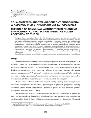 Joanna Karpińska 1 Katedra Ekonomiki Rolnictwa i Międzynarodowych Stosunków Gospodarczych SGGW ROLA GMIN W FINANSOWANIU OCHRONY ŚRODOWISKA W ASPEKCIE PRZYSTĄPIENIA DO UNII EUROPEJSKIEJ THE ROLE OF COMMUNAL AUTHORITIES IN FINANCING ENVIRONMENTAL PROTECTION AFTER THE POLISH ACCESSION TO THE EU Synopsis. Fakt przystąpienia Polski do Unii Europejskiej stawia wyzwania do zmodyfikowania dotychczasowej polityki ekologicznej Polski. Dąży się do przystosowania istniejących instytucji, a przede wszystkim Narodowego Funduszu Ochrony Środowiska i Gospodarki Wodnej oraz wojewódzkich funduszy ochrony środowiska i gospodarki wodnej, a także Banku Ochrony Środowiska, do zadań wynikających z zarządzania środkami pochodzącymi z funduszy strukturalnych. Ostatnie zmiany wymuszają wypracowanie form i zasad współpracy międzyregionalnej i międzypaństwowej w finansowaniu przedsięwzięć o charakterze regionalnym i europejskim ograniczających zanieczyszczenia transgraniczne, służących zachowaniu bioróżnorodności i produkcji energii odnawialnej z wykorzystaniem środków krajowych, unijnych oraz międzynarodowych publicznych instytucji finansowych. Słowa kluczowe: ochrona środowiska, inwestycje proekologiczne, fundusze strukturalne, władza lokalna Wstęp Ochrona środowiska zajmuje istotną pozycję w polityce państwa. Konstytucja RP w rozdziale I mówi że: „Rzeczpospolita strzeże niepodległości i nienaruszalności swojego terytorium, zapewnia wolność i prawa człowieka oraz bezpieczeństwo obywateli, strzeże dziedzictwa narodowego oraz zapewnia ochronę środowiska, kierując się zasadą zrównoważonego rozwoju” W artykule 74 został zawarty zapis brzmiący: „Władze publiczne prowadzą politykę zapewniającą bezpieczeństwo ekologiczne współczesnemu i przyszłym pokoleniom (...) Ochrona środowiska jest obowiązkiem władz publicznych”. Istotna rola w ochronie środowiska przypada władzy lokalnej. Punktem wyjścia jest obowiązek sporządzania wojewódzkich, powiatowych i gminnych programów ochrony środowiska przez zarząd województwa, powiatu i gminy w celu realizacji polityki ekologicznej państwa [Ustawa ... 2001]. Podstawowymi środkami finansowo-prawnymi ochrony środowiska w Polsce są: opłaty za korzystanie ze środowiska, administracyjne kary pieniężne oraz zróżnicowane stawki podatków i innych danin publicznych służące celom ochrony środowiska [Bernaciak 1 Mgr, Katedra Ekonomiki Rolnictwa i Międzynarodowych Stosunków Gospodarczych, SGGW, ul. Nowoursynowska 166, 02-787 Warszawa, email: [email protected] 152 2004]. Wpływy z tytułu opłat i kar stanowią przychody odpowiednich funduszy ochrony środowiska i gospodarki wodnej [Ustawa ... 2001]. Źródła finansowania ochrony środowiska w Polsce Ochrona środowiska w Polsce finansowana jest z wielu źródeł. Fundusze te pochodzą bezpośrednio ze środków własnych podmiotów gospodarczych, budżetów gmin, budżetu państwa, krajowych i międzynarodowych instytucji finansowych oraz programów pomocowych Unii Europejskiej. Całkowite wydatki inwestycyjne na ochronę środowiska, czyli wartość nakładów rzeczowych, których celem było stworzenie nowych środków trwałych lub ulepszenie istniejących obiektów majątku trwałego wyniosły w Polsce w cenach bieżących w 2004 r. 5,33 mld złotych (Tab. 1). Okres 2000-2004 wskazuje na tendencję spadkową wartości inwestycji. W ogólnej strukturze finansowania przeważają środki własne przedsiębiorstw oraz gmin. Istotne znaczenie mają również fundusze ekologiczne. Tabela1. Wydatki inwestycyjne na ochronę środowiska i gospodarkę wodną wg źródeł finansowania Table 1. Investment expenditures on environment protection and water economy by financing sources Finansowanie Ogółem, mln zł Środki własne (przedsiębiorstw, gmin) W tym gmin Środki z budżetu: centralnego województwa powiatu gminy (współudział) Środki z zagranicy Fundusze ekologiczne (pożyczki, kredyty i dotacje) Kredyty i pożyczki krajowe w tym bankowe Inne środki, w tym nakłady niesfinansowane 1998 9018,7 1999 8584,9 2000 6570,3 2001 2002 6168,9 5027,1 w % ogółem 51,8 46,7 . 19,6 2,0 1,8 1,0 1,7 0,3 0,4 0,8 0,9 3,2 4,2 50,2 . 2,6 2,1 1,7 7,3 46,2 . 2,0 1,4 1,8 5,9 53,4 . 2,2 1,6 0,2 1,4 3,9 16,2 24,6 20,0 23,7 12,5 7,4 12,9 5,2 11,7 5,6 12,1 5,1 2003 5141,4 2004 5337,4 44,2 17,8 1,5 0,8 0,2 0,7 8,8 48,1 17,9 1,0 0,5 0,2 1,1 12,2 26,1 25,3 24,1 12,3 6,0 13,9 4,7 8,3 4,5 Źródło: Opracowanie własne na podstawie danych GUS http://www.stat.gov.pl/dane_spol-gosp/rolnic_lesnict_srodowi/ochrona_srodowiska/2005/index.php W roku 1999 udział nakładów na ochronę środowiska w produkcie krajowym brutto wynosił 5,2%, natomiast w roku 2004 udział ten wyniósł 3,4% (Rysunek 1). W badanym okresie istniał trend spadkowy. Przyczyną takiej sytuacji może być większa dynamika przyrostu PKB w stosunku do dynamiki przyrostu wielkości nakładów przeznaczonych na ochronę środowiska. Fakt ten może świadczyć o braku dostatecznej świadomości społeczeństwa o konieczności zachowania równowagi pomiędzy eksploatacją zasobów środowiskowych, będących podstawą rozwoju gospodarki, a redukcją efektów oddziaływania przemysłu na środowisko. 153 6 5,2 5 4,5 4,4 4 3,6 3,5 3,4 % 3 2 1 0 1999 2000 2001 2002 2003 2004 Rysunek 1. Udział nakładów inwestycyjnych na ochronę środowiska w produkcie krajowym brutto w latach 1999-2004 Figure 1. Share of expenditures on environmental protection in the Gross Domestic Product in period 1999 – 2004 Źródło: Opracowanie własne na podstawie danych GUS http://www.stat.gov.pl/dane_spol-gosp/rolnic_lesnict_srodowi/ochrona_srodowiska/2005/index.php Wykorzystanie funduszy przedakcesyjnych i strukturalnych na ochronę środowiska Do czasu przystąpienia do Unii Europejskiej Polska uzyskała wsparcie w ramach programów PHARE, ISPA oraz SAPARD. Po 1 maja 2004 r. uruchomione zostały środki z Funduszu Sp