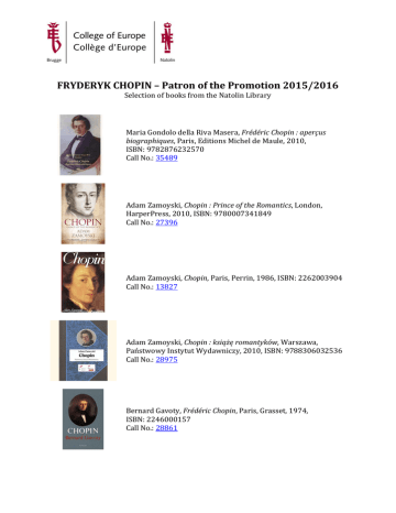 FRYDERYKCHOPIN–PatronofthePromotion2015/2016 SelectionofbooksfromtheNatolinLibrary MariaGondolodellaRivaMasera,FrédéricChopin:aperçus biographiques,Paris,EditionsMicheldeMaule,2010, ISBN:9782876232570 CallNo.:35489 AdamZamoyski,Chopin:PrinceoftheRomantics,London, HarperPress,2010,ISBN:9780007341849 CallNo.:27396 AdamZamoyski,Chopin,Paris,Perrin,1986,ISBN:2262003904 CallNo.:13827 AdamZamoyski,Chopin:książęromantyków,Warszawa, PaństwowyInstytutWydawniczy,2010,ISBN:9788306032536 CallNo.:28975 BernardGavoty,FrédéricChopin,Paris,Grasset,1974, ISBN:2246000157 CallNo.:28861 HalinaGoldberg,TheageofChopin:interdisciplinaryinquiries, Bloomington,IN,IndianaUniversityPress,2004, ISBN:0253343194,0253216281 CallNo.:17643 BeatadeRobien,LeRomandelaPologne,Monaco:Rocher,2007, ISBN:9782268062914 CallNo.:24270 Marie‐PauleRambeau,Chopin:l'enchanteurautoritaire,Paris, L'Harmattan,2005,ISBN:2747587886 CallNo.:20248 SemperPolonia:l'artenPolognedeslumièresauromantisme (1764‐1849)byMuséedesbeaux‐artsdeDijon,ZamekKrólewski (Warsaw,Poland),Paris,Somogy,Dijon,Muséedesbeaux‐artsde Dijon,2004,ISBN:2850568007 CallNo.:21786