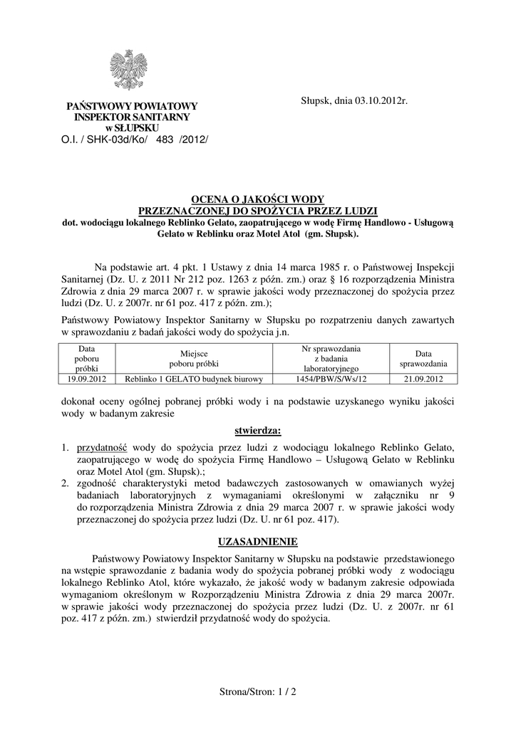 Słupsk, dnia 03.10.2012r. PA STWOWY POWIATOWY INSPEKTOR SANITARNY w SŁUPSKU O.I. / SHK-03d/Ko/ 483 /2012/ OCENA O JAKO CI WODY PRZEZNACZONEJ DO SPO YCIA PRZEZ LUDZI dot. wodoci gu lokalnego Reblinko Gelato, zaopatruj cego w wod Firm Handlowo - Usługow Gelato w Reblinku oraz Motel Atol (gm. Słupsk). Na podstawie art. 4 pkt. 1 Ustawy z dnia 14 marca 1985 r. o Pa stwowej Inspekcji Sanitarnej (Dz. U. z 2011 Nr 212 poz. 1263 z pó n. zm.) oraz § 16 rozporz dzenia Ministra Zdrowia z dnia 29 marca 2007 r. w sprawie jako ci wody przeznaczonej do spo ycia przez ludzi (Dz. U. z 2007r. nr 61 poz. 417 z pó n. zm.); Pa stwowy Powiatowy Inspektor Sanitarny w Słupsku po rozpatrzeniu danych zawartych w sprawozdaniu z bada jako ci wody do spo ycia j.n. Data poboru próbki 19.09.2012 Miejsce poboru próbki Reblinko 1 GELATO budynek biurowy Nr sprawozdania z badania laboratoryjnego 1454/PBW/S/Ws/12 Data sprawozdania 21.09.2012 dokonał oceny ogólnej pobranej próbki wody i na podstawie uzyskanego wyniku jako ci wody w badanym zakresie stwierdza: 1. przydatno wody do spo ycia przez ludzi z wodoci gu lokalnego Reblinko Gelato, zaopatruj cego w wod do spo ycia Firm Handlowo – Usługow Gelato w Reblinku oraz Motel Atol (gm. Słupsk).; 2. zgodno charakterystyki metod badawczych zastosowanych w omawianych wy ej badaniach laboratoryjnych z wymaganiami okre lonymi w zał czniku nr 9 do rozporz dzenia Ministra Zdrowia z dnia 29 marca 2007 r. w sprawie jako ci wody przeznaczonej do spo ycia przez ludzi (Dz. U. nr 61 poz. 417). UZASADNIENIE Pa stwowy Powiatowy Inspektor Sanitarny w Słupsku na podstawie przedstawionego na wst pie sprawozdanie z badania wody do spo ycia pobranej próbki wody z wodoci gu lokalnego Reblinko Atol, które wykazało, e jako wody w badanym zakresie odpowiada wymaganiom okre lonym w Rozporz dzeniu Ministra Zdrowia z dnia 29 marca 2007r. w sprawie jako ci wody przeznaczonej do spo ycia przez ludzi (Dz. U. z 2007r. nr 61 poz. 417 z pó n. zm.) stwierdził przydatno wody do spo ycia. Strona/Stron: 1 / 2 Ocen o jako ci wody z wy ej wymienionego urz dzenia wodoci gowego Pa stwowy Powiatowy Inspektor Sanitarny w Słupsku wydał celem poinformowania jednostek samorz du terytorialnego oraz ludno ci. Pa stwowy Powiatowy Inspektor Sanitarny w Słupsku z up. Józef Pawluk z-ca Pa stwowego Powiatowego Inspektora Sanitarnego w Słupsku Otrzymuj : 1. Gelato" Firma Handlowo - Usługowa Aleksandra i Andrzej Adamowicz Reblinko 1, 76-251 Kobylnica; 2. Wójt Gminy Kobylnicy, ul. Główna 20, 76-251 Kobylnica 3. a/a Do Wiadomo ci: - Mieszka cy - strona internetowa PSSE w Słupsku Strona/Stron: 2 / 2
