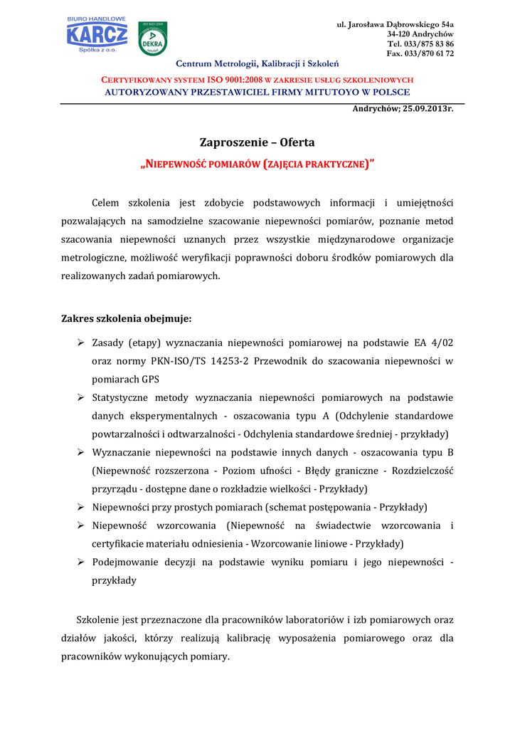 ul. Jarosława Dąbrowskiego 54a 34-120 Andrychów Tel. 033/875 83 86 Fax. 033/870 61 72 Centrum Metrologii, Kalibracji i Szkoleń CERTYFIKOWANY SYSTEM ISO 9001:2008 W ZAKRESIE USŁUG SZKOLENIOWYCH AUTORYZOWANY PRZESTAWICIEL FIRMY MITUTOYO W POLSCE Andrychów; 25.09.2013r. Zaproszenie – Oferta „NIEPEWNOŚĆ POMIARÓW (ZAJĘCIA PRAKTYCZNE)” Celem szkolenia jest zdobycie podstawowych informacji i umiejętności pozwalających na samodzielne szacowanie niepewności pomiarów, poznanie metod szacowania niepewności uznanych przez wszystkie międzynarodowe organizacje metrologiczne, możliwość weryfikacji poprawności doboru środków pomiarowych dla realizowanych zadań pomiarowych. Zakres szkolenia obejmuje: Zasady (etapy) wyznaczania niepewności pomiarowej na podstawie EA 4/02 oraz normy PKN-ISO/TS 14253-2 Przewodnik do szacowania niepewności w pomiarach GPS Statystyczne metody wyznaczania niepewności pomiarowych na podstawie danych eksperymentalnych - oszacowania typu A (Odchylenie standardowe powtarzalności i odtwarzalności - Odchylenia standardowe średniej - przykłady) Wyznaczanie niepewności na podstawie innych danych - oszacowania typu B (Niepewność rozszerzona - Poziom ufności - Błędy graniczne - Rozdzielczość przyrządu - dostępne dane o rozkładzie wielkości - Przykłady) Niepewności przy prostych pomiarach (schemat postępowania - Przykłady) Niepewność wzorcowania (Niepewność na świadectwie wzorcowania i certyfikacie materiału odniesienia - Wzorcowanie liniowe - Przykłady) Podejmowanie decyzji na podstawie wyniku pomiaru i jego niepewności przykłady Szkolenie jest przeznaczone dla pracowników laboratoriów i izb pomiarowych oraz działów jakości, którzy realizują kalibrację wyposażenia pomiarowego oraz dla pracowników wykonujących pomiary. ul. Jarosława Dąbrowskiego 54a 34-120 Andrychów Tel. 033/875 83 86 Fax. 033/870 61 72 Centrum Metrologii, Kalibracji i Szkoleń CERTYFIKOWANY SYSTEM ISO 9001:2008 W ZAKRESIE USŁUG SZKOLENIOWYCH AUTORYZOWANY PRZESTAWICIEL FIRMY MITUTOYO W POLSCE Wszyscy uczestnicy szkolenia otrzymają materiały szkoleniowe uwzględniające między innymi cały zakres materiałowy niniejszego szkolenia oraz przykładowe procedury dotyczące szacowania dla wybranym grup wyposażenia pomiarowego. Kurs kończy się wręczeniem certyfikatów potwierdzających kompetencji w zakresie szacowania niepewności pomiarowych. uzyskanie Szkolenie poprowadzi osoba posiadająca własne laboratorium wzorcujące, mająca wieloletnie doświadczenie w dziedzinie pomiarów długości, kąta, masy, siły, prędkości i drogi. Odbyła staż pracy w zakresie kalibracji urządzeń pomiarowych ponad 20 lat. Autor instrukcji szacowania niepewności, które są stosowane w Urzędach Miar. Czas trwania szkolenia: Termin: Miejsce: Grupa: Koszt szkolenia obejmuje: 3 dni (ok. 21 godzin) 06-08.11.2013r. Szczyrk max. 15 osób (decyduje kolejność zgłoszeń) - przeprowadzenie szkolenia oraz indywidualne konsultacje z wykładowcą - materiały szkoleniowe w formie papierowej i elektronicznej - imienny Certyfikat ukończenia szkolenia - pełne wyżywienie, serwis kawowy, kolacja integracyjna - 2 noclegi (pokój jednoosobowy lub dwuosobowy) Istnieje możliwość rezerwacji noclegu w przeddzień szkolenia – dodatkowy koszt w wysokości 130 zł/os ! *) cena netto, do ceny należy doliczyć podatek VAT 23% Sprawy szkoleń prowadzi: Izabela Markowska tel. 606 977 648; Mateusz Cinal Tel. 033/875 83 86 e-mail: [email protected] ul. Jarosława Dąbrowskiego 54a 34-120 Andrychów Tel. 033/875 83 86 Fax. 033/870 61 72 e-mail: [email protected] www.bhkarcz.pl Centrum Metrologii, Kalibracji i Szkoleń CERTYFIKOWANY SYSTEM ISO 9001:2008 W ZAKRESIE USŁUG SZKOLENIOWYCH AUTORYZOWANY PRZEDSTAWICIEL FIRMY MITUTOYO W POLSCE KARTA ZGŁOSZENIOWA Dotyczy szkolenia: „NIEPEWNOŚĆ POMIARÓW (ZAJĘCIA PRAKTYCZNE)” Termin szkolenia: 06-08.11.2013r. Miejsce szkolenia: Szczyrk Dane niezbędne do wystawienia faktury (pełna nazwa i adres firmy) Numer NIP Imię i Nazwisko uczestnika 1. 2. 3. 4. Telefon e-mail Prosimy o dokonanie rezerwacji hotelu w terminie od ……............ do …………. dla ………. os. KOSZT NOCLEGU W PRZED DZIEŃ SZKOLENIA JEST DODATKOWO PŁATNY i wynosi 130 zł/os. Należność za udział: ……… osób x ……………. zł netto + 23% VAT= ……………………. zł przekażemy na Wasze konto gotówką/ przelewem* : Bank PEKAO S.A. oddział w Wadowicach 19 1240 4197 1111 0010 2982 1425 Warunki zgłoszenia: 1. Warunkiem uczestnictwa w szkoleniu jest przesłanie zgłoszenia na co najmniej 2 dni robocze przed terminem szkolenia na fax pod numer 033 870 61 72 lub e-mail [email protected] 2. Zgłoszenie traktujemy jako dowód zawarcia umowy. 3. Gdyby szkolenie nie odbyło się z powodu nie zebrania minimalnej grupy uczestników lub powodów niezależnych od organizatora, zgłaszającemu zostanie zaproponowany udział w szkoleniu w innym terminie. 4. Uczestnik może się wycofać z udziału w szkoleniu (w formie pisemnej), bez ponoszenia kosztów, w terminie 7 dni roboczych przed dniem rozpoczęcia szkolenia. Po upływie tego terminu zgłaszający zapłaci 50% kosztów uczestnictwa. 5. W przypadku nieobecności uczestnika / - ów na szkoleniu, bez uprzedniego pisemnego powiadomienia, zgłaszający zapłaci 75% kwoty uczestnictwa wynikającej ze zgłoszenia. 6. Przyjęcie Państwa zgłoszenia na szkolenie potwierdzimy pisemnie. Oświadczamy, że jesteśmy płatnikiem podatku VAT. ………………………………… (pieczęć firmy) ………………………………… (pieczęć i podpis zamawiającego)