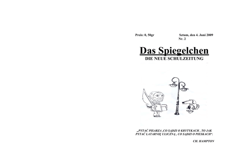 Preis: 0, 50gr Sztum, den 4. Juni 2009 Nr. 2 Das Spiegelchen DIE NEUE SCHULZEITUNG „PYTAĆ PISARZA ,CO SĄDZI O KRYTYKACH , TO JAK PYTAĆ LATARNIĘ ULICZNĄ , CO SĄDZI O PIESKACH“. CH. HAMPTON HALLO ! Wir freuen uns unheimlich , dass unsere Schulzeitung in der ersten Ausgabe so vergriffen war. In der heutigen Ausgabe gibt es wieder viele interessante Texte und sogar eine Überraschung für unsere LeserInnen. In jedem Exemplar findet ihr eine aus dem vierzehnten Jahrhundert stammende Münze – natürlich ist das nur eine Nachahmung. Ist das nicht super? In dieser Schulzeitung gibt es auch ein Interview mi unserer Abiturientin, Leserbriefe, kurze Interviews mit unseren lieben Lehrern und viel Unterhaltung. Und das alles fast kostenlos! Jeder kann sich so eine interessante Schulzeitung leisten . Viel Spaβ beim Lesen. Eure Redakteurinnen Aleksandra Wróblewska und Bogusława Stankiewicz INTERVIEW MIT UNSERER ABITURIENTIN MAGDALENA KAMROWSKA B.S. –Magda, du hast gerade das Abitur abgelegt. Wie hast du dich darauf vorbereitet, das Abitur möglichst gut abzulegen? M.K. –Na ja….Ich habe wirklich viel gelernt . Sowohl In der Schule als auch zu Hause . Etwa drei Stunden täglich, und das hat mir echt viel gegeben . Redaktion *** Das Schuljahr ist wieder so schnell vorbei. Wir sind wieder frei für zwei Monate! Nur noch die Zeugnisse und die Sommerferien sind da! Wir wünschen Euch schöne Tage und gute Erholung ! Kommt gut in die Schule zurück! Tschüs !!! Ich habe das Gefühl gehabt, dass ich gut vorbereitet bin. Ich habe auch Nachhilfestunden in Deutsch genommen und auch an zusätzlichen Deutschstunden teilgenommen . LESERBRIEFE Die erste Nummer der Schulzeitung hat mir sehr gefallen. So weiter! Ich warte auf die nächste Ausgabe! Basia, kl I *** B.S. – In welchen Fächern hast du das Abi abgelegt ? M.K.- Also…. In Deutsch (Aufbaustufe ), in Englisch ( Grundstufe ), in Erdkunde und natürlich in Polnisch auch Aufbaustufe. B.S.- Und wie hast du dich kurz vor dem Abi gefühlt ? Wirklich eine gute Idee, aber ich möchte mehr Artikel über Sport in der Schule lesen. Mir hat es das Kreuzworträtsel gefallen . Es könnte auch mehr Witze geben ! M.K.- Schrecklich ! Ich habe riesige Angst gehabt. Beinahe wäre ich in Panik geraten. Ich bin sehr nervös und aufgeregt gewesen. Na ja, aber mit der Zeit habe ich Stress überwunden. B.S.- Magda, und was möchtest du studieren? Tomek, kl. II *** Ich bin Abiturientin und “Das Spiegelchen “ hat mir beim Lernen geholfen. Interessante Artikel und Äuβerungen. Ich gratuliere der Redaktion der tollen Ideen und ich wünsche viel Erfolg☺ Marta, kl. III *** M.K.- Germanistik natürlich!!! B.S.- Also viel Spass und Glück beim Studium und ich bedanke mich bei Dir für das Gespräch. M.K.- Ich bedanke mich auch und ich wünsche allen LeserInnen schönen und spannenden Sommer B.S. KRZYŻÓWKA WAKACYJNA DZIEŃ OTWARTY 2009r. Dnia 27.04. w naszej szkole odbył się Dzień Otwarty, który jest już od kilku lat stałą atrakcją. W tym roku uczniowie klas pierwszych i drugich mieli za zadanie przygotować prezentacje określonych profili, które będą wprowadzone lub kontynuowane w następnym roku szkolnym. Uczniowie z gimnazjów w Sztumie, Dzierzgoniu, Starym i Nowym Targu mieli okazję obejrzeć, przy okazji zwiedzania historycznego „Kasprowicza”, ciekawie zaprezentowaną ofertę naszej szkoły. Zeszłoroczny wachlarz profili został w tym roku powiększony o kilka pozycji. Humaniści chętnie zbierali ulotki klas o profilach prawniczym i psychologicznym, a uczniowie interesujący się naukami ścisłymi mogli dowiedzieć się sporo na temat klasy ekonomicznej, promedycznej, informatycznej czy fizycznej. Ciekawą pozycją okazał się tzw. profil klasy europejskiej, który przyciągnął uwagę zarówno przyszłych językowców, jak i osób niezdecydowanych. Ten ostatni profil szczególnie polecamy my – Wasza redakcja. Gimnazjaliści w kolejnych gabinetach mogli zasięgnąć szczegółowych informacji o szkole od nauczycieli oraz starszych kolegów. Każdy mógł wziąć również podanie. O atmosferę naukową zadbała klasa prezentująca profil fizyczny, pokazując wiele ciekawych doświadczeń. Klasa promedyczna ostrzegała przed zgubnym nałogiem palenia prezentując humorystyczną scenkę. Prekursorzy dziennikarstwa mogli obejrzeć Sąd Makbeta oraz kabaretowy „program telewizyjny” o walorach naszej szkoły. Swoją wiedzę gimnazjaliści mogli sprawdzić w kilku mini konkursach profilu informatyczno – matematycznego oraz europejskiego. Zdolności logiczne były wzięte pod lupę przez uczniów propagujących profil psychologiczny, zachęcający do rozwiązywania niełatwych ćwiczeń. Przyszli licealiści ciepło przyjęli ofertę zaprezentowaną przez nasza szkołę. Miejmy nadzieję, że pierwszego września spotkamy się z nimi ponownie w murach „Kasprowicza”. Adrian Rzatkowski Uwaga! Odopowiedzi do krzyżówki należy udzielać w języku niemieckim! STILBLÜTEN M.N. Man kann überall was lernen. Man kann andere Leute, fremde Kultur, Sitten und Bräuche kennen lernen. Habt ihr gewusst, dass der gröβte Feiertag in Thailand der Königgeburtstag ist? In der Türkei gehen nur Männer spazieren und der Platz der Frau ist zu Hause. In China ist das laute Rülpsen und spucken bei Mahlzeiten üblich. Interessante Plätze und der Alltag der durchschnittlichen Menschen locken mich. Peking , Istanbul oder Bangkog sind meine Lieblingsplätze. Es gibt auch viele Plätze, die ich noch nie gesehen habe, aber davon erzähle ich Euch nicht . Das ist mein süβes Geheimnis. Einst ist sicher. Es gibt viele Plätze auf der Welt, die sehenswert sind. Ich überrede Euch zu reisen. Nicht unbedingt in ferne Länder. Es gibt auch bei uns in Polen viel zu sehen z.B. Hoche Tatra oder unsere Ostsee. Vielleicht treffen wir uns irgendwann auf der Route. M.J. Ich bedanke mich für das Gespräch und wir warten ungeduldig auf Ihre nächste Ferienerinner