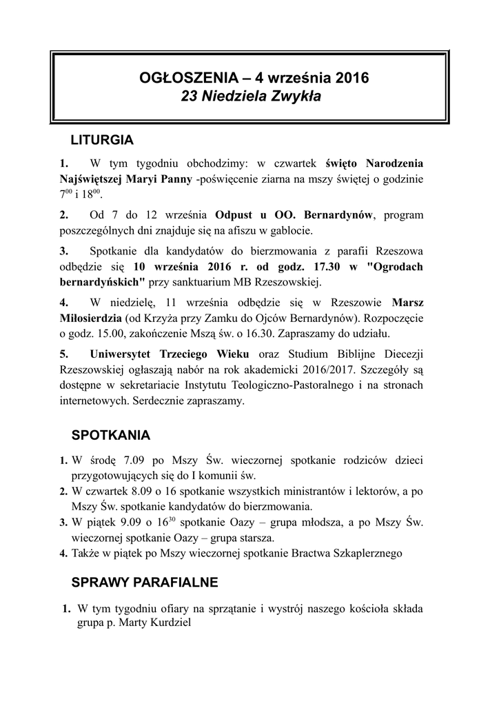 OGŁOSZENIA – 4 września 2016 23 Niedziela Zwykła LITURGIA 1. W tym tygodniu obchodzimy: w czwartek święto Narodzenia Najświętszej Maryi Panny -poświęcenie ziarna na mszy świętej o godzinie 700 i 1800. 2. Od 7 do 12 września Odpust u OO. Bernardynów, program poszczególnych dni znajduje się na afiszu w gablocie. 3. Spotkanie dla kandydatów do bierzmowania z parafii Rzeszowa odbędzie się 10 września 2016 r. od godz. 17.30 w "Ogrodach bernardyńskich" przy sanktuarium MB Rzeszowskiej. 4. W niedzielę, 11 września odbędzie się w Rzeszowie Marsz Miłosierdzia (od Krzyża przy Zamku do Ojców Bernardynów). Rozpoczęcie o godz. 15.00, zakończenie Mszą św. o 16.30. Zapraszamy do udziału. 5. Uniwersytet Trzeciego Wieku oraz Studium Biblijne Diecezji Rzeszowskiej ogłaszają nabór na rok akademicki 2016/2017. Szczegóły są dostępne w sekretariacie Instytutu Teologiczno-Pastoralnego i na stronach internetowych. Serdecznie zapraszamy. SPOTKANIA 1. W środę 7.09 po Mszy Św. wieczornej spotkanie rodziców dzieci przygotowujących się do I komunii św. 2. W czwartek 8.09 o 16 spotkanie wszystkich ministrantów i lektorów, a po Mszy Św. spotkanie kandydatów do bierzmowania. 3. W piątek 9.09 o 1630 spotkanie Oazy – grupa młodsza, a po Mszy Św. wieczornej spotkanie Oazy – grupa starsza. 4. Także w piątek po Mszy wieczornej spotkanie Bractwa Szkaplerznego SPRAWY PARAFIALNE 1. W tym tygodniu ofiary na sprzątanie i wystrój naszego kościoła składa grupa p. Marty Kurdziel ZAPOWIEDZI PRZEDŚLUBNE Piotr Lampart s. Antoniego i Marii, zam. Rzeszów par. św. Rocha i Anna Pawłowska c. Marka i Danuty, zam. Rzeszów – Katedra