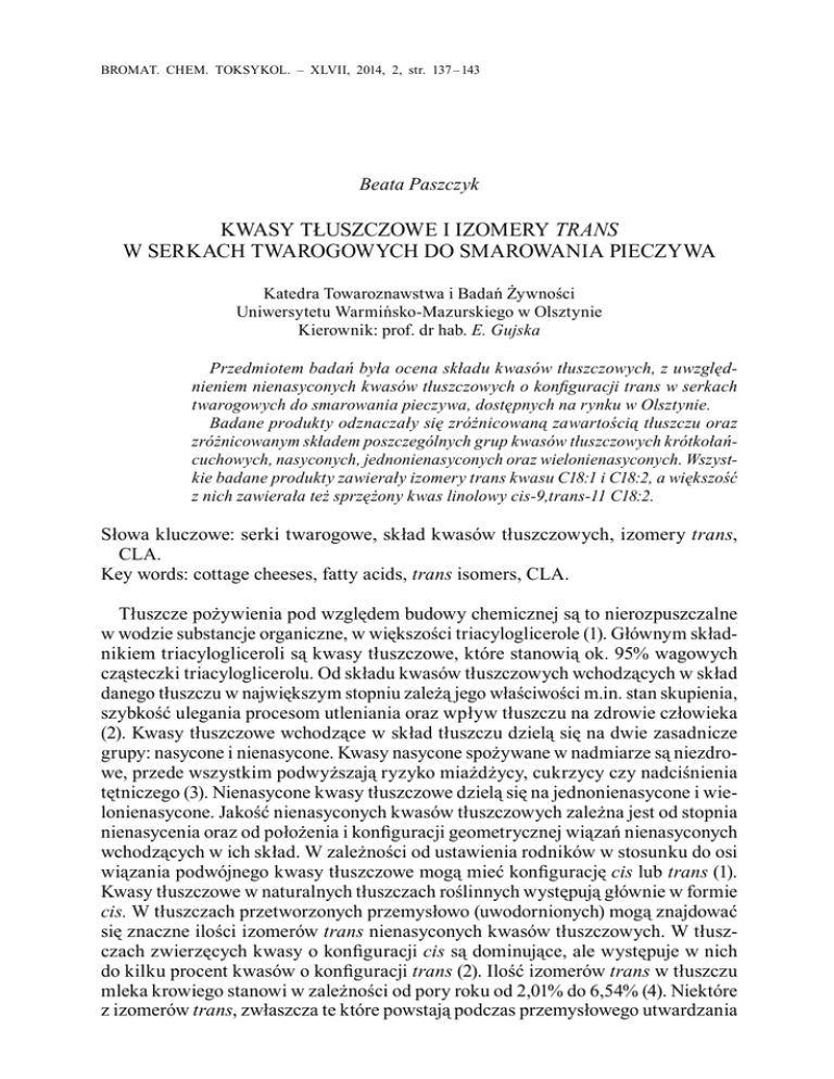 BROMAT. CHEM. TOKSYKOL. – XLVII, 2014, 2, str. 137 – 143 Beata Paszczyk KWASY TŁUSZCZOWE I IZOMERY TRANS W SERKACH TWAROGOWYCH DO SMAROWANIA PIECZYWA Katedra Towaroznawstwa i Badań Żywności Uniwersytetu Warmińsko-Mazurskiego w Olsztynie Kierownik: prof. dr hab. E. Gujska Przedmiotem badań była ocena składu kwasów tłuszczowych, z uwzględnieniem nienasyconych kwasów tłuszczowych o konfiguracji trans w serkach twarogowych do smarowania pieczywa, dostępnych na rynku w Olsztynie. Badane produkty odznaczały się zróżnicowaną zawartością tłuszczu oraz zróżnicowanym składem poszczególnych grup kwasów tłuszczowych krótkołańcuchowych, nasyconych, jednonienasyconych oraz wielonienasyconych. Wszystkie badane produkty zawierały izomery trans kwasu C18:1 i C18:2, a większość z nich zawierała też sprzężony kwas linolowy cis-9,trans-11 C18:2. Słowa kluczowe: serki twarogowe, skład kwasów tłuszczowych, izomery trans, CLA. Key words: cottage cheeses, fatty acids, trans isomers, CLA. Tłuszcze pożywienia pod względem budowy chemicznej są to nierozpuszczalne w wodzie substancje organiczne, w większości triacyloglicerole (1). Głównym składnikiem triacylogliceroli są kwasy tłuszczowe, które stanowią ok. 95% wagowych cząsteczki triacyloglicerolu. Od składu kwasów tłuszczowych wchodzących w skład danego tłuszczu w największym stopniu zależą jego właściwości m.in. stan skupienia, szybkość ulegania procesom utleniania oraz wpływ tłuszczu na zdrowie człowieka (2). Kwasy tłuszczowe wchodzące w skład tłuszczu dzielą się na dwie zasadnicze grupy: nasycone i nienasycone. Kwasy nasycone spożywane w nadmiarze są niezdrowe, przede wszystkim podwyższają ryzyko miażdżycy, cukrzycy czy nadciśnienia tętniczego (3). Nienasycone kwasy tłuszczowe dzielą się na jednonienasycone i wielonienasycone. Jakość nienasyconych kwasów tłuszczowych zależna jest od stopnia nienasycenia oraz od położenia i konfiguracji geometrycznej wiązań nienasyconych wchodzących w ich skład. W zależności od ustawienia rodników w stosunku do osi wiązania podwójnego kwasy tłuszczowe mogą mieć konfigurację cis lub trans (1). Kwasy tłuszczowe w naturalnych tłuszczach roślinnych występują głównie w formie cis. W tłuszczach przetworzonych przemysłowo (uwodornionych) mogą znajdować się znaczne ilości izomerów trans nienasyconych kwasów tłuszczowych. W tłuszczach zwierzęcych kwasy o konfiguracji cis są dominujące, ale występuje w nich do kilku procent kwasów o konfiguracji trans (2). Ilość izomerów trans w tłuszczu mleka krowiego stanowi w zależności od pory roku od 2,01% do 6,54% (4). Niektóre z izomerów trans, zwłaszcza te które powstają podczas przemysłowego utwardzania 138 B. Paszczyk Nr 2 olejów mogą wpływać niekorzystnie na nasze zdrowie (5, 6). Z drugiej strony dominujący izomer trans kwasu C18:1 tłuszczu mlekowego, kwas wakcenowy (trans11 C18:1) posiada właściwości antynowotworowe i antymiażdżycowe (7). Obecny w tłuszczu mlekowym kwas linolowy o sprzężonym układzie podwójnych wiązań kwas cis-9, trans-11 C18:2 (CLA) odznacza się wieloma pozytywnymi dla zdrowia właściwościami (8, 9, 10, 11). Spożywane przez człowieka izomery trans pochodzą głównie z uwodornionych tłuszczów roślinnych zawartych w margarynach i innych produktach, w niewielkich ilościach z tłuszczów zwierzęcych. Ważnym źródłem izomerów trans nienasyconych kwasów tłuszczowych oraz sprzężonego kwasu linolowego cis-9, trans-11 C18:2 (CLA) w diecie człowieka jest mleko oraz jego przetwory (masło, różne rodzaje serów czy mleczne napoje fermentowane). Serek do smarowania pieczywa (twarogowy lub śmietankowy), pełnoziarniste pieczywo oraz dodatki np. pomidor, ogórek lub szczypiorek, jest nie tylko smacznym, ale również wartościowym pomysłem na śniadanie. Asortyment serków twarogowych do smarowania pieczywa obecnych w sklepach jest bardzo zróżnicowany. W ofercie znajdują się produkty pochodzące od kilku, a nawet kilkunastu producentów, dodatkowo większość z nich występuje w kilku wariantach smakowych. Warto jednak bliżej przyjrzeć się składowi serków i wybrać ten najzdrowszy. Stąd też, analiza składu kwasów tłuszczowych, ze szczególnym uwzględnieniem zawartości izomerów trans nienasyconych kwasów tłuszczowych w tłuszczu wydzielonym z serków twarogowych do smarowania pieczywa dostępnych na naszym rynku, była celem pracy. MATERIAŁ I METODY Materiał do badań stanowiły serki twarogowe przeznaczone do smarowania pieczywa dostępne na rynku w Olszynie. Przebadano 14 rodzajów serków twarogowych pochodzących od różnych producentów. Badane produkty zakupiono w sklepach detalicznych na terenie Olsztyna w okresie od stycznia do lutego 2013 r. Zakupiono po dwie próbki każdego rodzaju serka różniące się datą przydatności do spożycia. Łącznie przeanalizowano 28 produktów. Do wydzielenia tłuszczu z badanych produktów zastosowano metodę Folcha (12). Z wydzielonego tłuszczu przygotowywano estry metylowe wg metody IDF, stosując metanolowy roztwór KOH (13). Skład kwasów tłuszczowych oznaczano metodą chromatografii gazowej (GC) na 100 m kolumnie kapilarnej z fazą stacjonarną CP Sil 88. Średnica kolumny 0,25 mm, grubości filmu 0,20 μm. Oznaczenia przeprowadzano w następujących warunkach: temp. kolumny 60°C (przez 1 min) do 180°C, Δt =5°C/min., temp. detektora 250°C, temp. dozownika 225°C, gaz nośny hel, przepływ gazu 1,5 cm3/min, split: 100:1. Udziały procentowe oznaczonych kwasów tłuszczowych przedstawiono w % masowych (jako procentowy udział poszczególnych kwasów tłuszczowych w stosunku do ogólnej ilości kwasów tłuszczowych). Wszystkie oznaczenia przeprowadzano w dwóch równoległych powtórzeniach. W programie Excel obliczono wartości średnie Nr 2 Kwasy tłuszczowe i izomery trans w serkach twarogowych 139 wybranych grup kwasów 