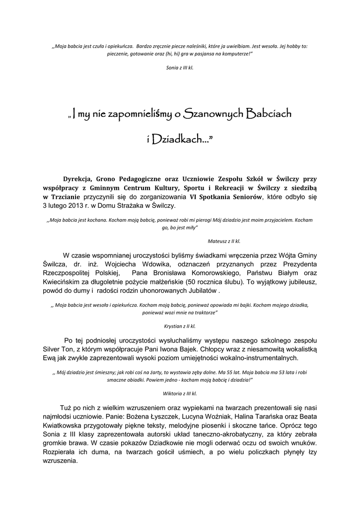 ,,Moja babcia jest czuła i opiekuńcza. Bardzo zręcznie piecze naleśniki, które ja uwielbiam. Jest wesoła. Jej hobby to: pieczenie, gotowanie oraz (hi, hi) gra w pasjansa na komputerze!” Sonia z III kl. ,, I my nie zapomnieliśmy o Szanownych Babciach i Dziadkach…” Dyrekcja, Grono Pedagogiczne oraz Uczniowie Zespołu Szkół w Świlczy przy współpracy z Gminnym Centrum Kultury, Sportu i Rekreacji w Świlczy z siedzibą w Trzcianie przyczynili się do zorganizowania VI Spotkania Seniorów, które odbyło się 3 lutego 2013 r. w Domu Strażaka w Świlczy. ,,Moja babcia jest kochana. Kocham moją babcię, ponieważ robi mi pierogi Mój dziadzio jest moim przyjacielem. Kocham go, bo jest miły” Mateusz z II kl. W czasie wspomnianej uroczystości byliśmy świadkami wręczenia przez Wójta Gminy Świlcza, dr. inż. Wojciecha Wdowika, odznaczeń przyznanych przez Prezydenta Rzeczpospolitej Polskiej, Pana Bronisława Komorowskiego, Państwu Białym oraz Kwiecińskim za długoletnie pożycie małżeńskie (50 rocznica ślubu). To wyjątkowy jubileusz, powód do dumy i radości rodzin uhonorowanych Jubilatów . ,, Moja babcia jest wesoła i opiekuńcza. Kocham moją babcię, ponieważ opowiada mi bajki. Kocham mojego dziadka, ponieważ wozi mnie na traktorze” Krystian z II kl. Po tej podniosłej uroczystości wysłuchaliśmy występu naszego szkolnego zespołu Silver Ton, z którym współpracuje Pani Iwona Bajek. Chłopcy wraz z niesamowitą wokalistką Ewą jak zwykle zaprezentowali wysoki poziom umiejętności wokalno-instrumentalnych. ,, Mój dziadzio jest śmieszny; jak robi coś na żarty, to wystawia zęby dolne. Ma 55 lat. Moja babcia ma 53 lata i robi smaczne obiadki. Powiem jedno - kocham moją babcię i dziadzia!” Wiktoria z III kl. Tuż po nich z wielkim wzruszeniem oraz wypiekami na twarzach prezentowali się nasi najmłodsi uczniowie. Panie: Bożena Łyszczek, Lucyna Woźniak, Halina Tarańska oraz Beata Kwiatkowska przygotowały piękne teksty, melodyjne piosenki i skoczne tańce. Oprócz tego Sonia z III klasy zaprezentowała autorski układ taneczno-akrobatyczny, za który zebrała gromkie brawa. W czasie pokazów Dziadkowie nie mogli oderwać oczu od swoich wnuków. Rozpierała ich duma, na twarzach gościł uśmiech, a po wielu policzkach płynęły łzy wzruszenia. ,,Mam dwie babcie i dwóch dziadków. Z jedną babcią i dziadziem spędzam dużo czasu, gdy przychodzą się opiekować moim młodszym braciszkiem. Obie babcie są wesołe, a dziadkowie energiczni” Iga z III kl. Sylwia wraz z Sebastianem czuwali nad przebiegiem spotkania, zapraszali na scenę, którą na koniec udostępnili swoim rówieśnikom - uczniom klasy III gimnazjum. Trzecioklasiści wyrecytowali swoje kwestie, a dzięki aktorsko-teatralnym umiejętnościom, kształtowanym pod okiem Pani Ewy Świder, rozbawili publiczność do łez. ,, Moja babcia jest: czuła, opiekuńcza, miła; a najbardziej doceniam to, że zawsze gotuje nam pyszne obiadki. Kocham mojego dziadka, ponieważ jest energiczny i wesoły. Czasami pokrzyczy, ale to nic się nie dzieje” Gabrysia z III kl. Między występami młodsza grupa uczniów przytaczała opinie i spostrzeżenia swoich kolegów i koleżanek, które złożyła w cztery kategorie: Ach te babcine smakołyki!, Wspaniałe zabawy z babcią i dziadziem, Pomocna dłoń babci i dziadka, A przede wszystkim - WIELKA MIŁOŚĆ! Wielu Seniorów dowiedziało się czegoś zaskakującego na swój temat, a na pewno przekonało się o bezgranicznej i szczerej miłości swoich wnuków. ,,Babcia i dziadek są weseli, zawsze uśmiechnięci - z nimi świat jest bardziej kolorowy, weselszy i fajniejszy. Bez nich świat byłby szary i smutny!” Julita z III kl. Na zakończenie scenę opanowała grupa obrzędowa z Trzciany, która po raz kolejny udowodniła, że warto kultywować tradycje i z szacunkiem oraz miłością odnosić się do tych, którym tak wiele zawdzięczamy… Kochani Dziadkowie - STO LAT!!! Małgorzata Molęda