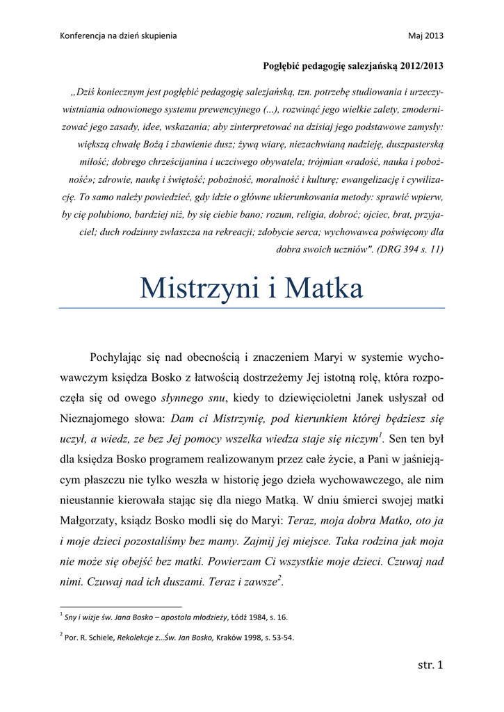 Konferencja na dzień skupienia Maj 2013 Pogłębić pedagogię salezjańską 2012/2013 „Dziś koniecznym jest pogłębić pedagogię salezjańską, tzn. potrzebę studiowania i urzeczywistniania odnowionego systemu prewencyjnego (...), rozwinąć jego wielkie zalety, zmodernizować jego zasady, idee, wskazania; aby zinterpretować na dzisiaj jego podstawowe zamysły: większą chwałę Bożą i zbawienie dusz; żywą wiarę, niezachwianą nadzieję, duszpasterską miłość; dobrego chrześcijanina i uczciwego obywatela; trójmian «radość, nauka i pobożność»; zdrowie, naukę i świętość; pobożność, moralność i kulturę; ewangelizację i cywilizację. To samo należy powiedzieć, gdy idzie o główne ukierunkowania metody: sprawić wpierw, by cię polubiono, bardziej niż, by się ciebie bano; rozum, religia, dobroć; ojciec, brat, przyjaciel; duch rodzinny zwłaszcza na rekreacji; zdobycie serca; wychowawca poświęcony dla dobra swoich uczniów". (DRG 394 s. 11) Mistrzyni i Matka Pochylając się nad obecnością i znaczeniem Maryi w systemie wychowawczym księdza Bosko z łatwością dostrzeżemy Jej istotną rolę, która rozpoczęła się od owego słynnego snu, kiedy to dziewięcioletni Janek usłyszał od Nieznajomego słowa: Dam ci Mistrzynię, pod kierunkiem której będziesz się uczył, a wiedz, ze bez Jej pomocy wszelka wiedza staje się niczym1. Sen ten był dla księdza Bosko programem realizowanym przez całe życie, a Pani w jaśniejącym płaszczu nie tylko weszła w historię jego dzieła wychowawczego, ale nim nieustannie kierowała stając się dla niego Matką. W dniu śmierci swojej matki Małgorzaty, ksiądz Bosko modli się do Maryi: Teraz, moja dobra Matko, oto ja i moje dzieci pozostaliśmy bez mamy. Zajmij jej miejsce. Taka rodzina jak moja nie może się obejść bez matki. Powierzam Ci wszystkie moje dzieci. Czuwaj nad nimi. Czuwaj nad ich duszami. Teraz i zawsze2. 1 Sny i wizje św. Jana Bosko – apostoła młodzieży, Łódź 1984, s. 16. 2 Por. R. Schiele, Rekolekcje z…Św. Jan Bosko, Kraków 1998, s. 53-54. str. 1 Konferencja na dzień skupienia Maj 2013 Papież Jana Pawła II, w liście z okazji setnej rocznicy śmierci tego wielkiego wychowawcy, nazwał księdza Bosko Ojcem i nauczycielem młodzieży3. Ojciec i nauczyciel prowadzony przez Maryję, która była dla niego i całego dzieła wychowawczego Matką i Mistrzynią. Tak oto uzupełnia się wspaniałe dzieło wychowania, które przecież ma swoje źródło w rodzinie gdzie rodzice, ojciec i matka, stają się dla swoich dzieci pierwszymi i najważniejszymi wychowawcami wspomagając je w stawaniu się dorosłymi. Macierzyństwo i ojcostwo niemal narzucają nowy sposób zachowania, nowy styl życia młodym ludziom, gdy tylko znajdą się wobec ich nowonarodzonego dziecka. Tak, więc podstawową formą wychowania jest życie rodzinne. Dlatego w pedagogice tak ważnym jest akcentowanie wartości rodziny i relacji wychowawczych, jakie powstają między dzieckiem a rodzicami. Wydaje się, że ks. Bosko stając się ojcem dla swoich chłopców i obierając Maryję za Matkę salezjańskiego dzieła wychowawczego, profetycznie prowadzony przez Ducha Świętego trafił w najbardziej newralgiczny punkt wychowania - zaspokojenie braku miłości rodzicielskiej, na którą to „chorobę” cierpiało wielu współczesnych mu młodych ludzi. Tym gestem zawierzenia Maryi, wypełnił słowa Chrystusa wypowiedziane na Krzyżu: Niewiasto, oto syn Twój. Synu, oto Matka twoja. Ksiądz Bosko wykorzystał ofiarowany mu przez Boga dar w postaci Mistrzyni, pod kierownictwem której nauczył się mądrości4. Ona dla niego i chłopców z oratorium na Valdocco pełniła rolę „matki i mistrzyni”, była wzorem do naśladowania oraz przewodniczką po trudnych drogach życia. A przecież i dzisiaj, mówiąc o trudnościach w wychowaniu dzieci i młodzieży, wielokrotnie podkreśla się, że jedną z przyczyn tego stanu rzeczy jest 3 Por. Jan Paweł II, List Ojca Świętego Jana Pawła II do ksiedza Egidio Vigano Przełożonego Generalnego Towarzystwa św. Franciszka Walezego w setną rocznicę śmierci św. Jana Bosco, Rzym 1988. 4 G.B. Lemoyne, A. Amadei, E. Ceria, Memorie biografiche di Don giovanni Bosco, San Benigno – Turyn 18981948 T. 1, s. 27 (MB I, 27). str. 2 Konferencja na dzień skupienia Maj 2013 niedostatek rodzicielskiej miłości oraz brak mistrzów i mistrzyń, którzy byliby dla młodego pokolenia wzorem i ideałem godnym do naśladowania. W życiu księdza Bosko to Maryja wskazuje mu, jako małemu chłopcu we wspomnianym już śnie - ubogich, opuszczonych i znajdujących się w niebezpieczeństwie chłopców, którzy mają się stać szczególnym polem jego pracy jako kapłana. To Ona wskaże dobroć jako metodę wychowania zdolną przemienić dzikie zwierzęta w łagodne owieczki. System wychowawczy księdza Bosko, to „szkoła Maryi” w której jest Ona Matką i Mistrzynią. W tej szkole, niepozbawionej dyscypliny, ale przepełnionej również bezwarunkową „macierzyńską miłością” względem najbardziej potrzebujących - wystarczy, że jesteście młodzi abym was kochał - wyzwalane są najlepsze energie obecne w sercu każdego młodego człowieka5. Ogłoszenie w roku 1954 dogmatu o Niepokalanym Poczęciu Maryi, staje się dla księdza Bosko kolejnym impulsem do ukazania Maryi jako godnego do naśladowania symbolu czystości i świętości, co zaowocowało wkrótce powstaniem, zainicjowanego przez Dominika Savio Towarzystwa Niepokalanej, którego celem było szerzenie kultu Maryi i naśladowanie Jej cnót: dla Niej, pokonamy wszystkie przeszkody, będziemy wytrwali w naszych postanowieniach, surowi dla siebie samych, uprzejmi dla bliźniego i we wszystkim bez zarzutu…6. Jakże symboliczny jest również moment spotkania z Bartłomiejem Garelli w dniu 8 grudnia 1841 roku, uważany za początek dzieła salezjańskiego, w którym to dniu każdego roku obchodzimy Uroczysto